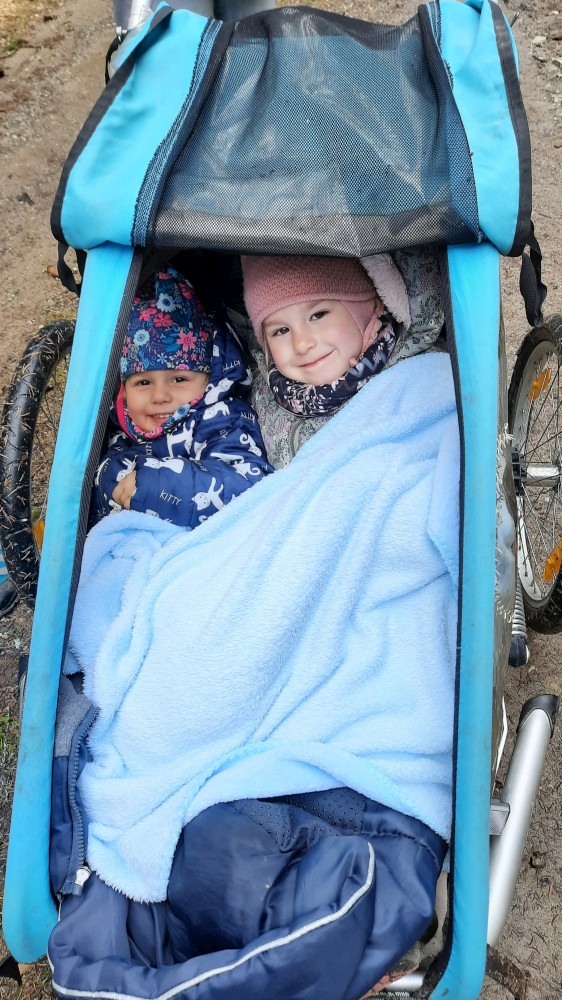 Cesta v lese končí, musíme jít kus přes louky a pastviny. S vozíkem celkem makačka. Napojujeme se zase na cestu a za chvíli jsme v osadě Zahrádky kousek na kempem na Teplé Vltavě. Jdeme do Borové Lady kousek po silnici přes křížovou cestu.