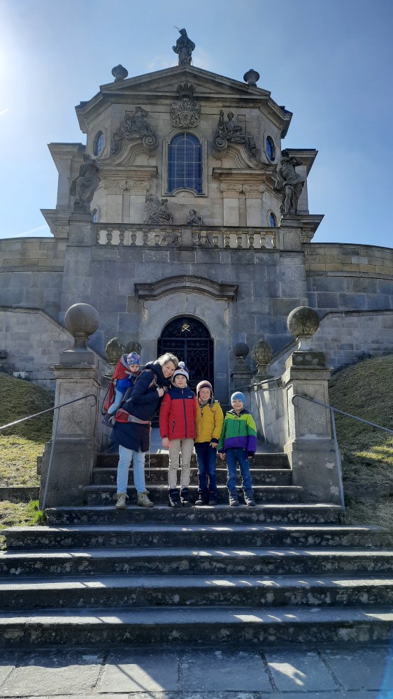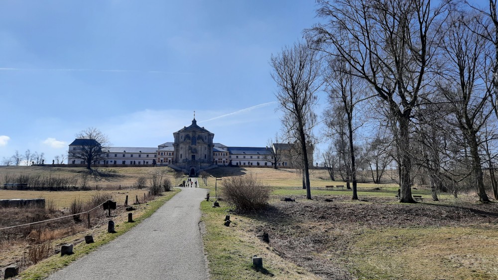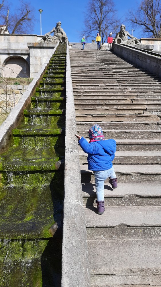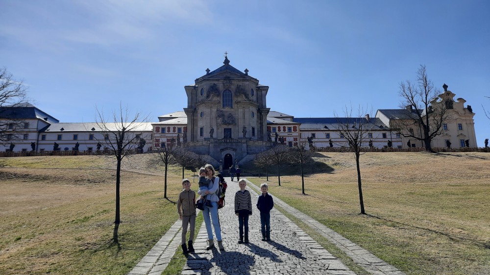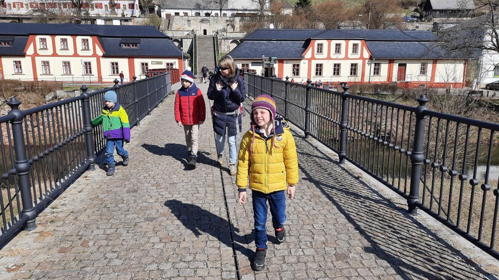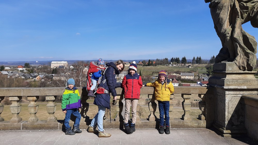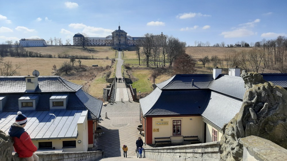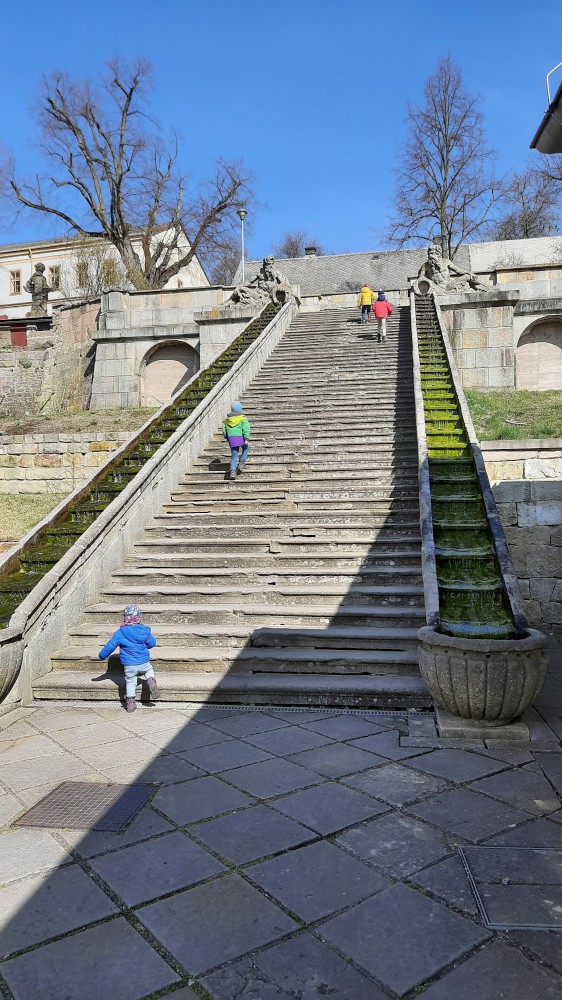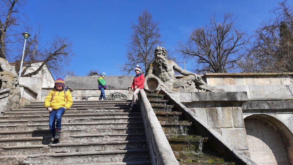Vracíme se z Krkonoš a zastavujeme na prohlídku Hospitalu Kuks. Interiéry jsou zatím zavřené, otevírají až příští týden, prozkoumáme Kuks tedy jen zvenku. Parkujeme ve vesničce Kuks přímo u Labe. Děti si hrají u studánky Kuks, což jsou vlastně schody, které mají místo zábradlí tekoucí potůčky po obou stranách. Je odtud krásný výhled na Hospital ležící na protejším kopci.