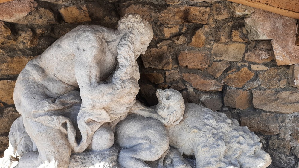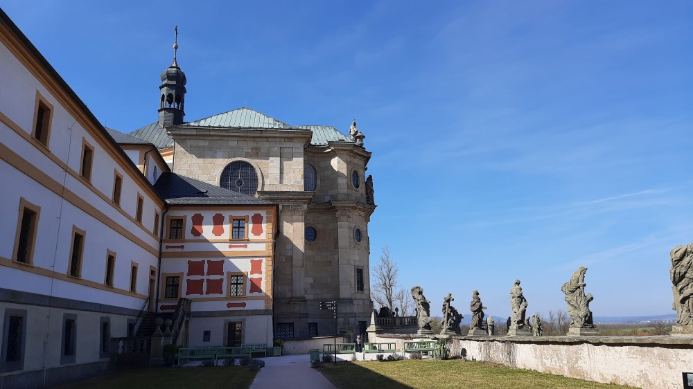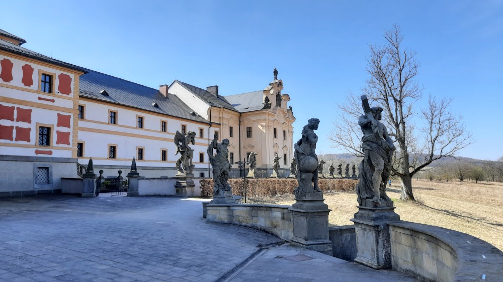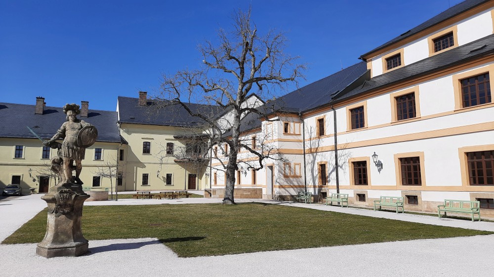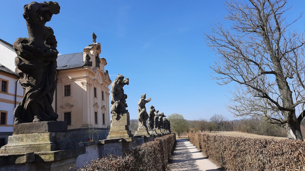 Vyrážíme přes most k němu. Hospital obcházíme zprava kolem souboru alegorických soch ctností a neřestí od Matyáše Brauna. Procházíme do zahrady, které vévodí socha velkého Křesťanského bojovníka. Děti zde hrají na schovku. Nahlížíme na nádvoří se slunečními hodinami.