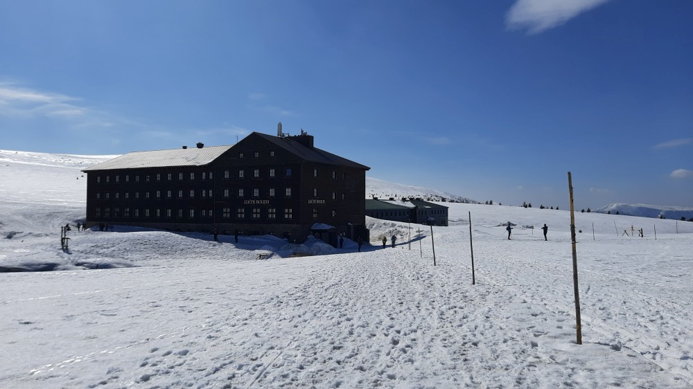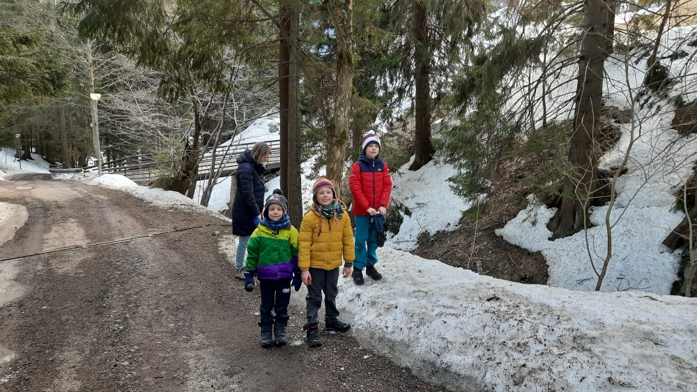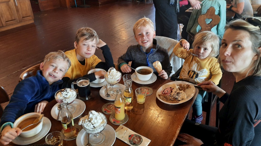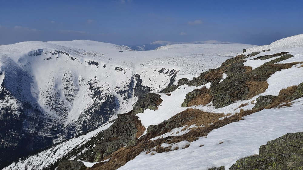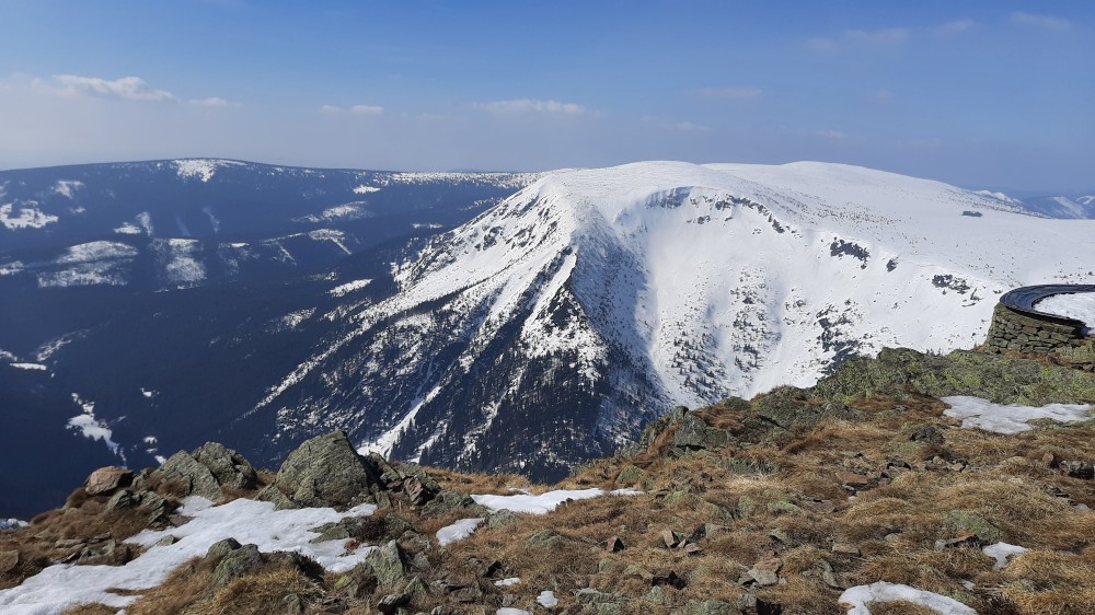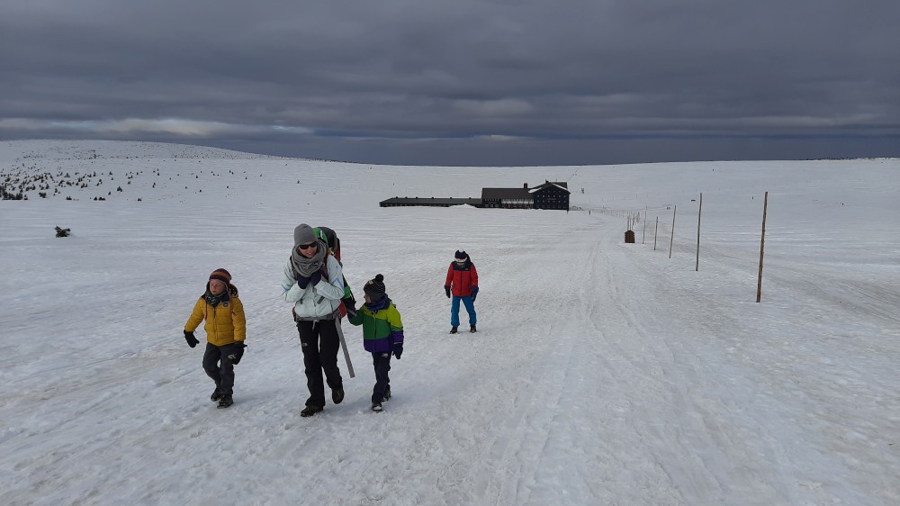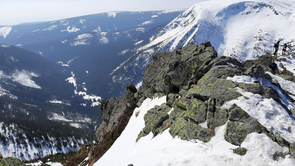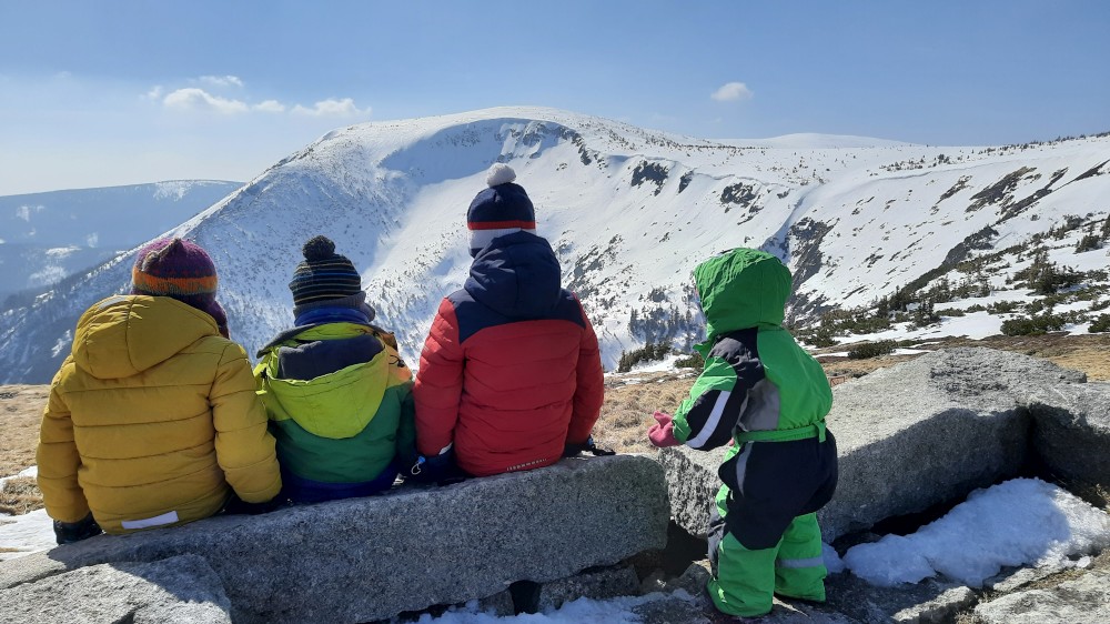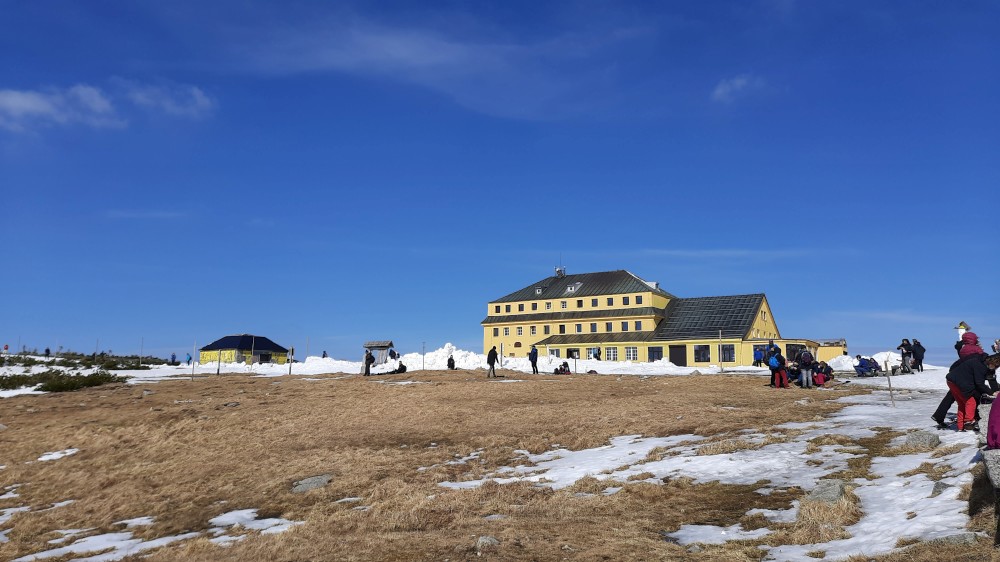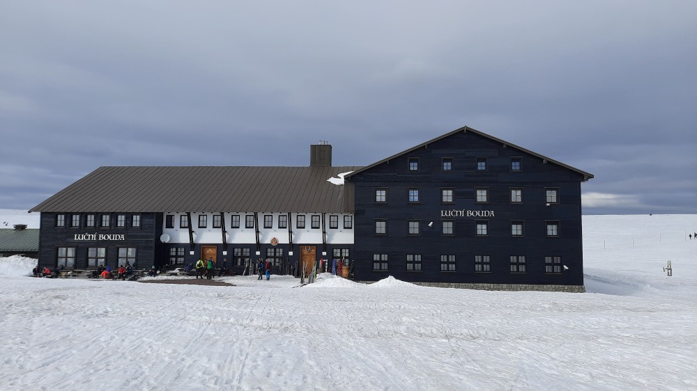 Na Luční boudě zastavujeme na pozdní oběd a slíbený zmrzlinový pohár. Pak stoupáme ke kapličce s památníkem obětí hor a následně klesáme až k Výrovce a pak dále k Richtrovým boudám. Železnou stezkou traverzujeme k červené turistické značce a po ní pokračujeme k lanovce a na boudu Máma.