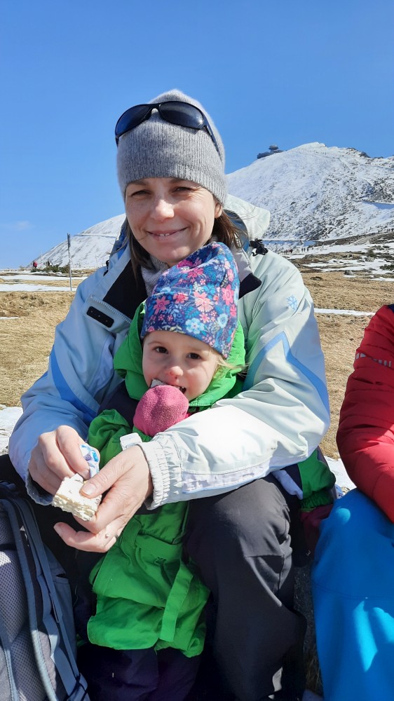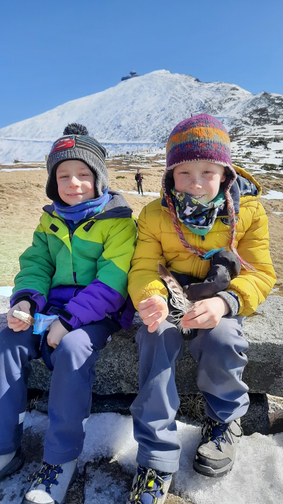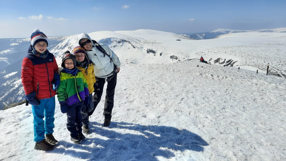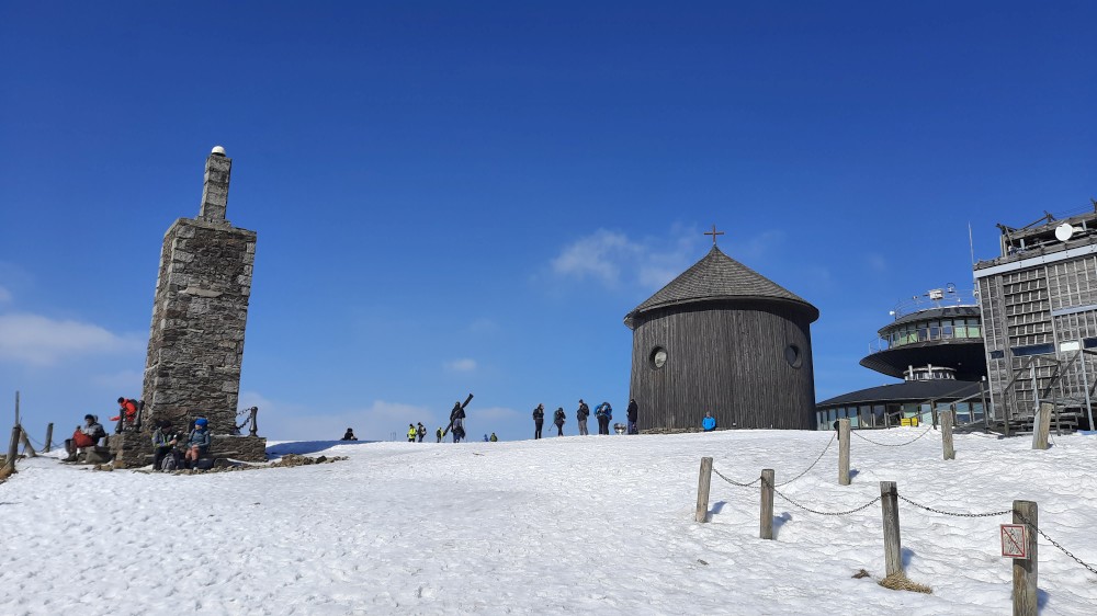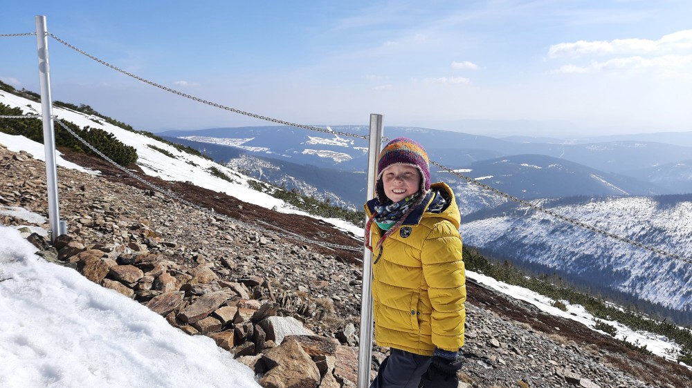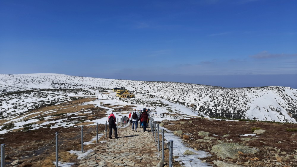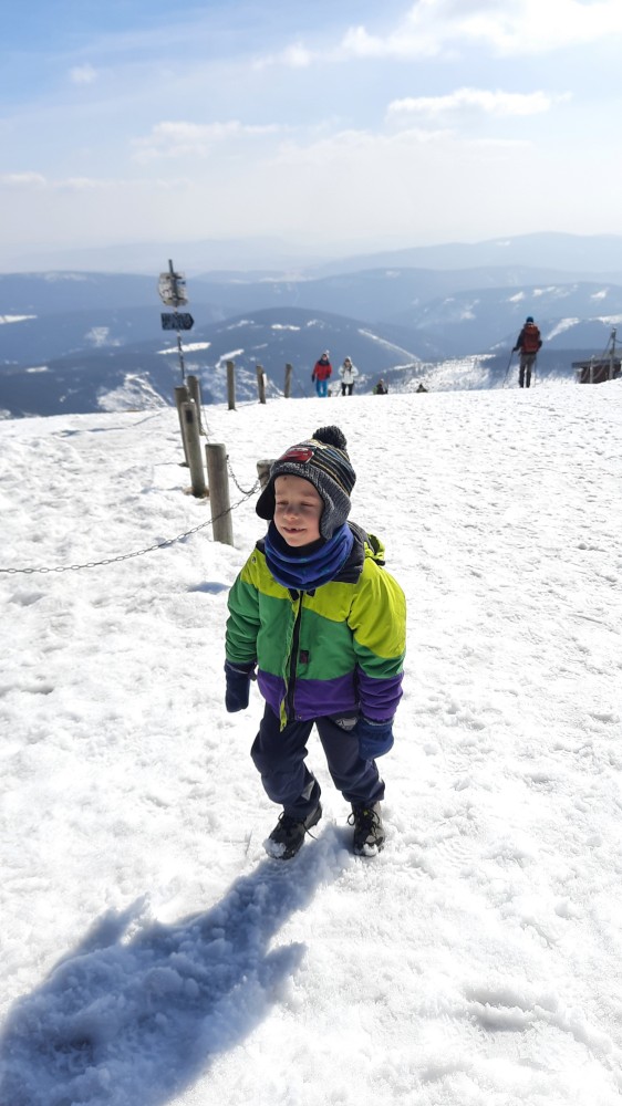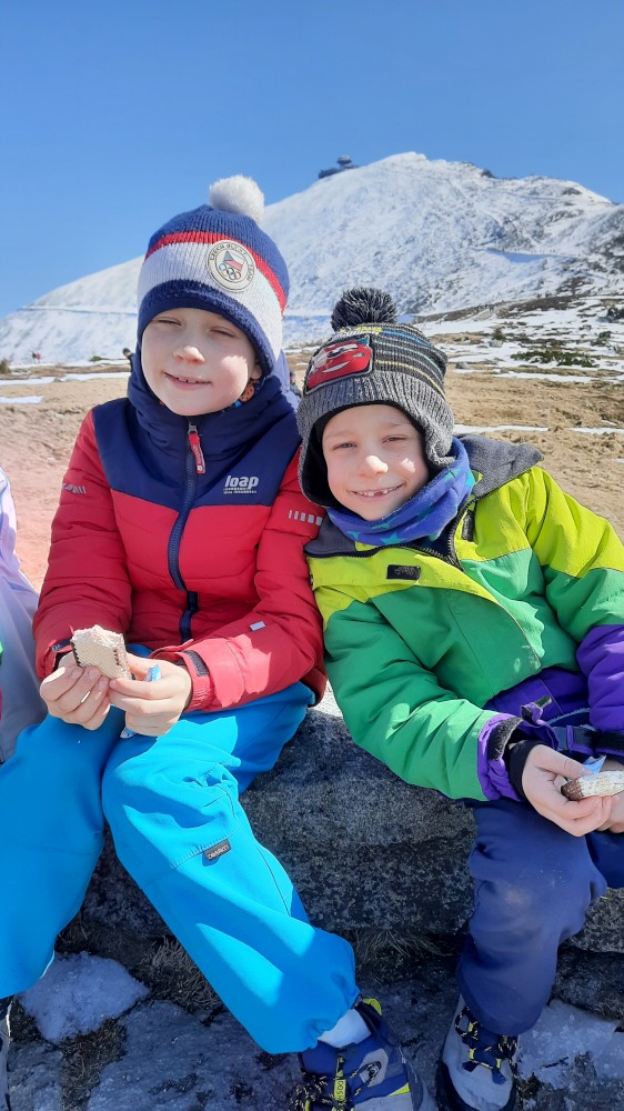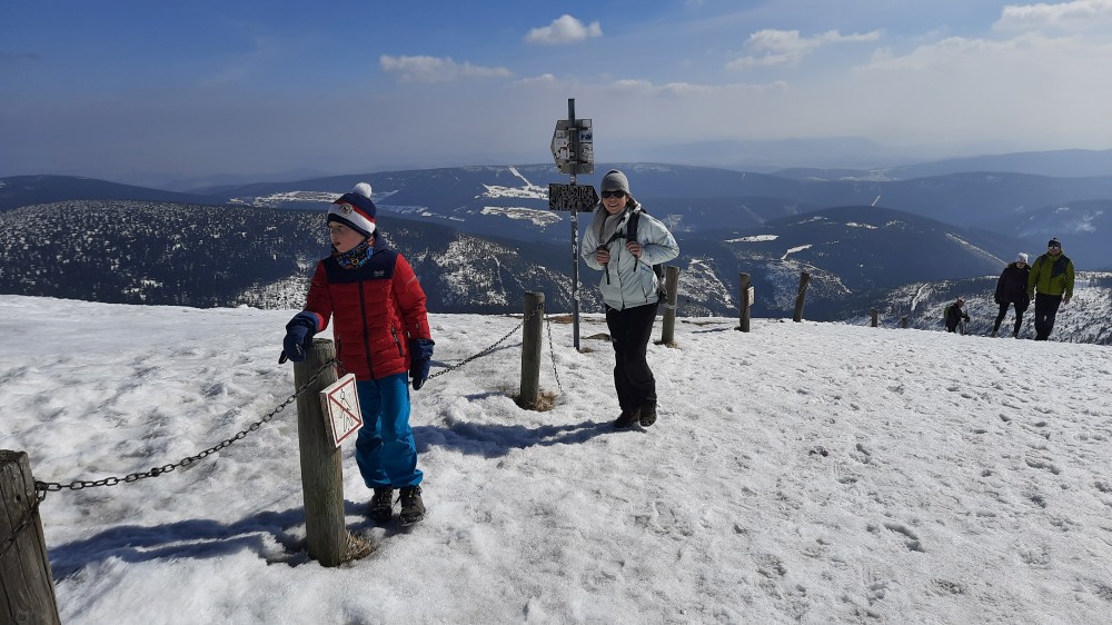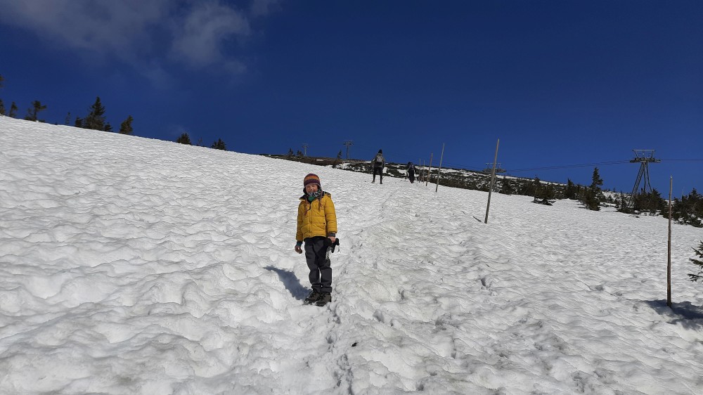 Už u lanovky zjišťujeme, že plán nebude naplněn. Lanovka nás kvůli větru vyveze jen na mezistanici a dále už musíme po svých. Nedá se nic dělat. Vystupujeme z lanovky a stoupáme na Sněžku. Jdeme pomalu, ale zvládáme do dobře. Za chvíli jsme na Sněžce.