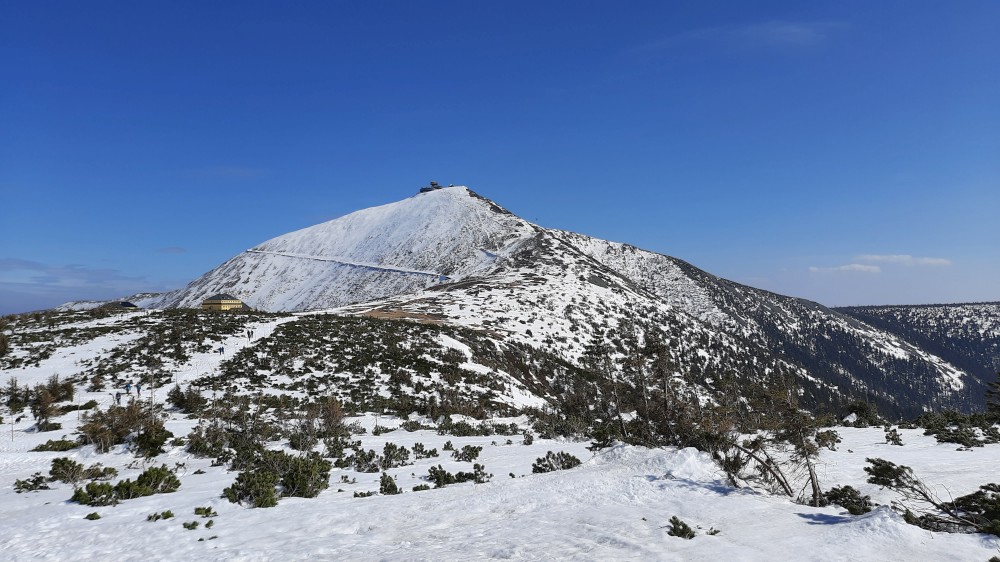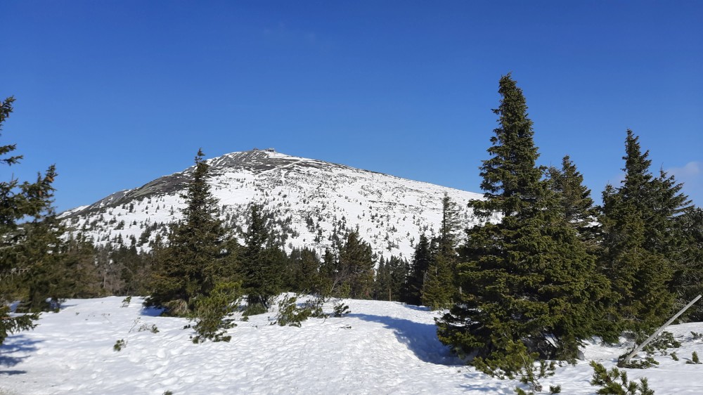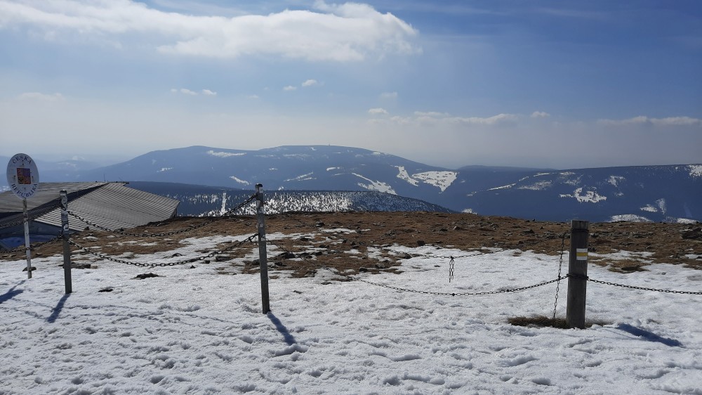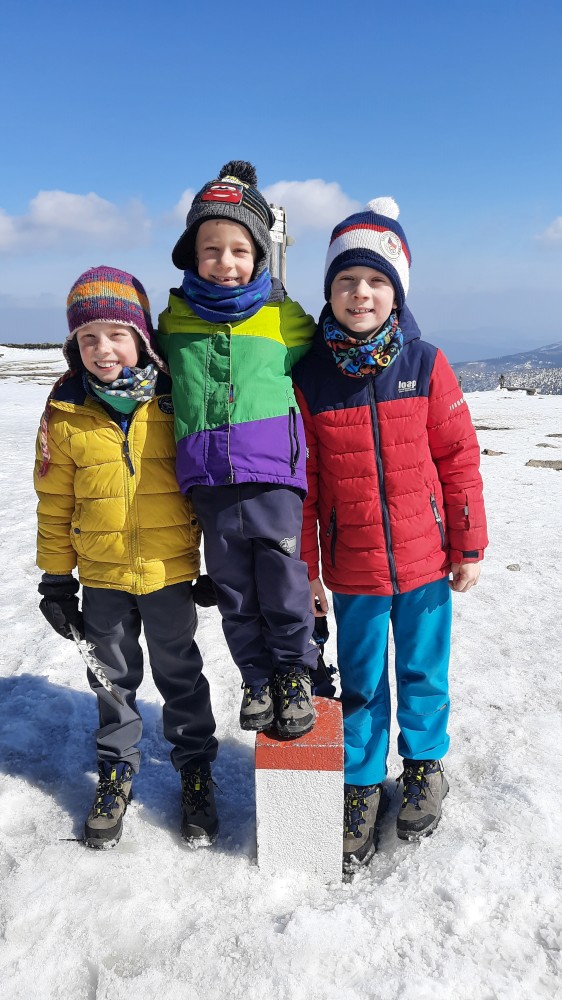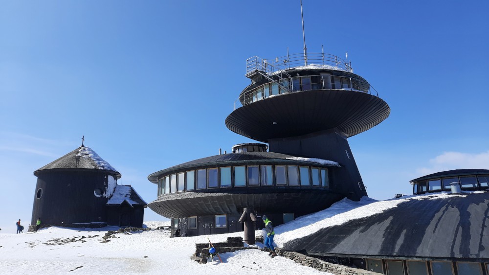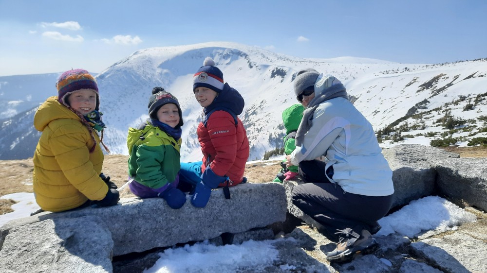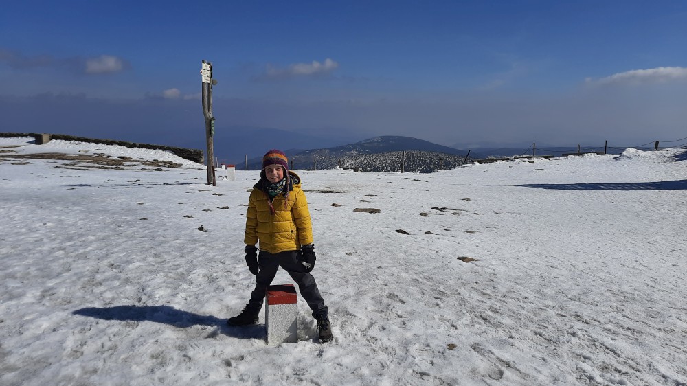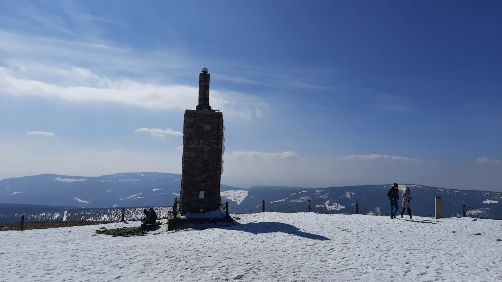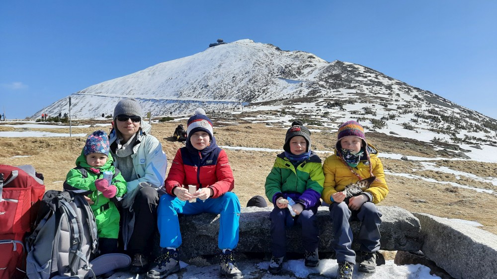 Už u lanovky zjišťujeme, že plán nebude naplněn. Lanovka nás kvůli větru vyveze jen na mezistanici a dále už musíme po svých. Nedá se nic dělat. Vystupujeme z lanovky a stoupáme na Sněžku. Jdeme pomalu, ale zvládáme do dobře. Za chvíli jsme na Sněžce.