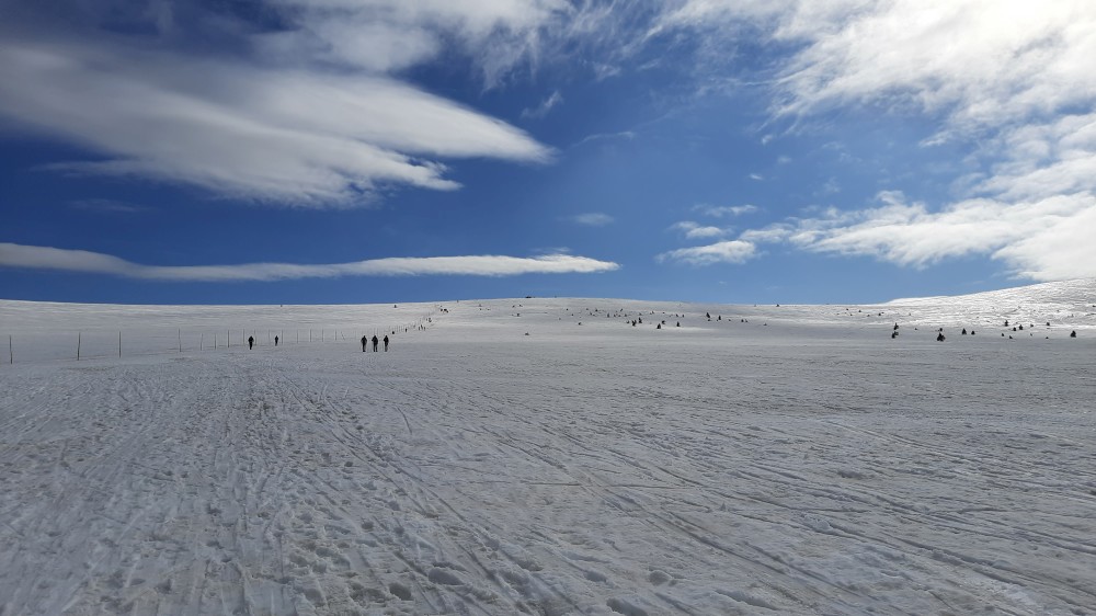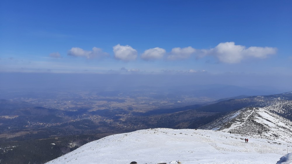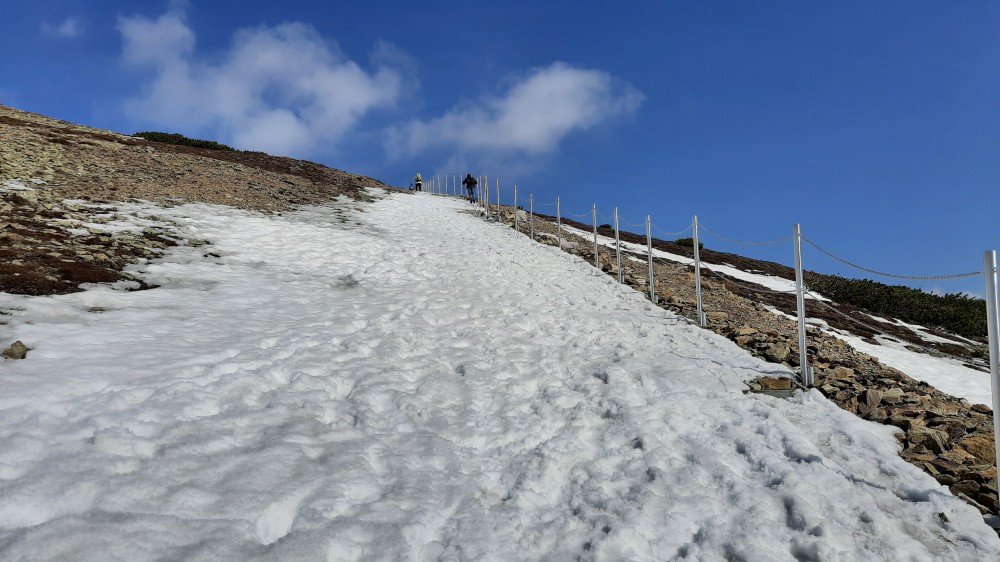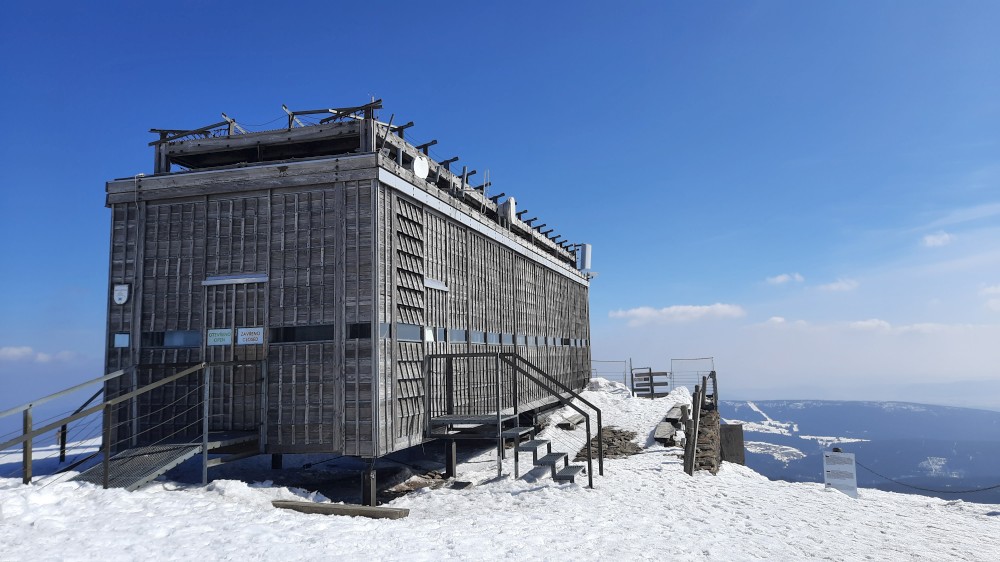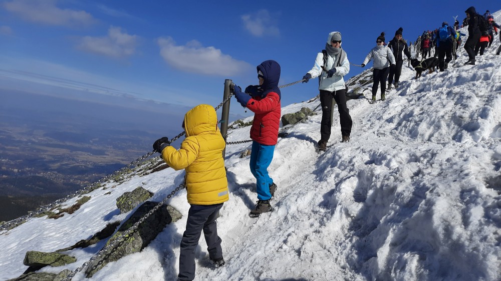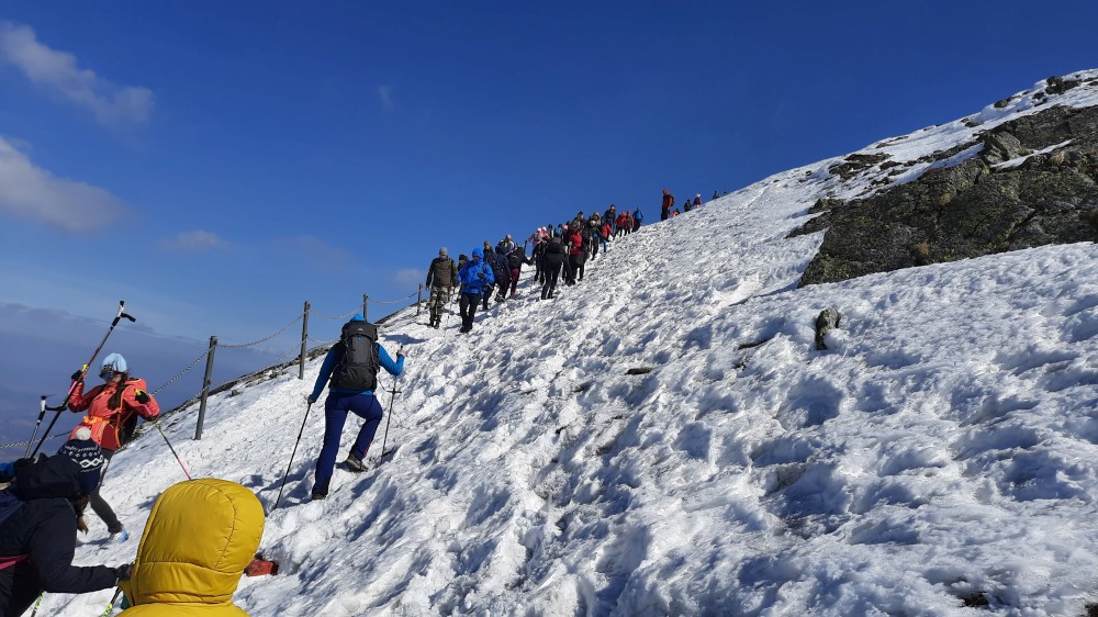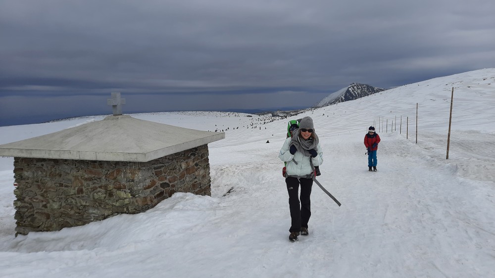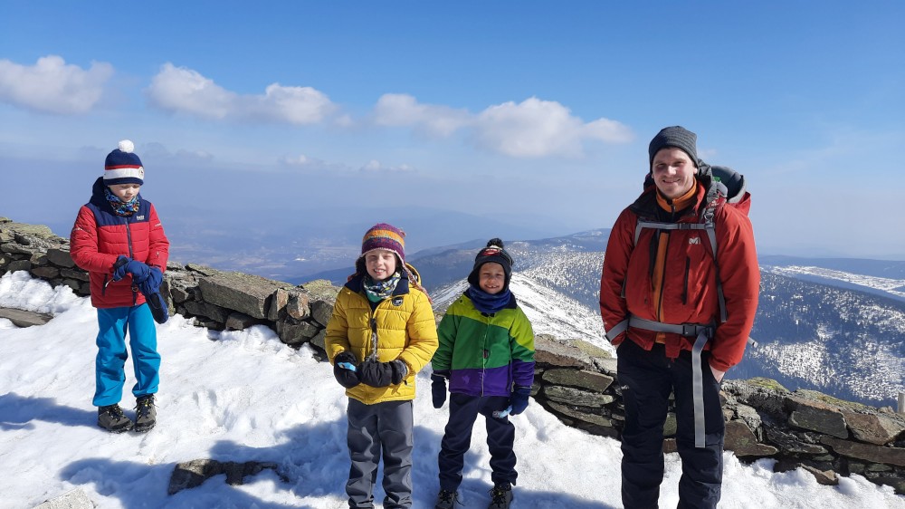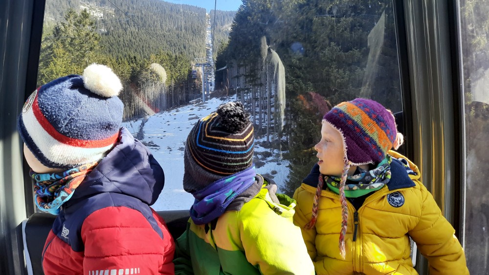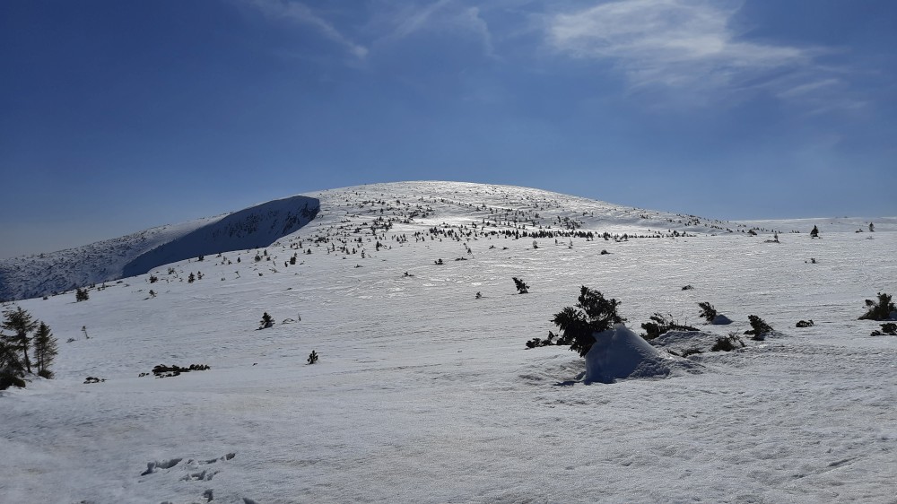Už u lanovky zjišťujeme, že plán nebude naplněn. Lanovka nás kvůli větru vyveze jen na mezistanici a dále už musíme po svých. Nedá se nic dělat. Vystupujeme z lanovky a stoupáme na Sněžku. Jdeme pomalu, ale zvládáme do dobře. Za chvíli jsme na Sněžce.