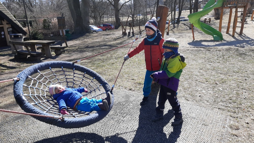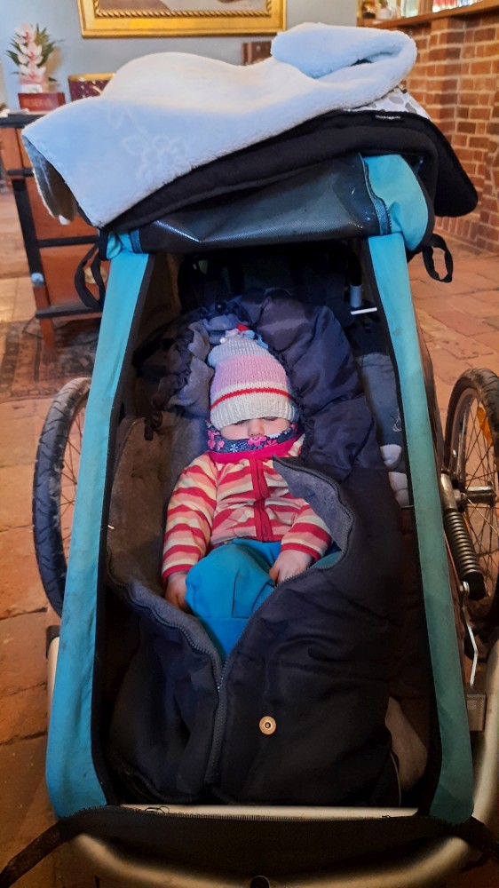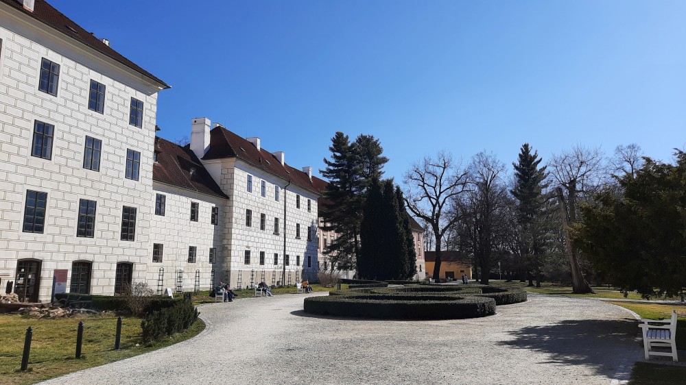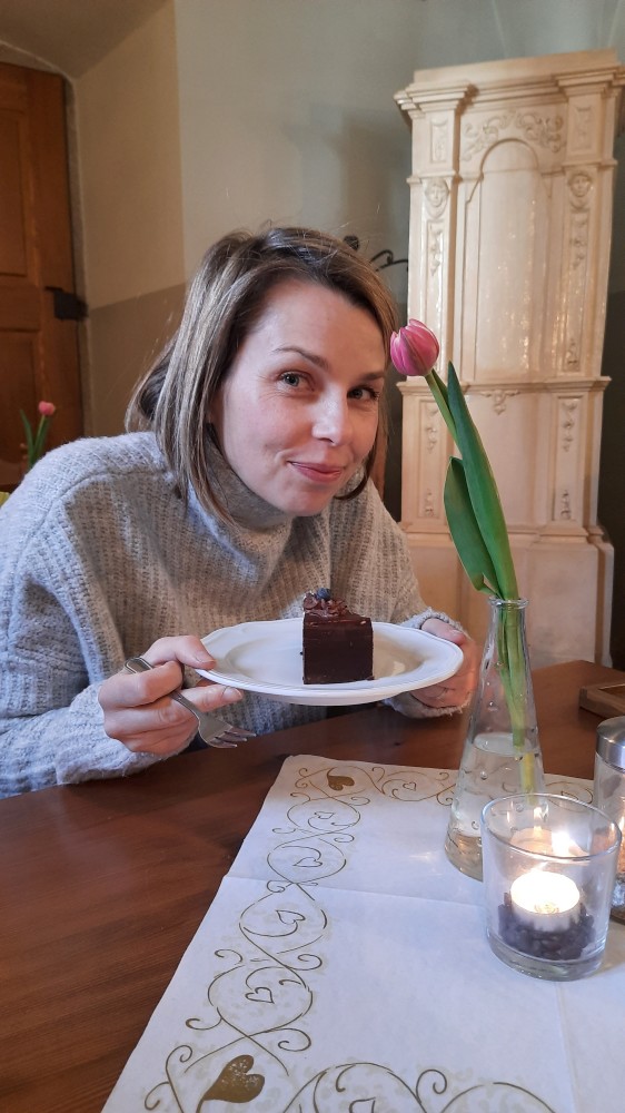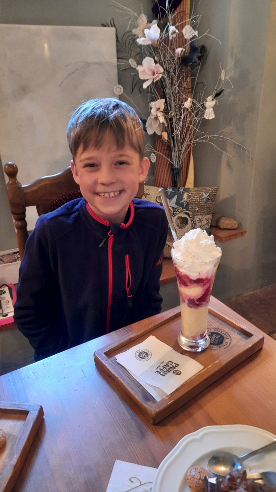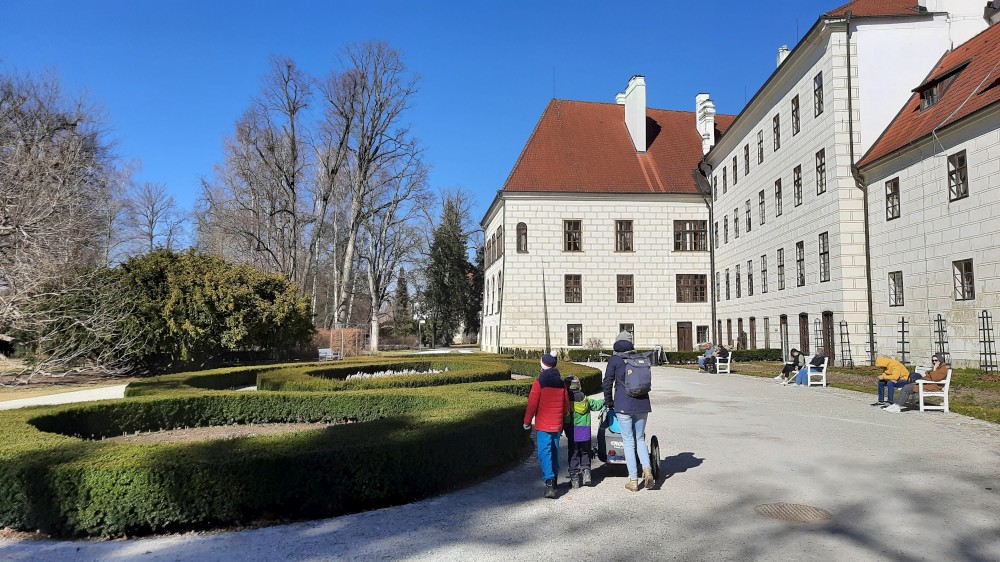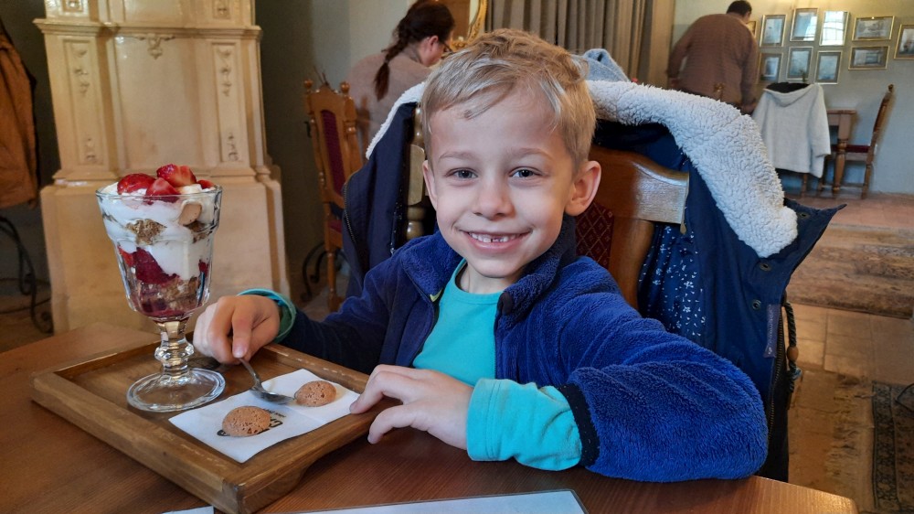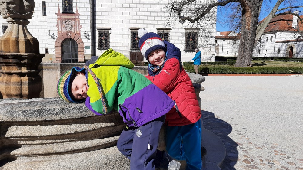 Na zámku je cukrárna, jdeme si dát kávu a něco dobrého. Kluci si dávají pohár, Douchovka zákusek. Moc příjemné posezení. Ještě se chvíli procházíme po Třeboni. Pak sedáme do auta a jedeme si vyzvednout toho našeho fotbalistu.
