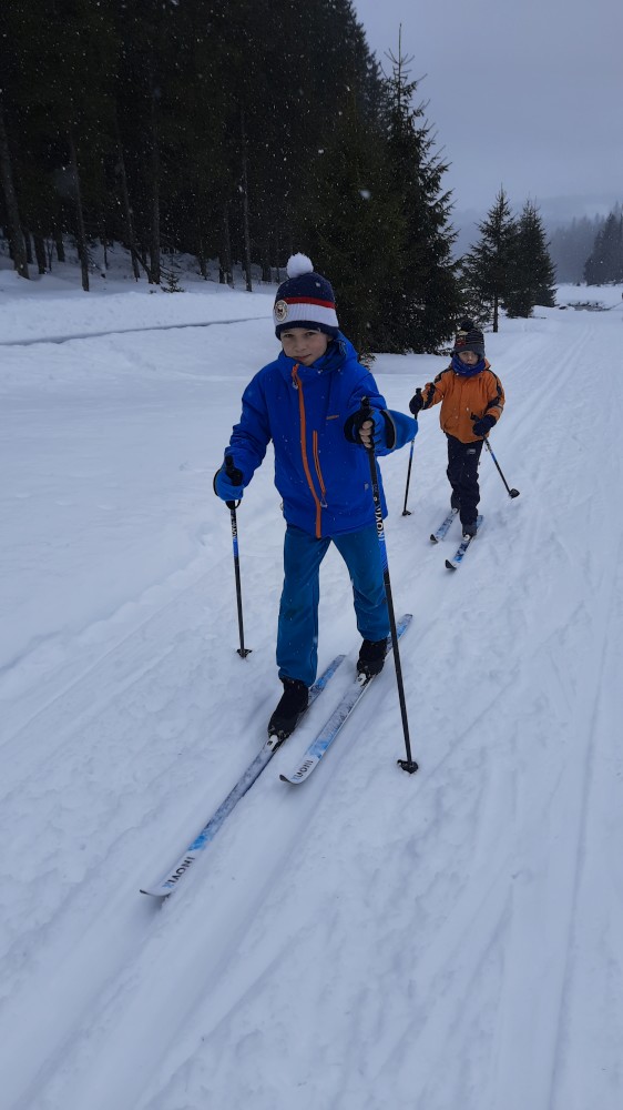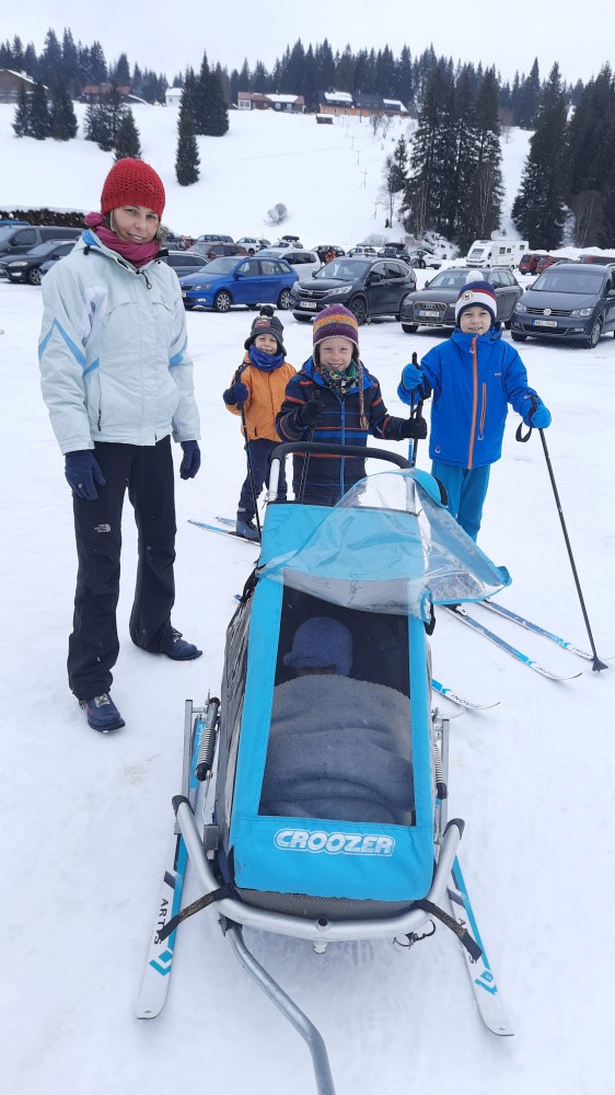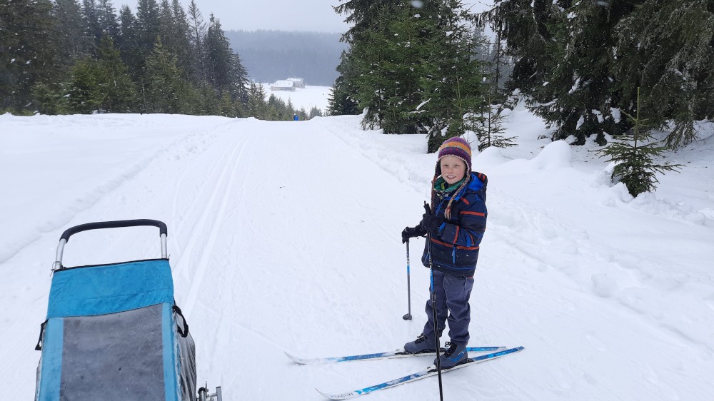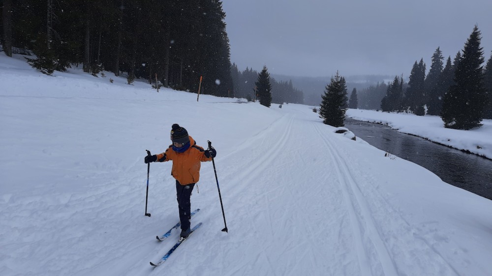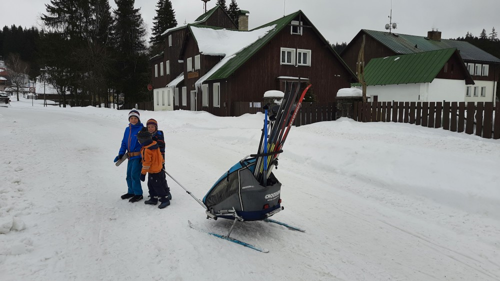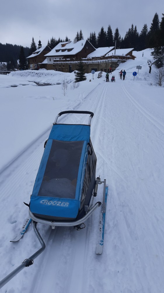 Jedeme celá rodina na běžky na Šumavu. Auto necháváme na Modravě a jdeme do stopy. Bětušku dáváme do vozíku, kluci jedou sami. Vyrážíme po Šumavské magistrále směr Rybárna. Moc daleko jsme nedojeli a Bětuška vyvádí, že nechce být ve vozíku. Chvíli ťape vedle stopy, chvíli ji vezu v náručí.