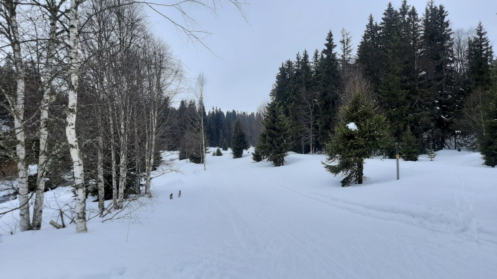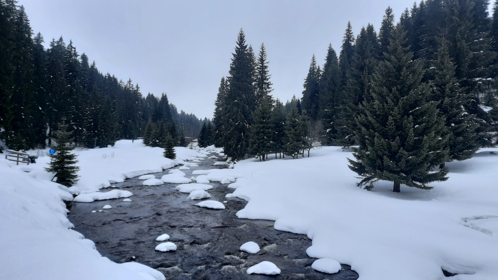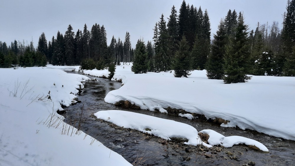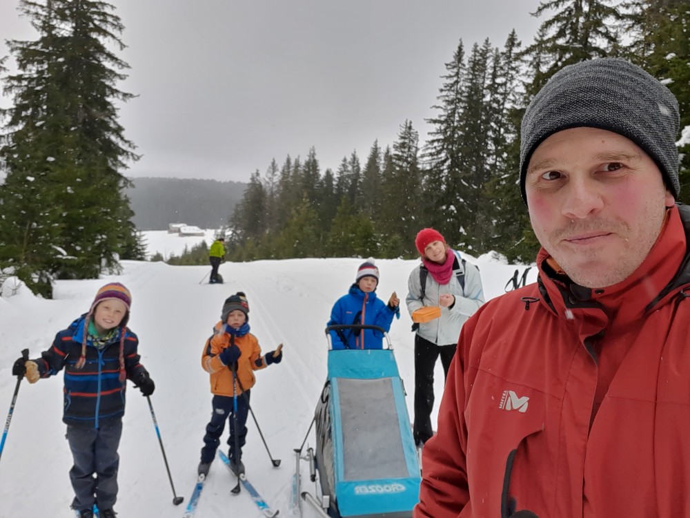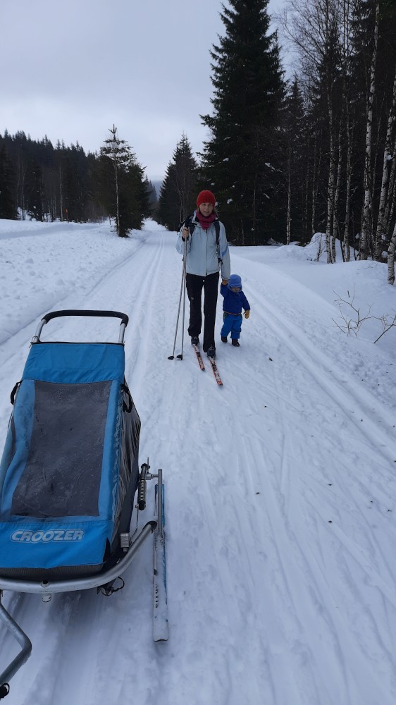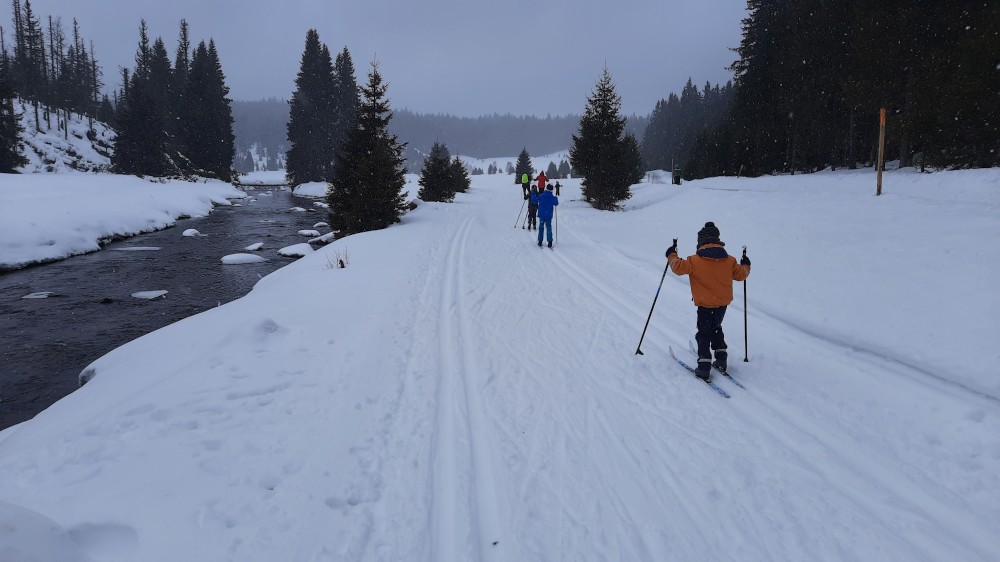 Jedeme celá rodina na běžky na Šumavu. Auto necháváme na Modravě a jdeme do stopy. Bětušku dáváme do vozíku, kluci jedou sami. Vyrážíme po Šumavské magistrále směr Rybárna. Moc daleko jsme nedojeli a Bětuška vyvádí, že nechce být ve vozíku. Chvíli ťape vedle stopy, chvíli ji vezu v náručí.