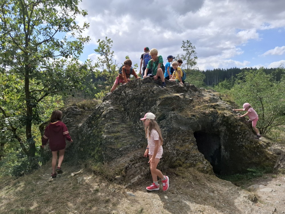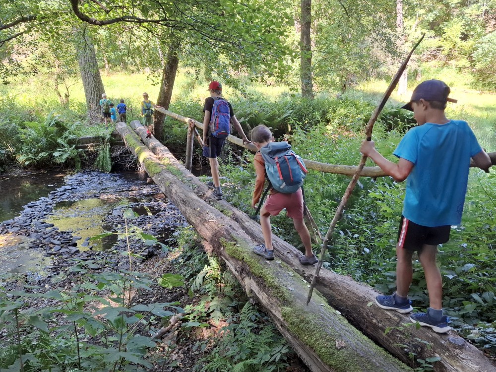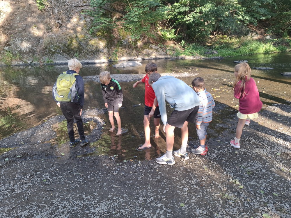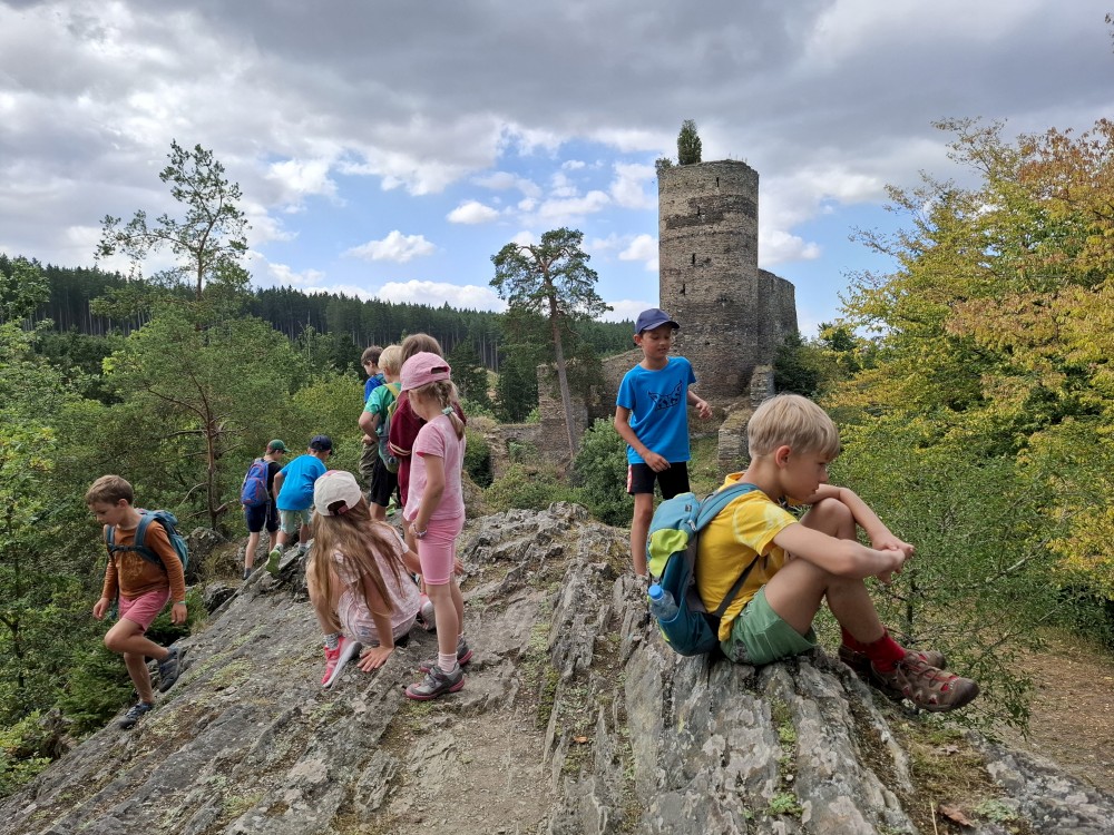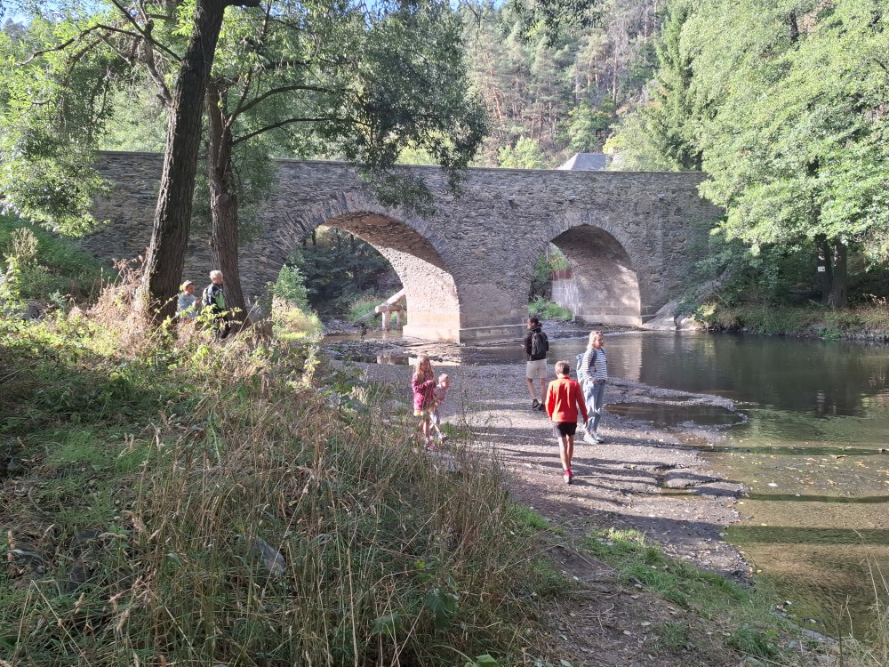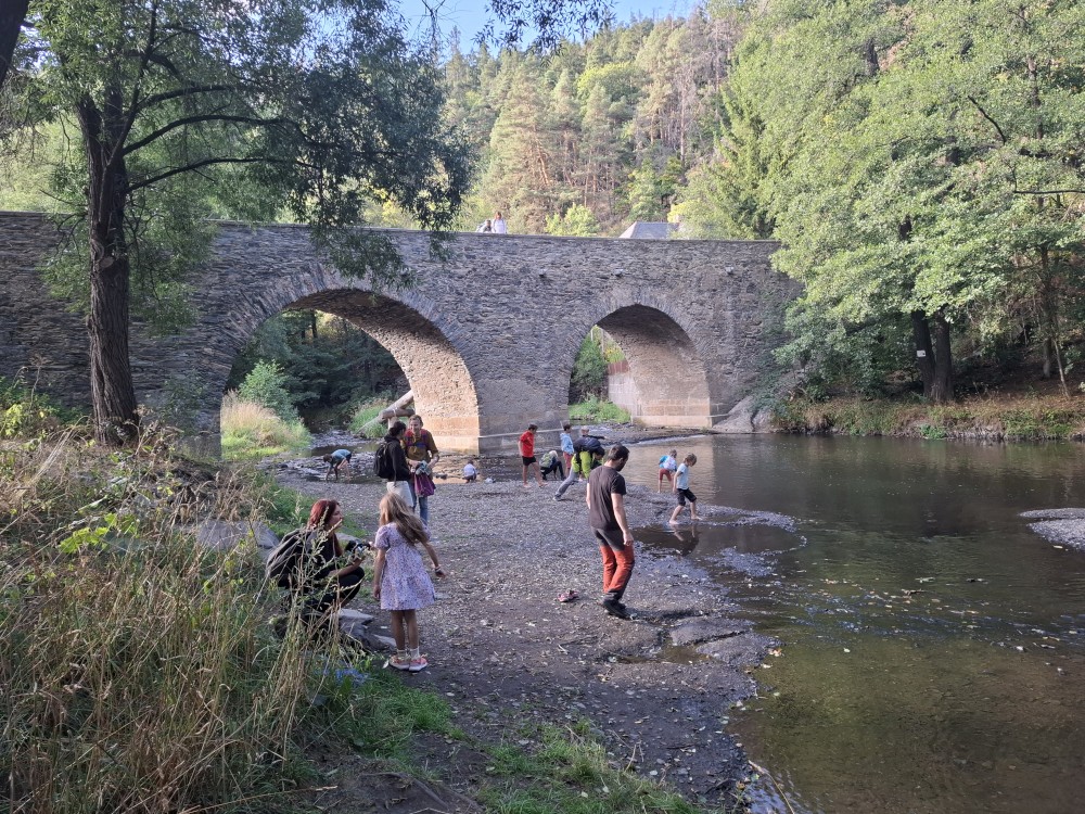 Pak pokračujeme k řece Střele, brouzdáme se ve vodě pod kamenným mostem, hážeme žabky. Pak už se do kopce vracíme zpět k autům, ještě se zastavíme na zřícenině hradu Sychrov a jedeme na mlýn.