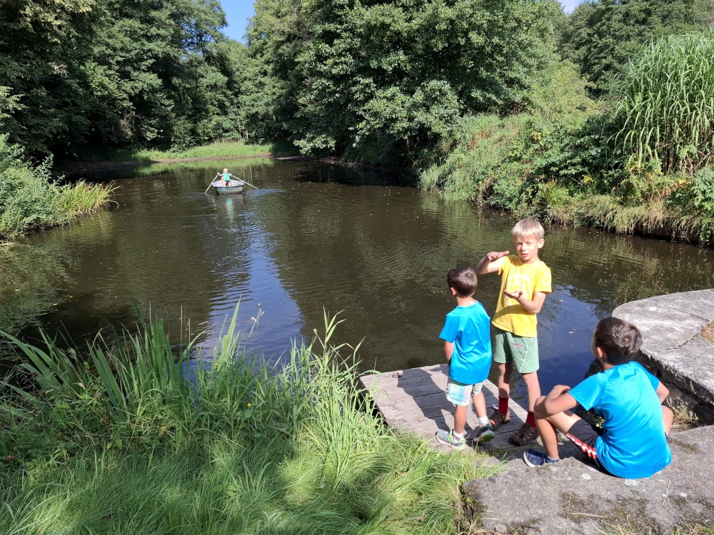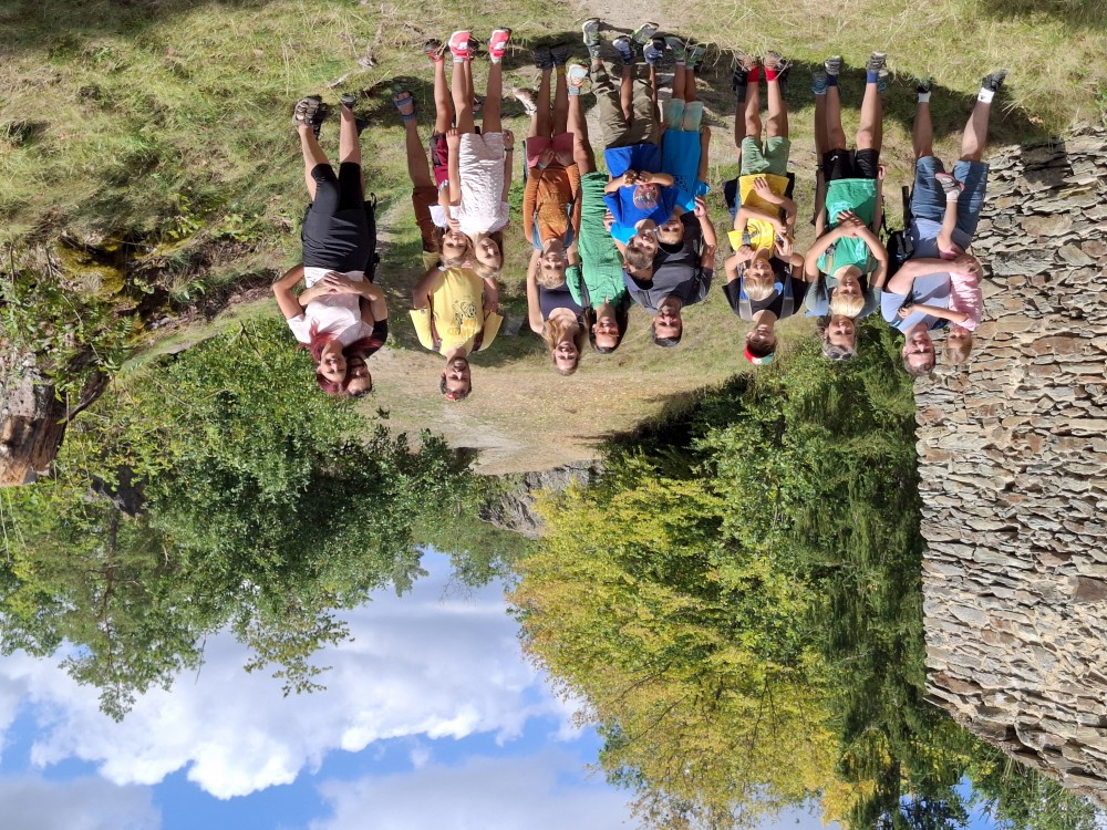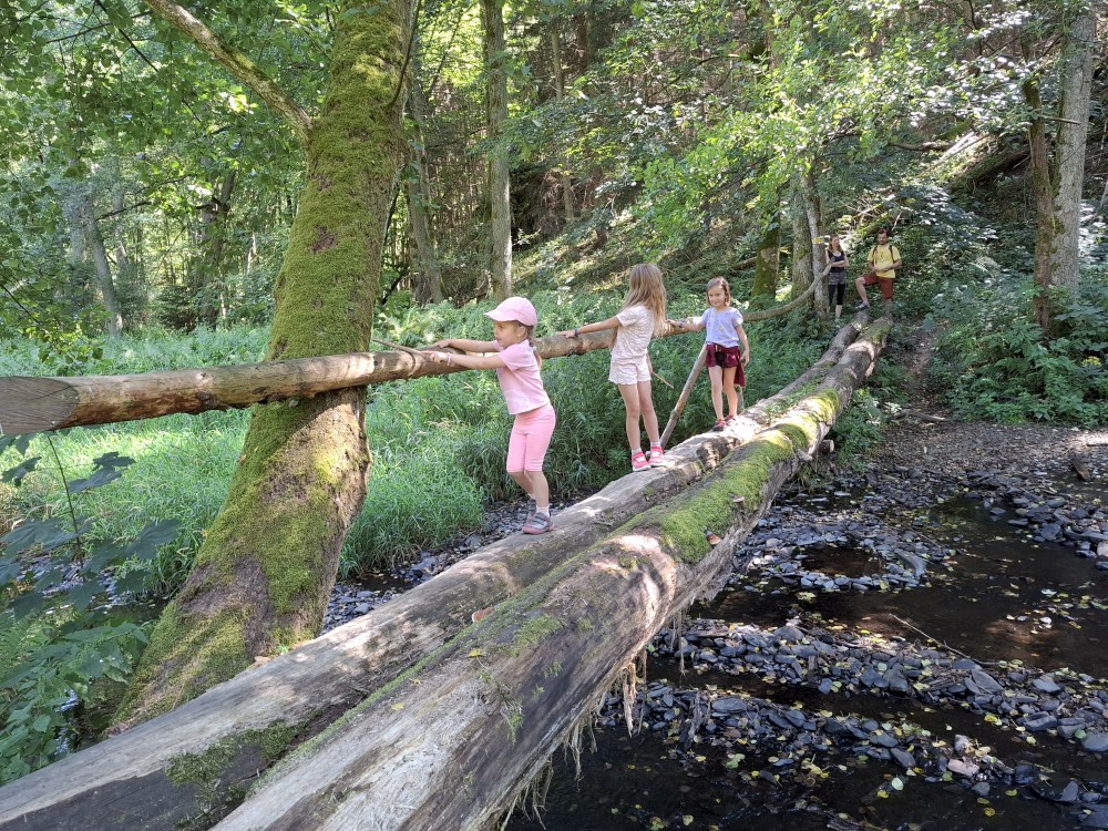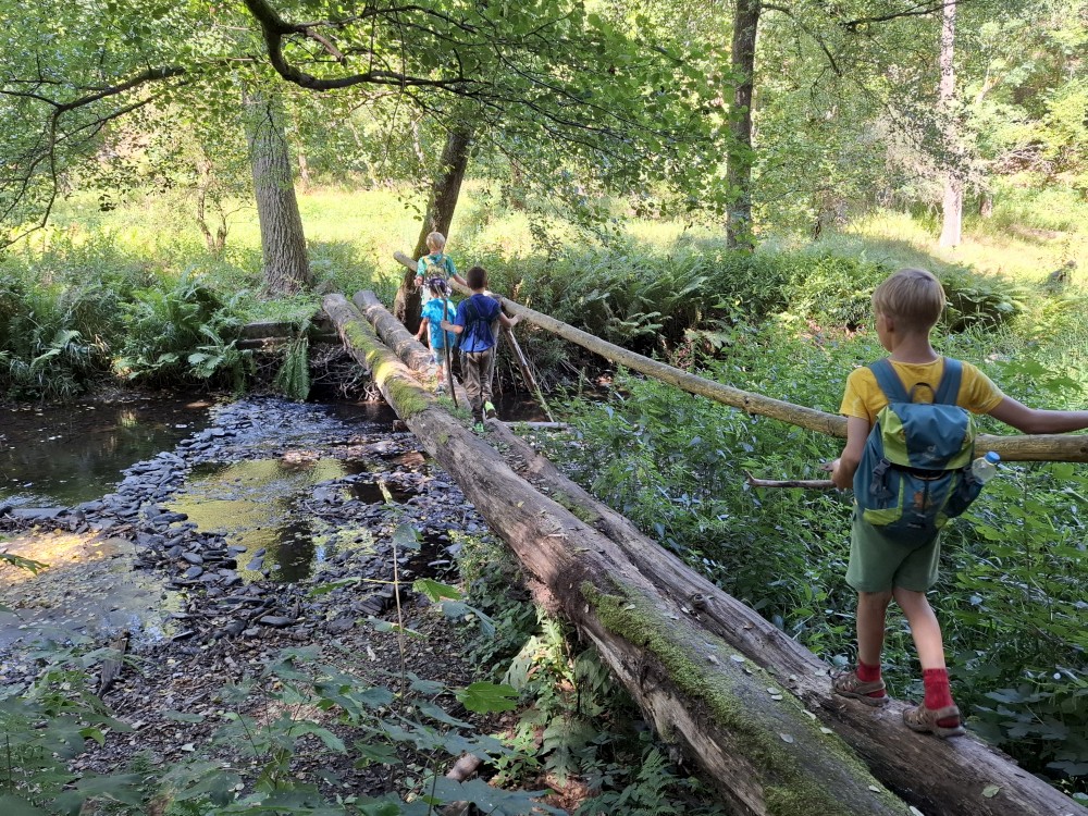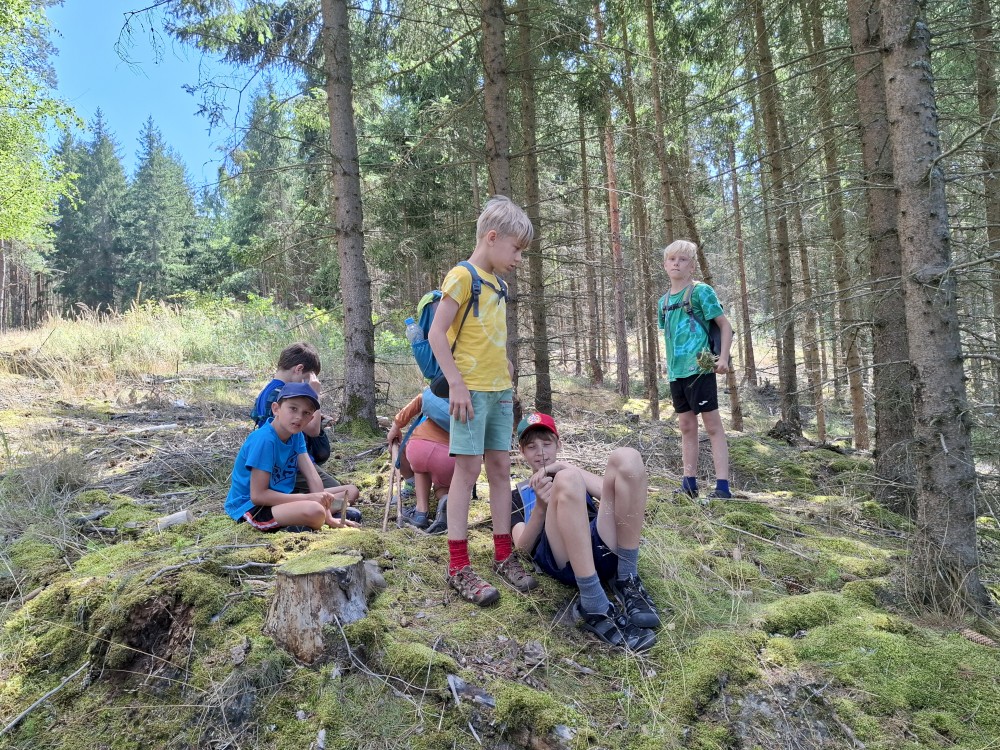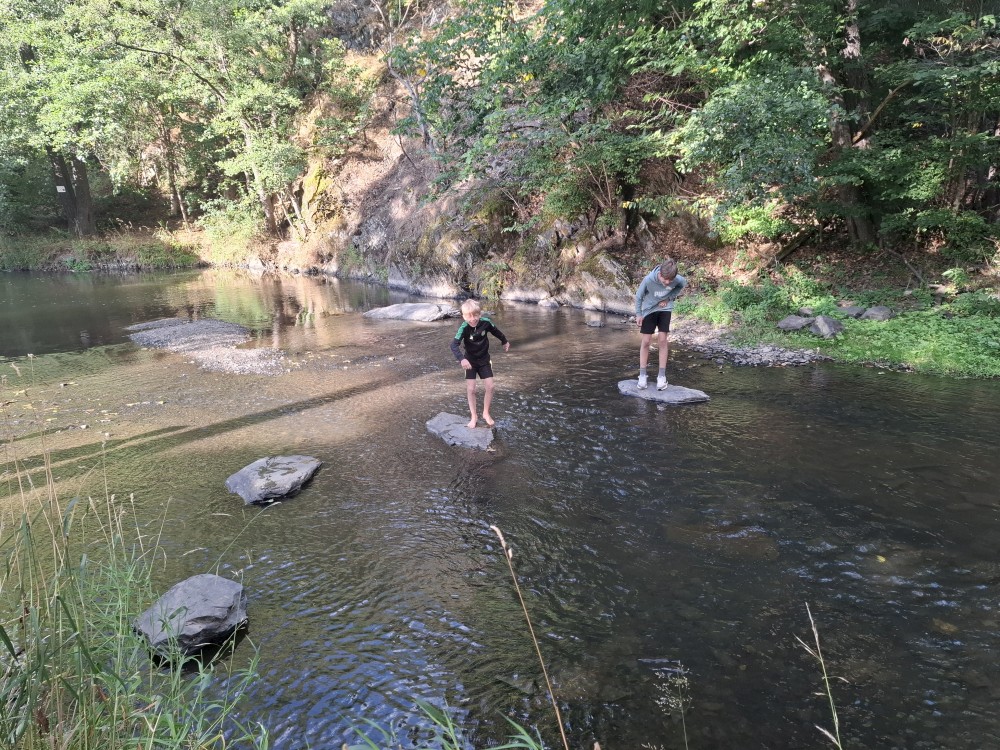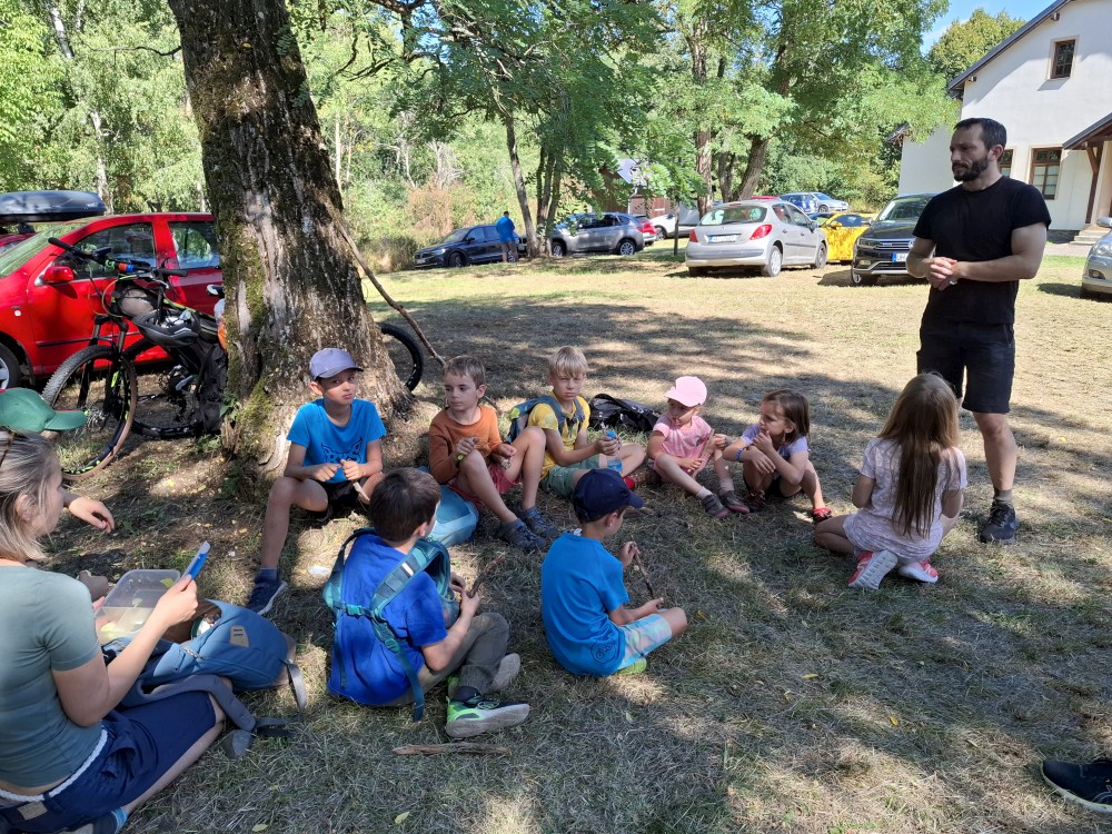 Pak pokračujeme k řece Střele, brouzdáme se ve vodě pod kamenným mostem, hážeme žabky. Pak už se do kopce vracíme zpět k autům, ještě se zastavíme na zřícenině hradu Sychrov a jedeme na mlýn.