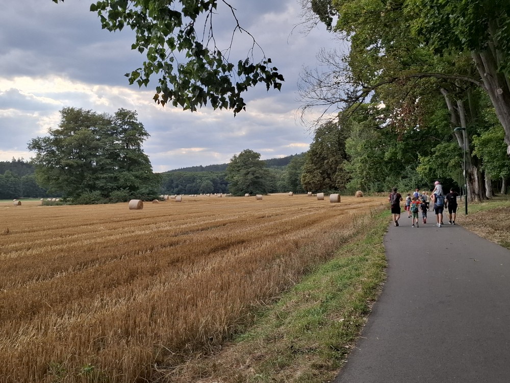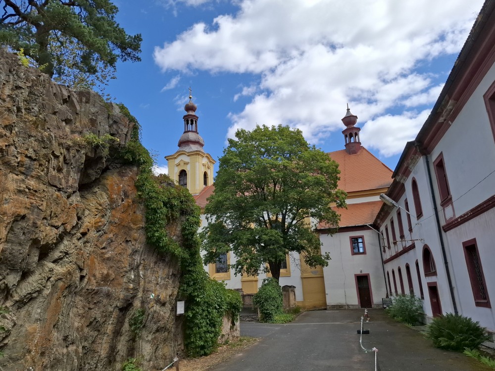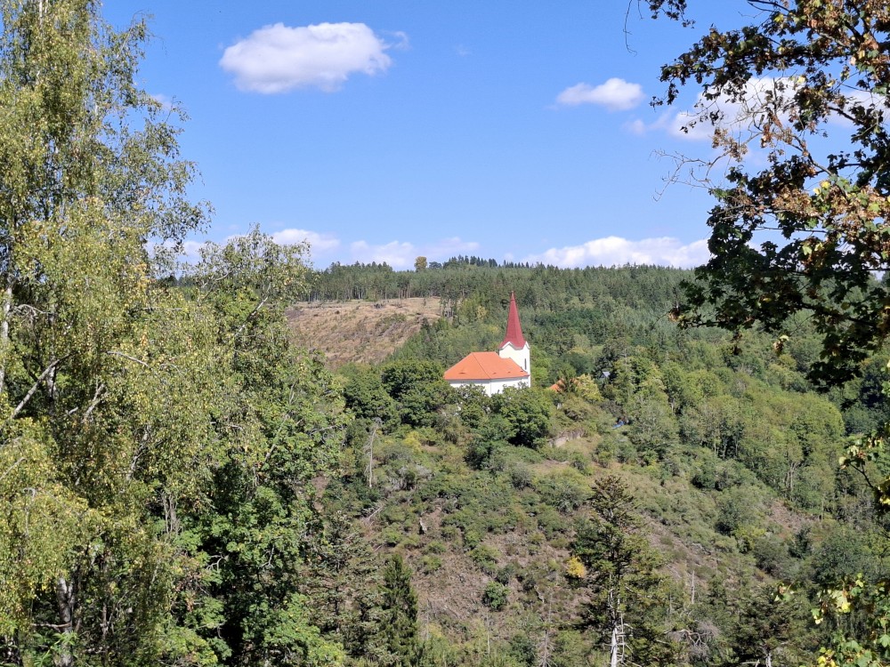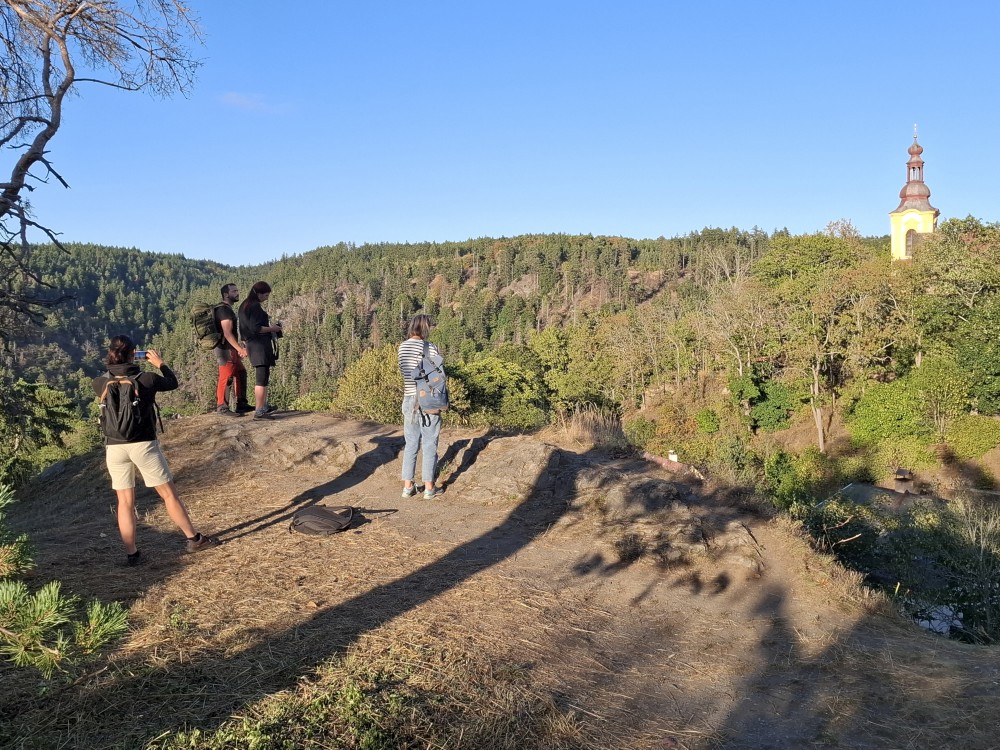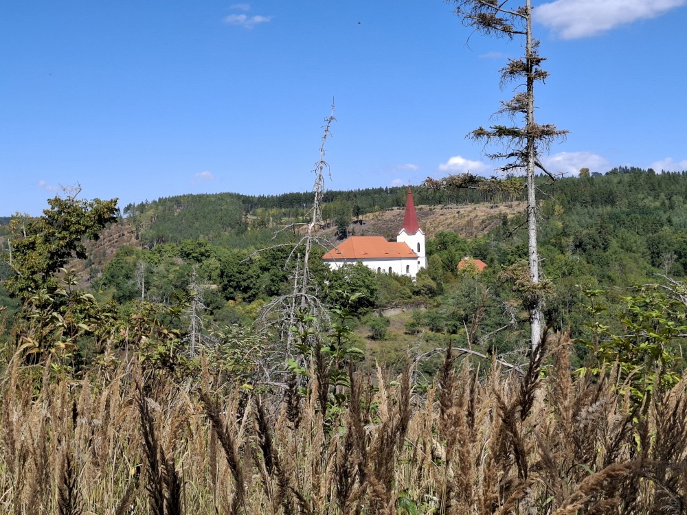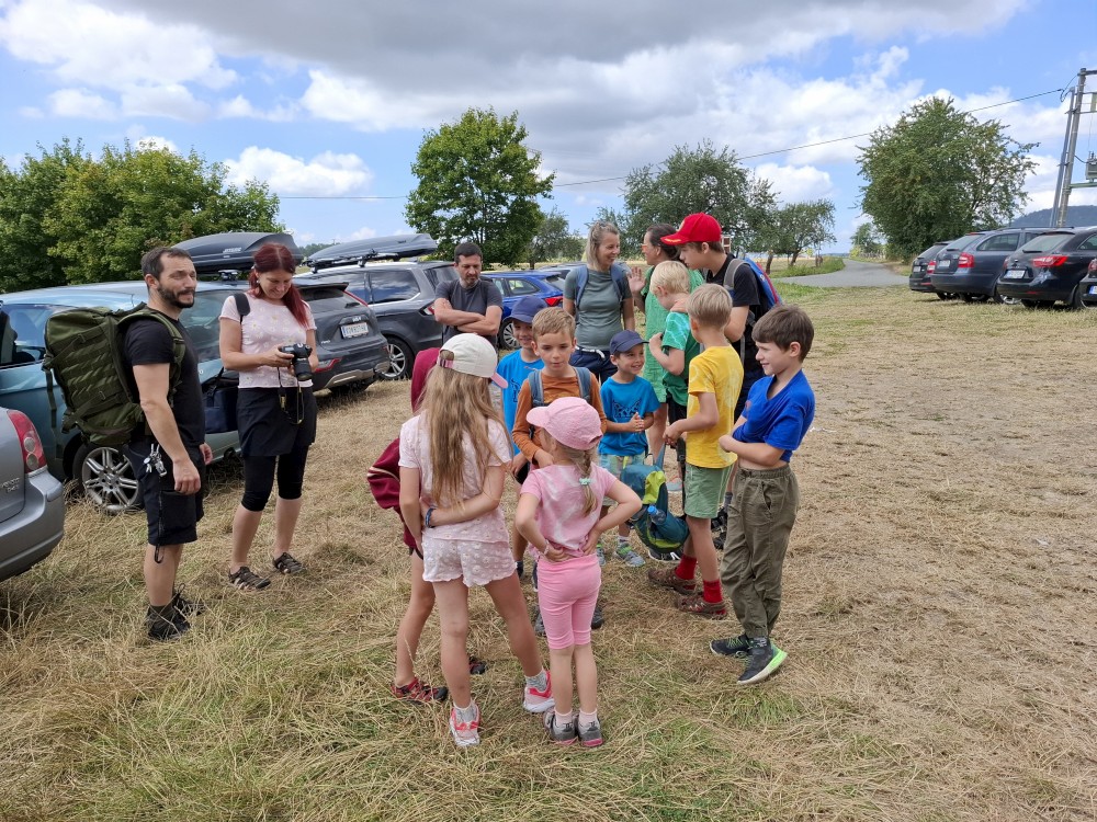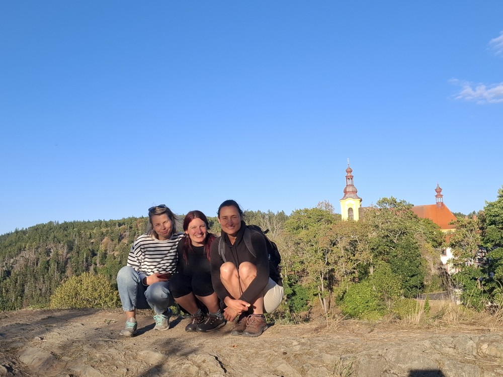 Od kolemjdoucích si necháváme dělat první společné foto dovolené. Pak už vyrážíme po žluté na hradiště Bezemín, kde jsou krásné výhledy do kraje, a pak dále až na hradiště Šipín. Na Šipíně je kostel sv. Barbory a koná se tu česko-německá mše. Chvilku se díváme, pak ještě prozkoumáváme hřbitov.