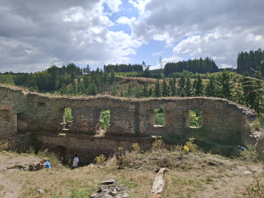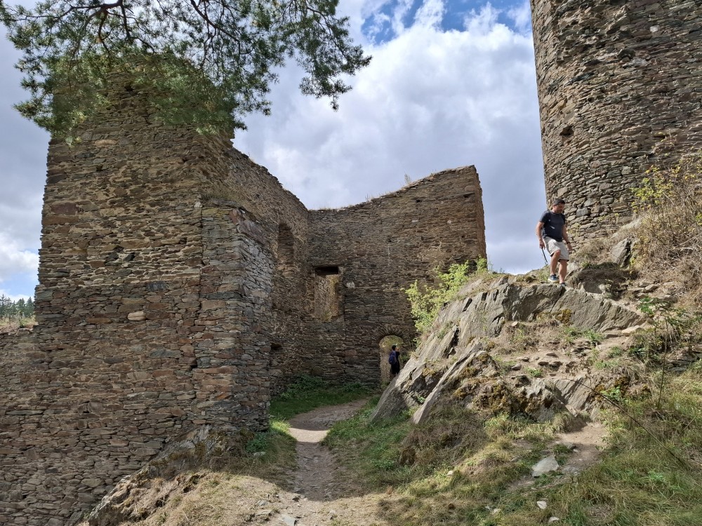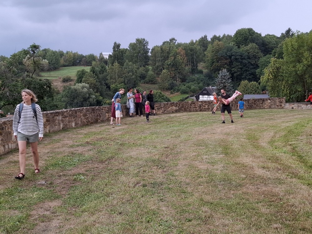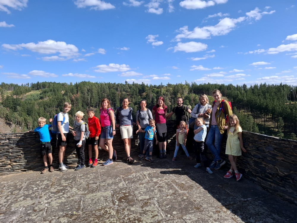 Ráno nespěcháme, nevstáváme úplně brzy. Děti si hrají venku, jezdí na loďce po rybníčku. Kolem jedenácté vyrážíme auty na výlet. Jedeme na parkoviště u loveckého zámečku Daňkov a jdeme na zříceninu hradu Gutštejn. Zkoumáme hradby, podzemní prostory. Bětuška moc chce vystoupat na věž, ale nikde není vstup do věže ani schody. Je ale přesvědčená, že mě viděla nahoře a chce také. Vše se vysvětluje. Viděla mě na hradbách z takového úhlu a podhledu, že si myslela, že stojím nahoře. Došli jsme se podívat na hradby, pochopila to a výstupu na věž už se pak nedomáhala.
