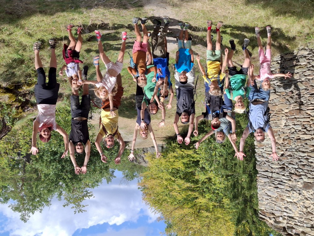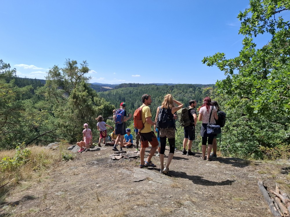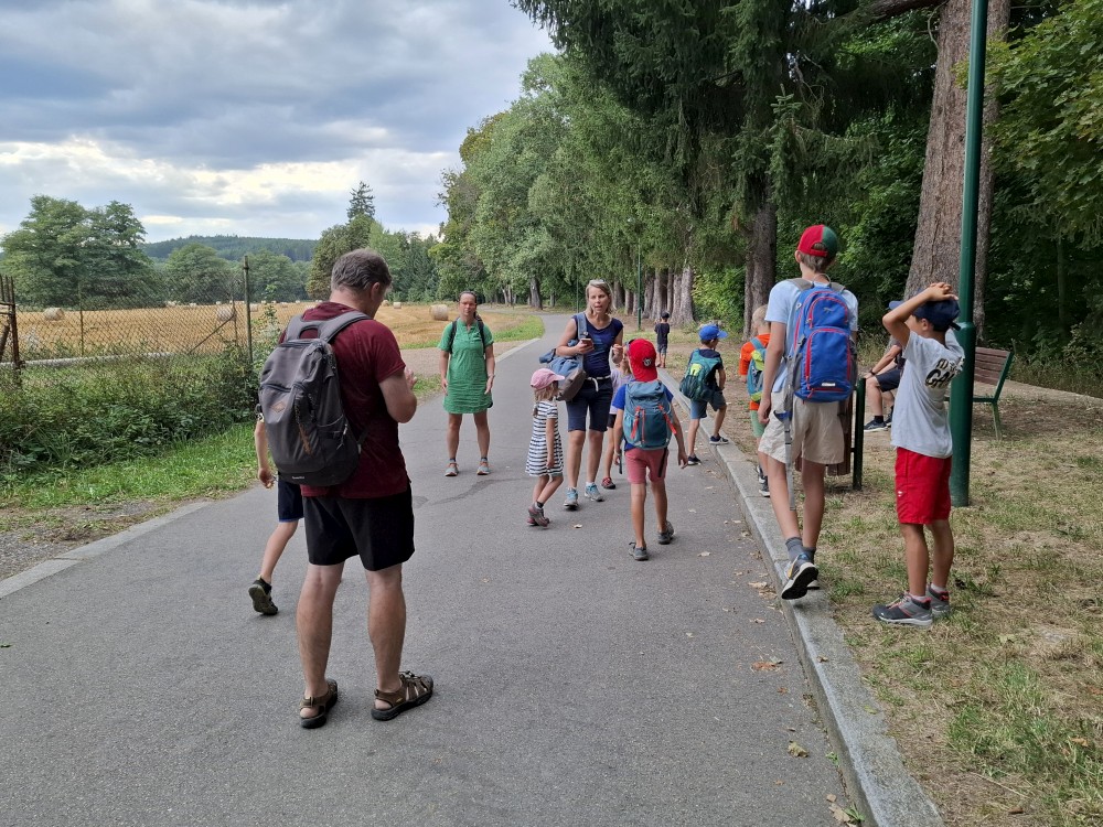 Pak už všichni společně vyrážíme na pěší okroužek kolem Plas. Jdeme po zelené naučné stezce kolem Střely k Peklu, tak přes most na druhou stranu řeky a po silnici zpět do Slap. Pak si dáváme zmrzlinu a další občerstvení v Kafe&Klášter.