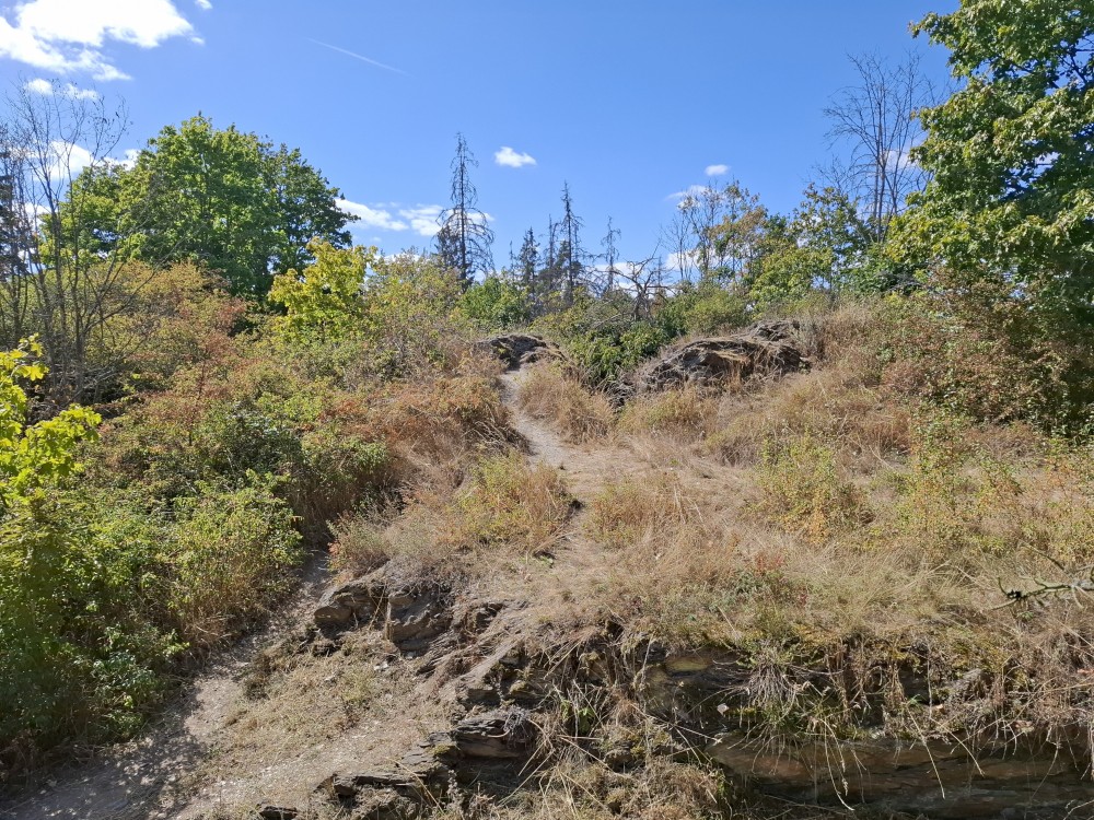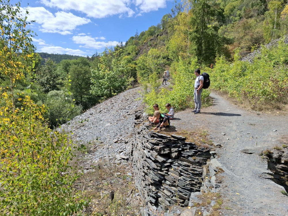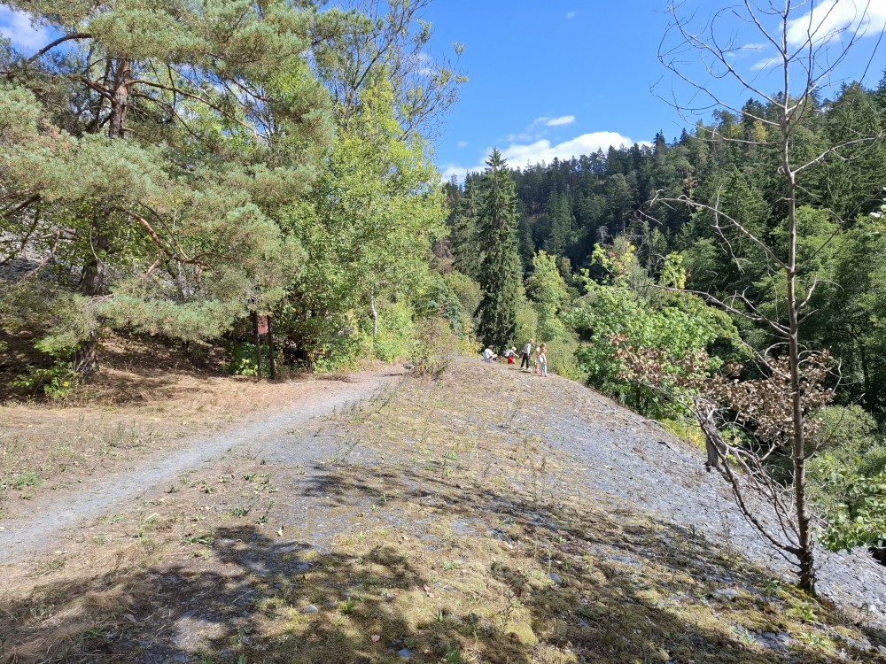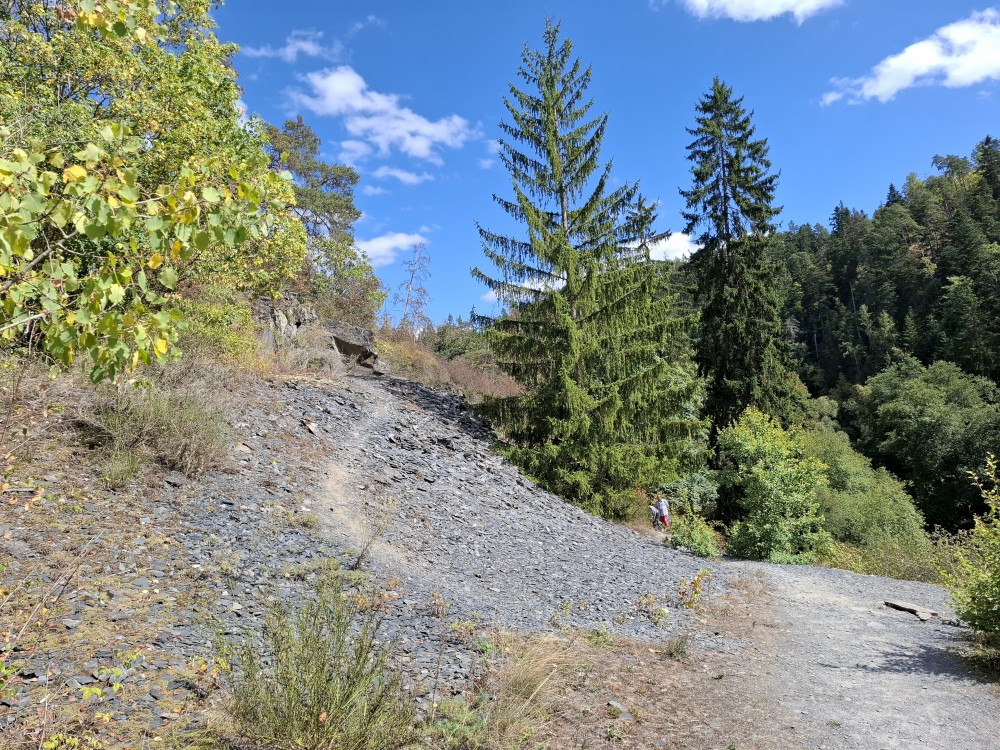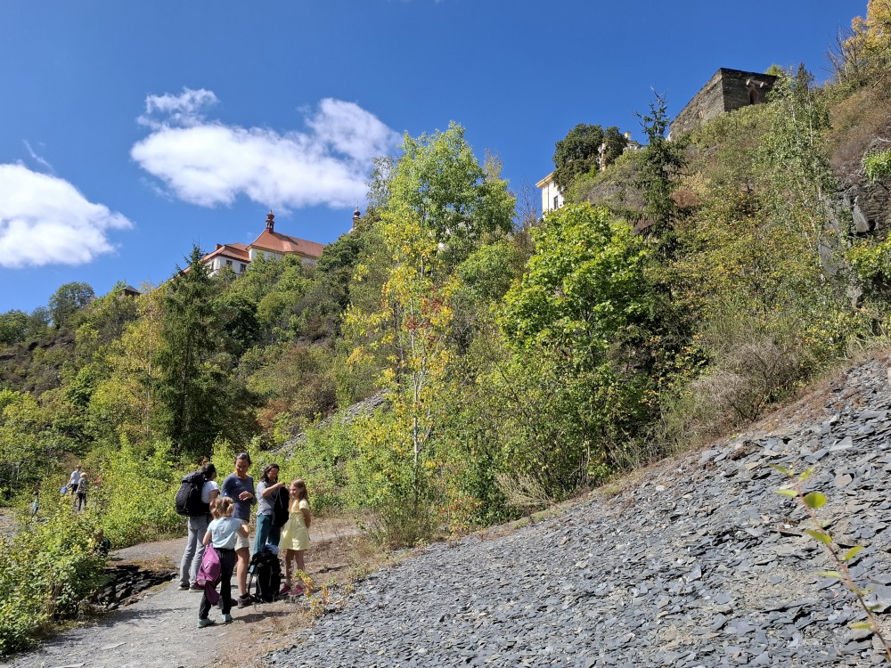 Po občerstvení vyrážíme na centrální naučnou stezku, kratší okruh. Klesáme až k řece Střele a pak zase pozvolna stoupáme úbočím strmého břidlicového svahu, nad kterým se tyčí zámek. Břidlice je úplně všude. Z místní břidlice je i střecha Karlštejna.