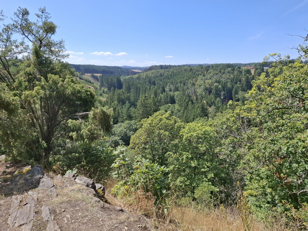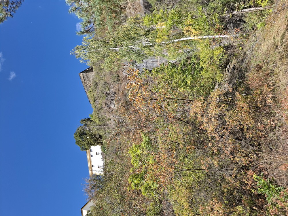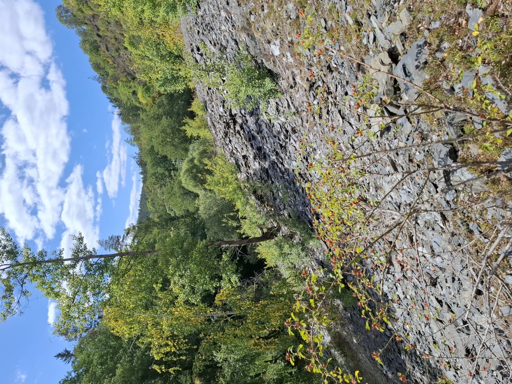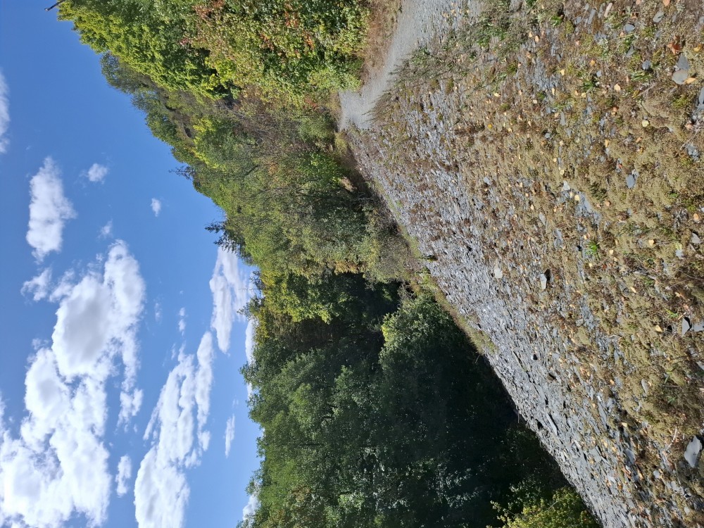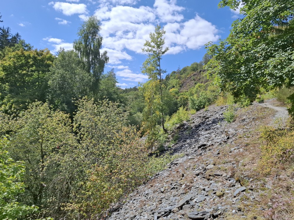 Po občerstvení vyrážíme na centrální naučnou stezku, kratší okruh. Klesáme až k řece Střele a pak zase pozvolna stoupáme úbočím strmého břidlicového svahu, nad kterým se tyčí zámek. Břidlice je úplně všude. Z místní břidlice je i střecha Karlštejna.