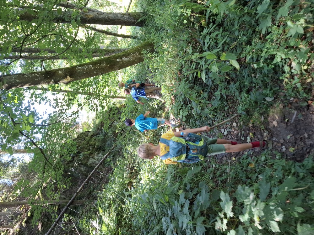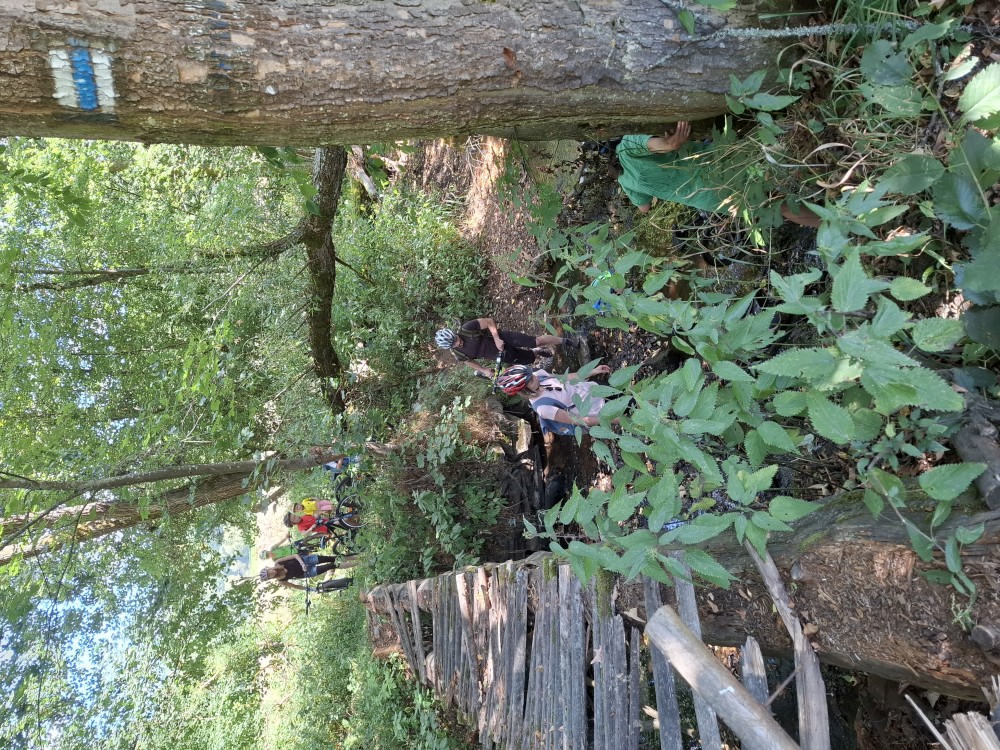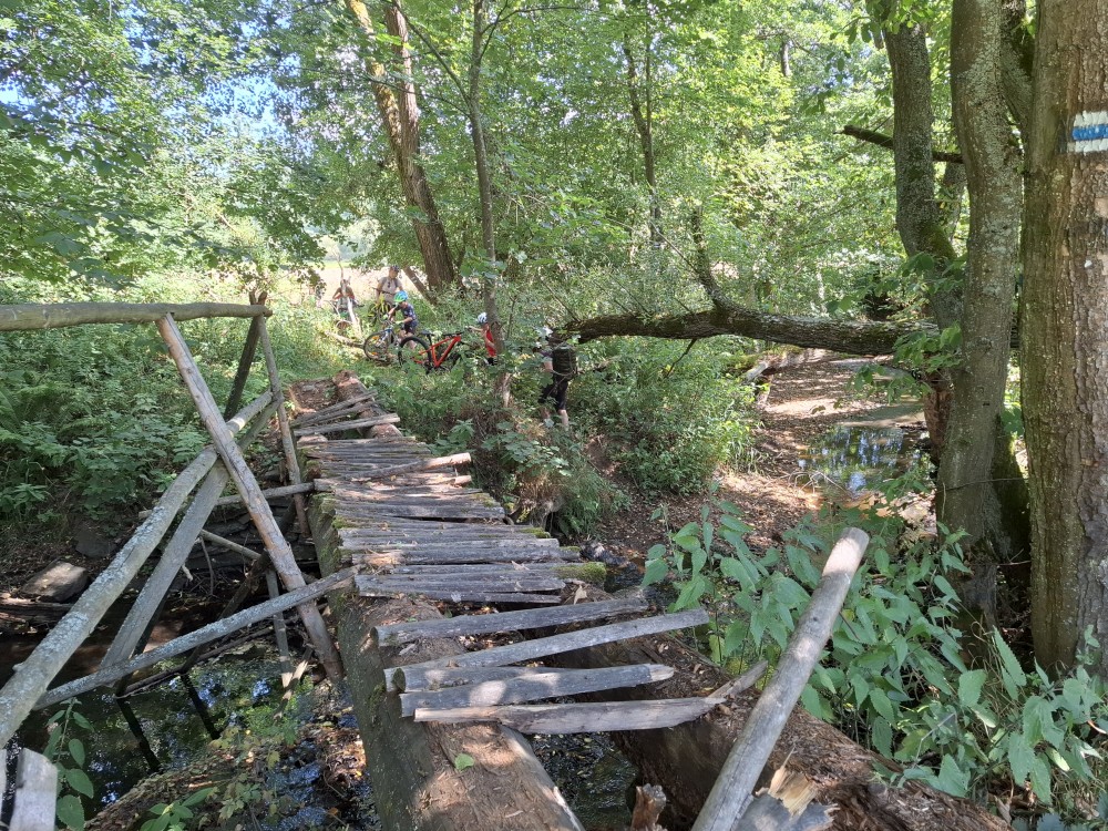 Myslíme si, že zbytek skupiny bude již daleko před námi, ale zjišťujeme, že jeli po modré, zabloudili, a až nyní se objevují za námi. Takže jsme se alespoň propojili. Prodíme přes potok i s kolama. Pak nás čeká hodně výživné stoupání do Potína. Pro mě je to s poraněnou nohou velký boj.