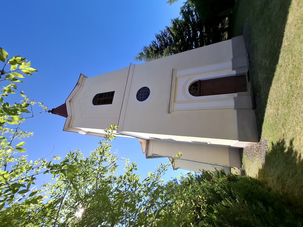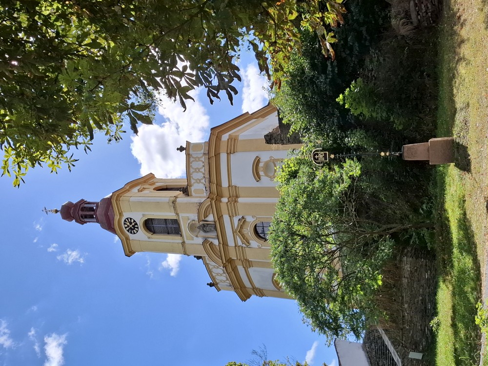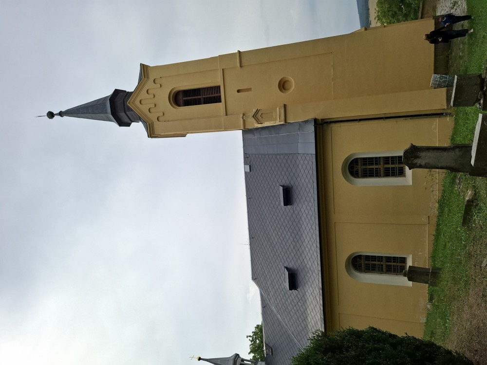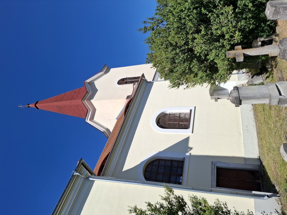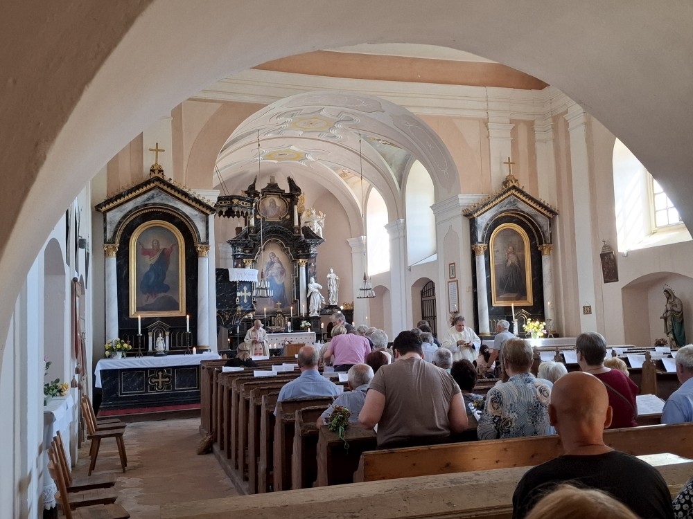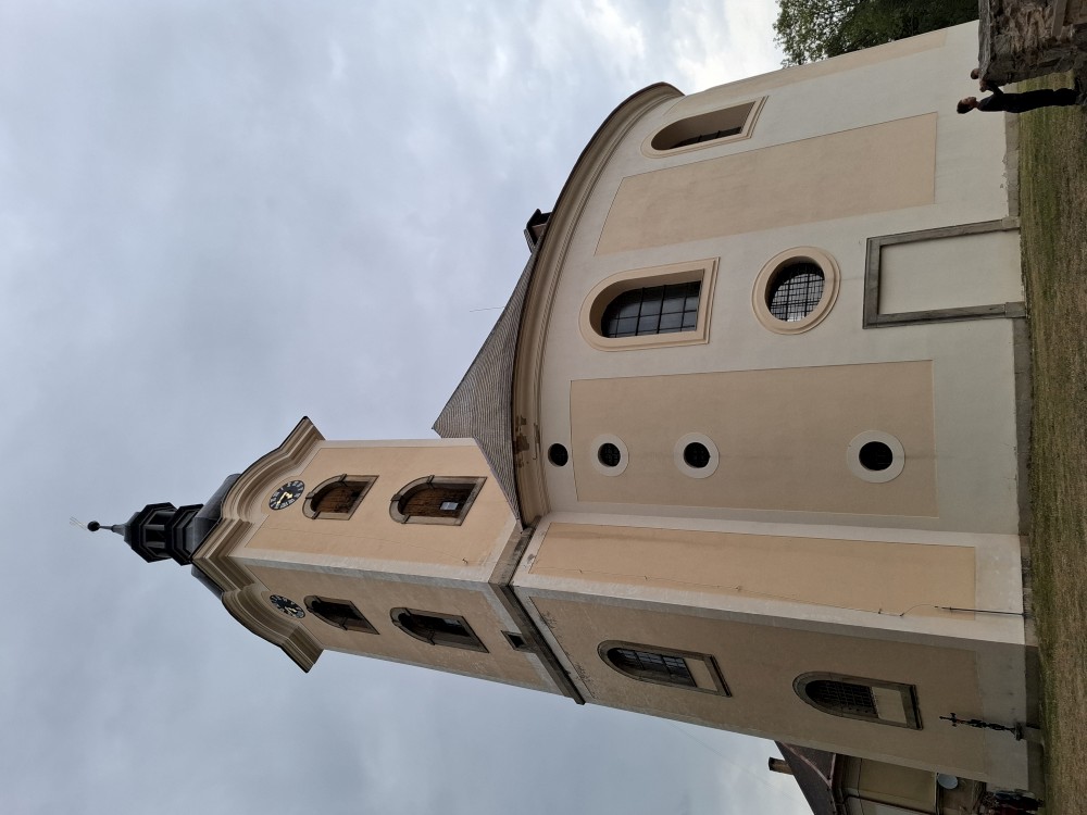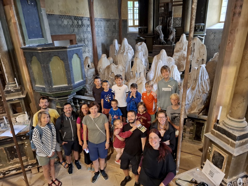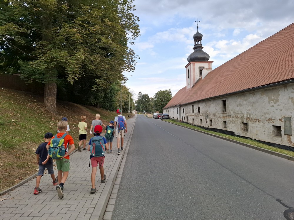 Pak se jdeme ještě podívat k místnímu kostelu sv. Jana Křtitele. Děláme společné foto u stěny kostela a jdeme k autům a přesouváme se do mlýna.