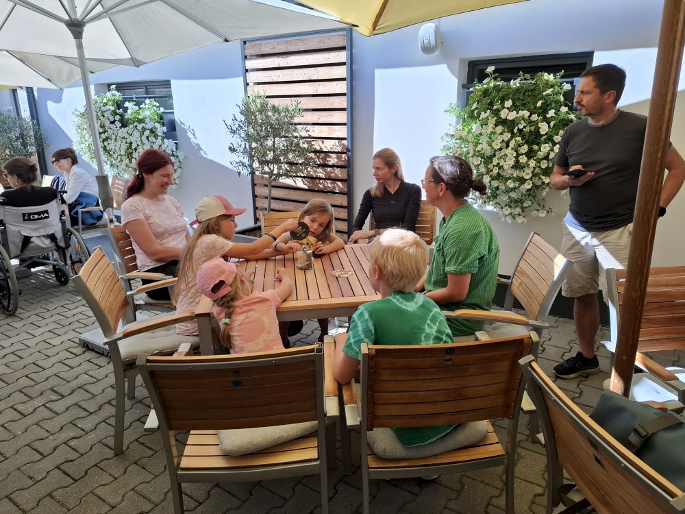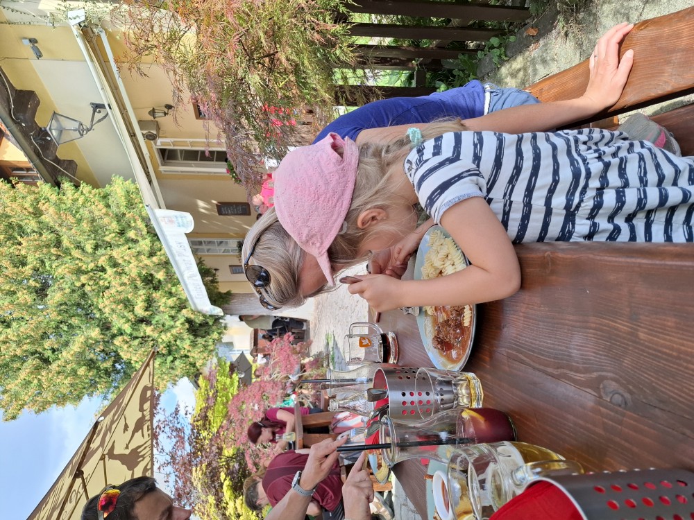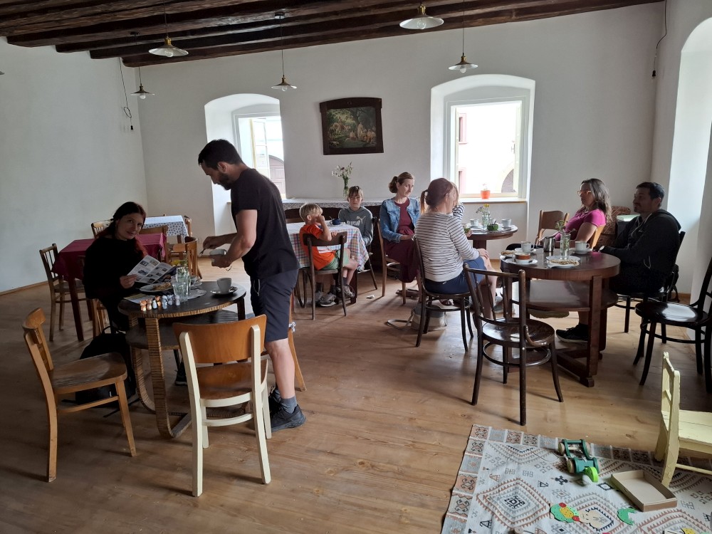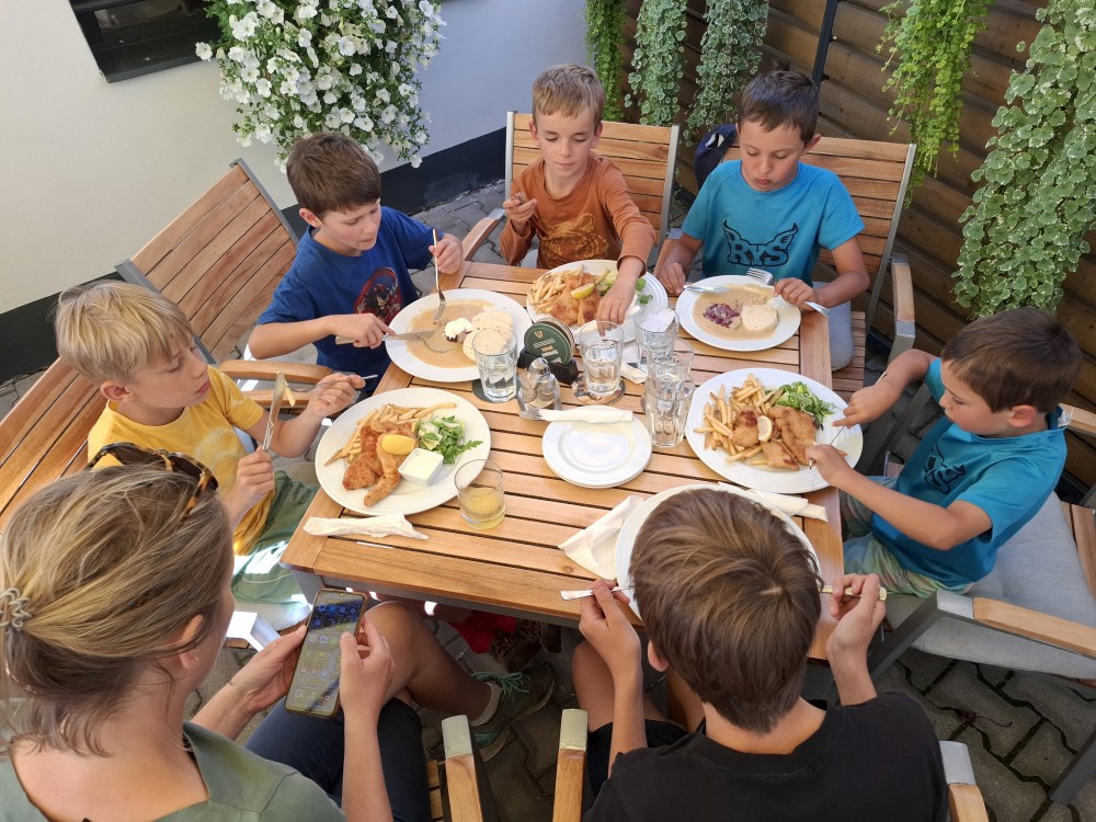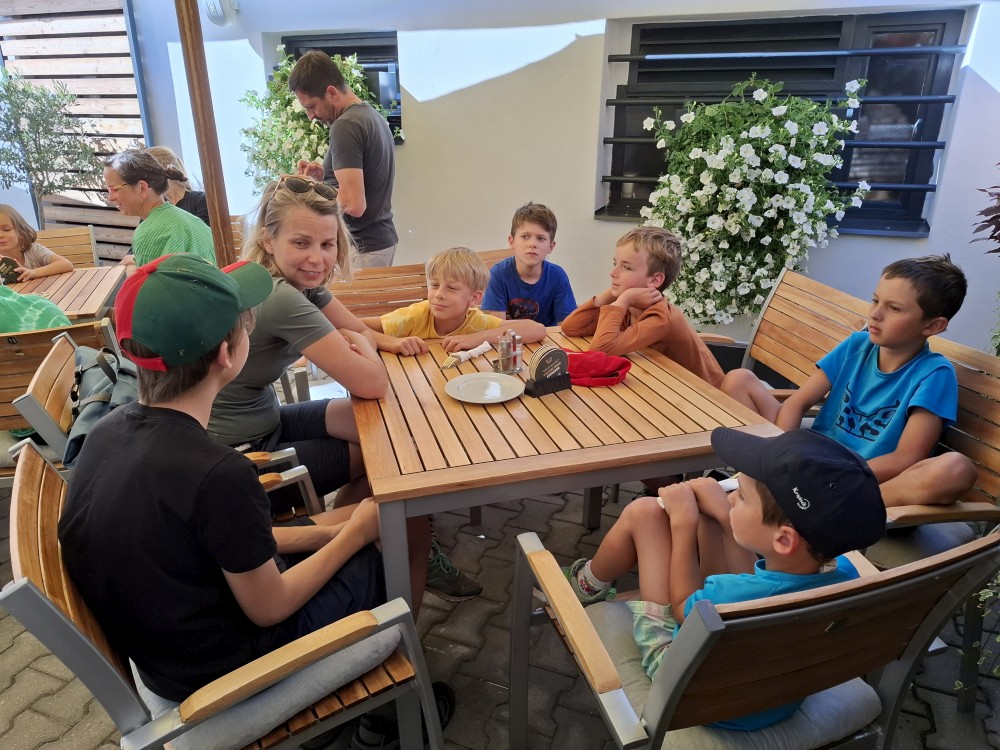 V nemocnici čekáme asi 45 minut. Pak to Jiříkovi doktorka zašila a obvázala. Bylo to hodně bolestivé, ale Jiřík to dal. Ostatní mezi tím odjeli do Plas. Jdou na oběd do restaurace Café restaurant Rudolf II. Dorážíme tam chvilku po nich. Doobjednáváme si jídla.
