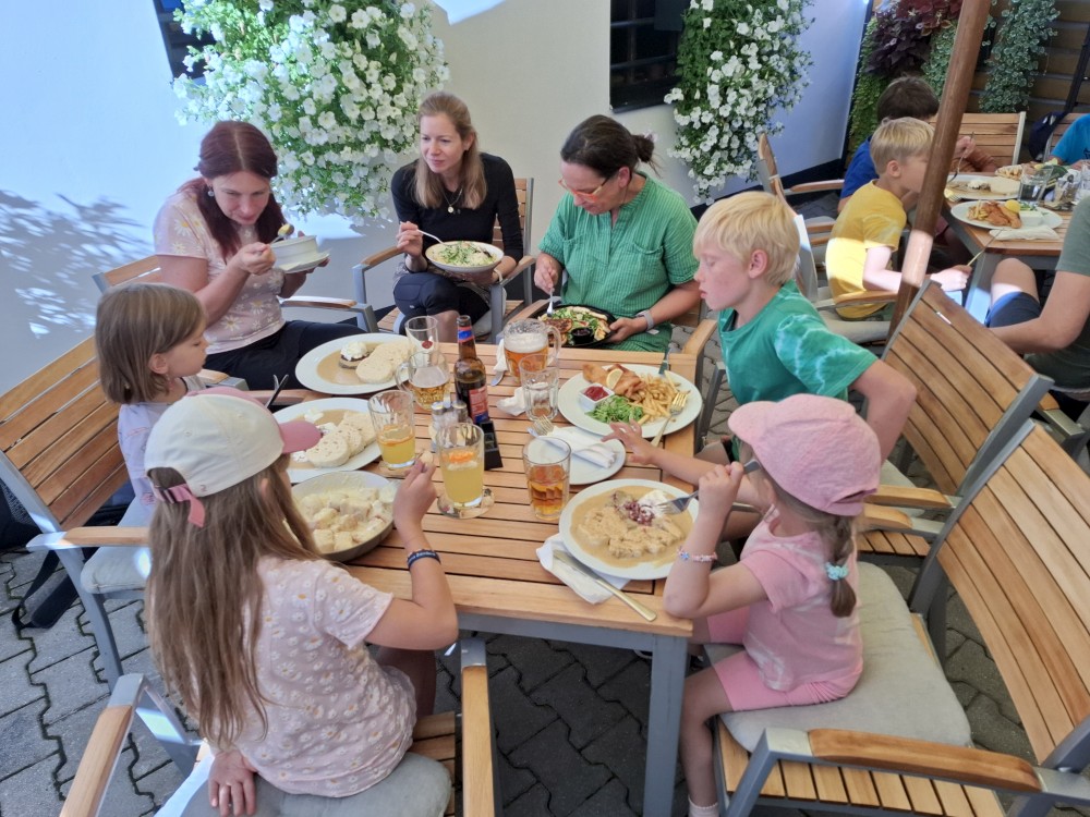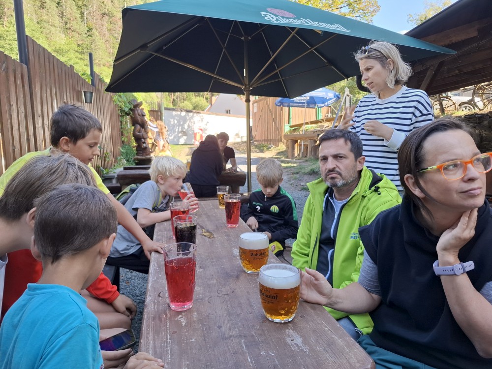 Po prohlídce jdeme na velmi pozdní oběd do hostince u kamenného mostu. Já si dávám cestou ještě jeden obložený chléb, takže oběd nepotřebuji. Dávám si alespoň pivo. Jídla tu byla velmi dobrá, všichni jsou najedeni.
