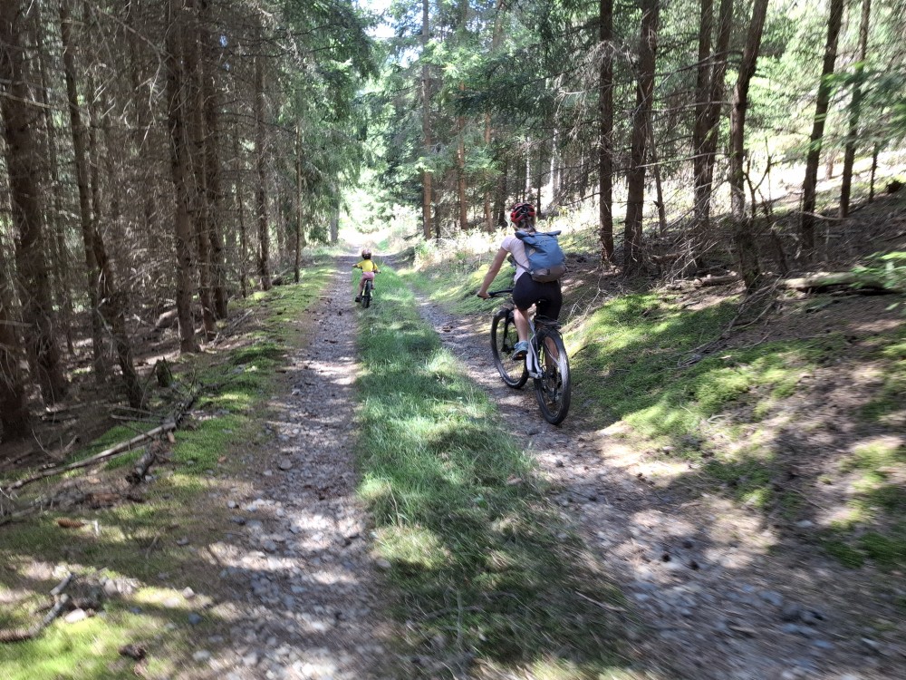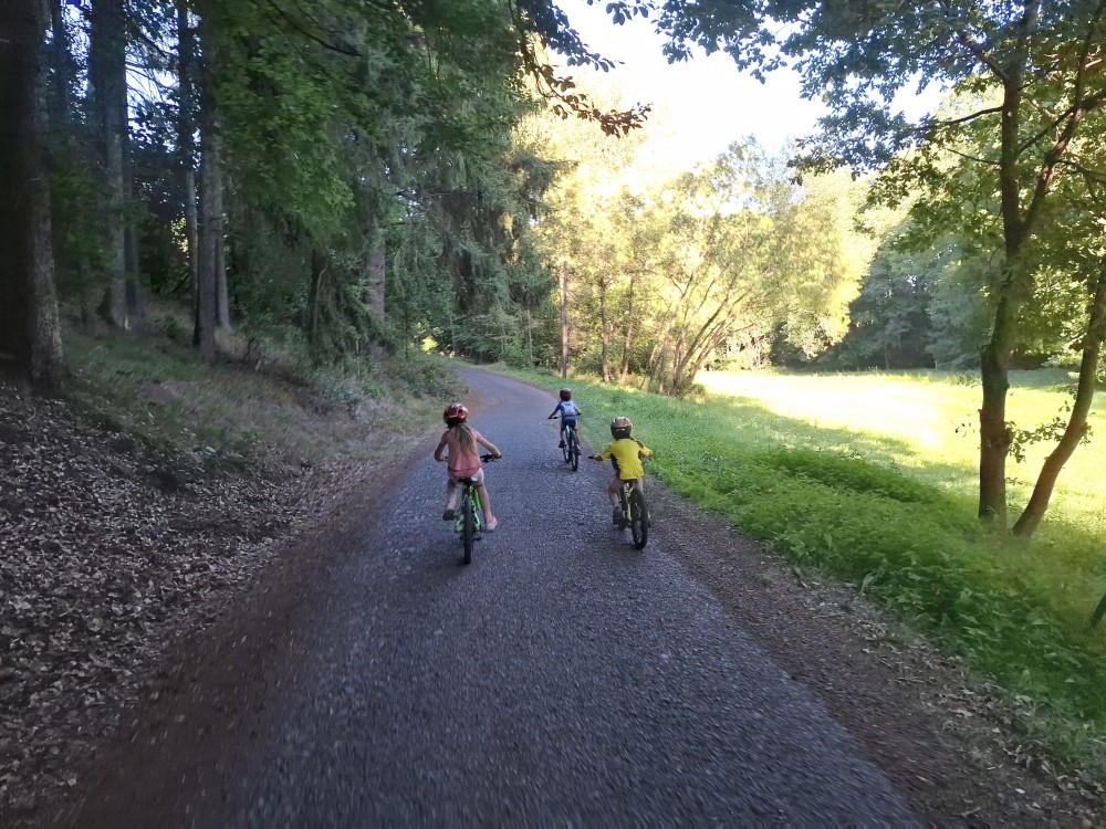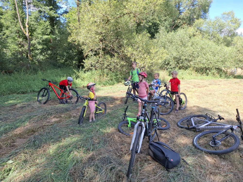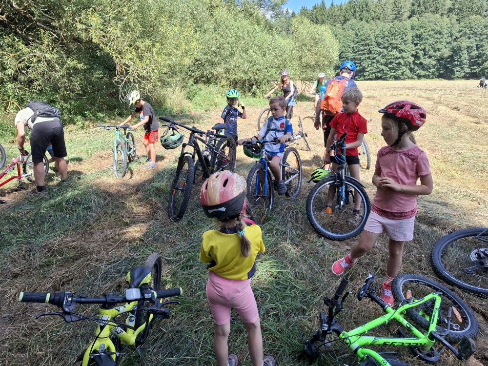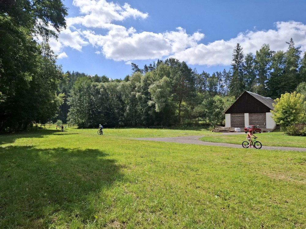 Jedeme po modré kolem Nezdického potoka, musíme přejet brod a pak dále pokračovat složitým terénem po zelené až na křižovatku s asfaltkou. Po ní pak musíme vystoupat velký kopec. Občas kola tlačíme, ale holky to zvládají skvěle. Na závěr si dáváme sjezd až k našemu mlýnu. Večer přijíždí Peťa s Vašíkem. Dnes jdeme brzy spát.