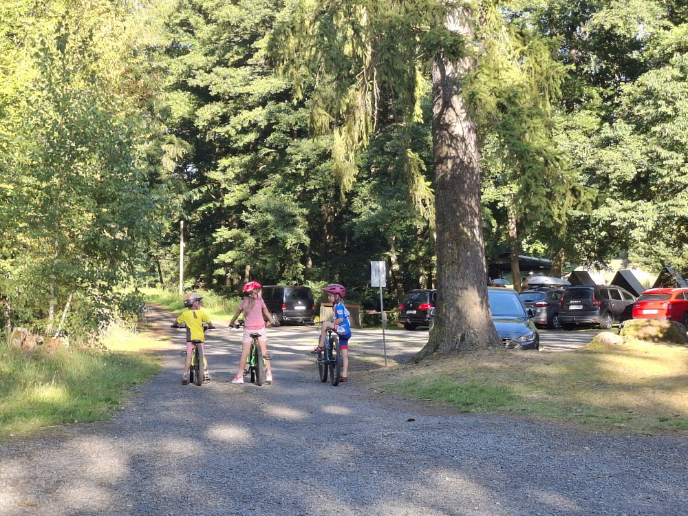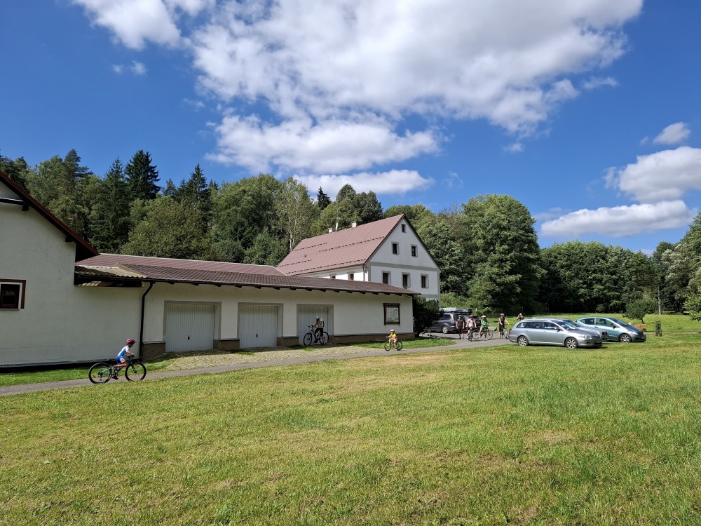 Pak nacházíme místo, kam budeme pokračovat. Pojedeme do kempu Na koupališti u Nezdického potoka. Je to nedaleko Bezdružic a je tu hospoda. Dělíme se na dvě skupiny. Já, Magda a nějaké menší děti jedeme přímou cestou z kopce po asfaltce, starší děti jedou s Láďou na stejné místo oklikou, delší cestou.