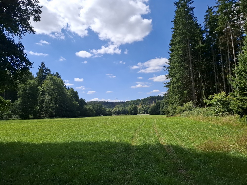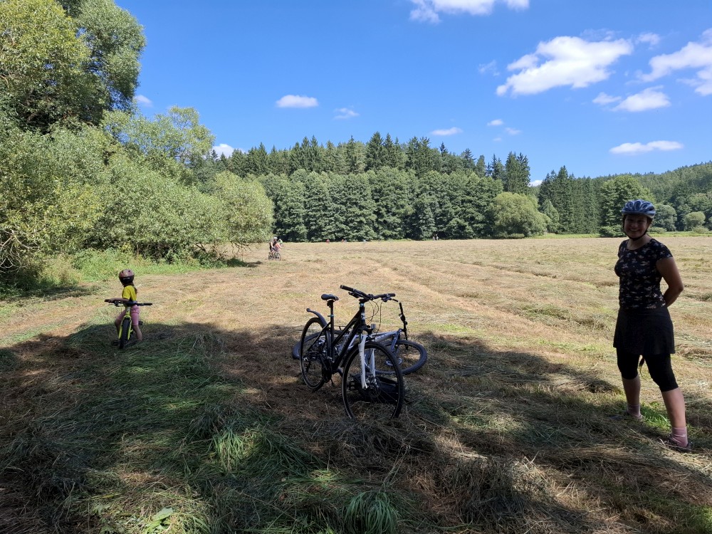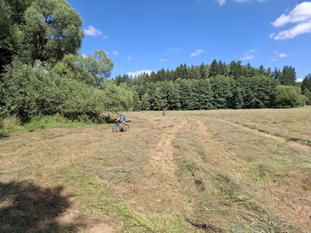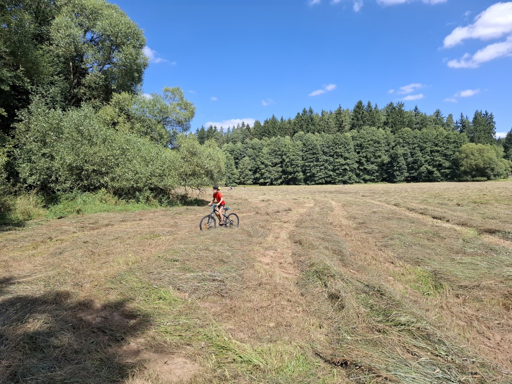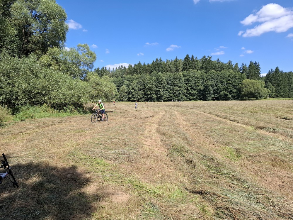 Dnes vyrážíme na kola. Vyrážíme až kolem poledne. Kousek od mlýna se napojujeme na modrou turistickou značku a jedeme na JZ kolem Dolského potoka. Jedu v zadu, pomáhám Jonance, která se na kole účí, resp. hodně dlouho na něm nejela. Rychle se zlepšuje.