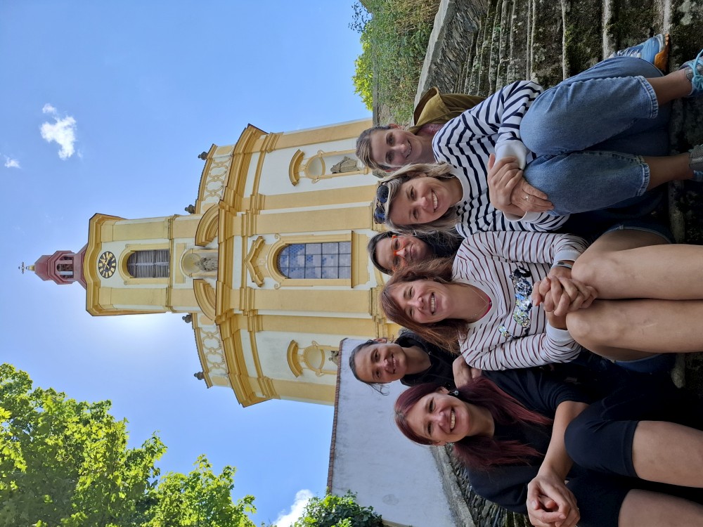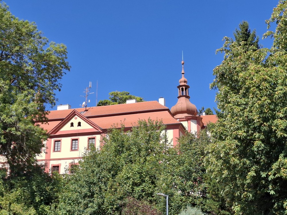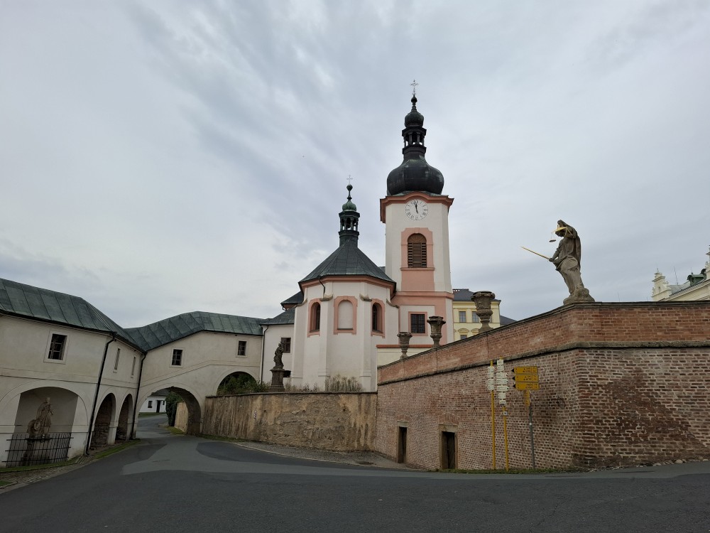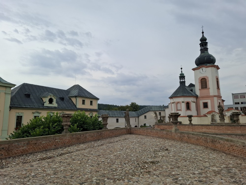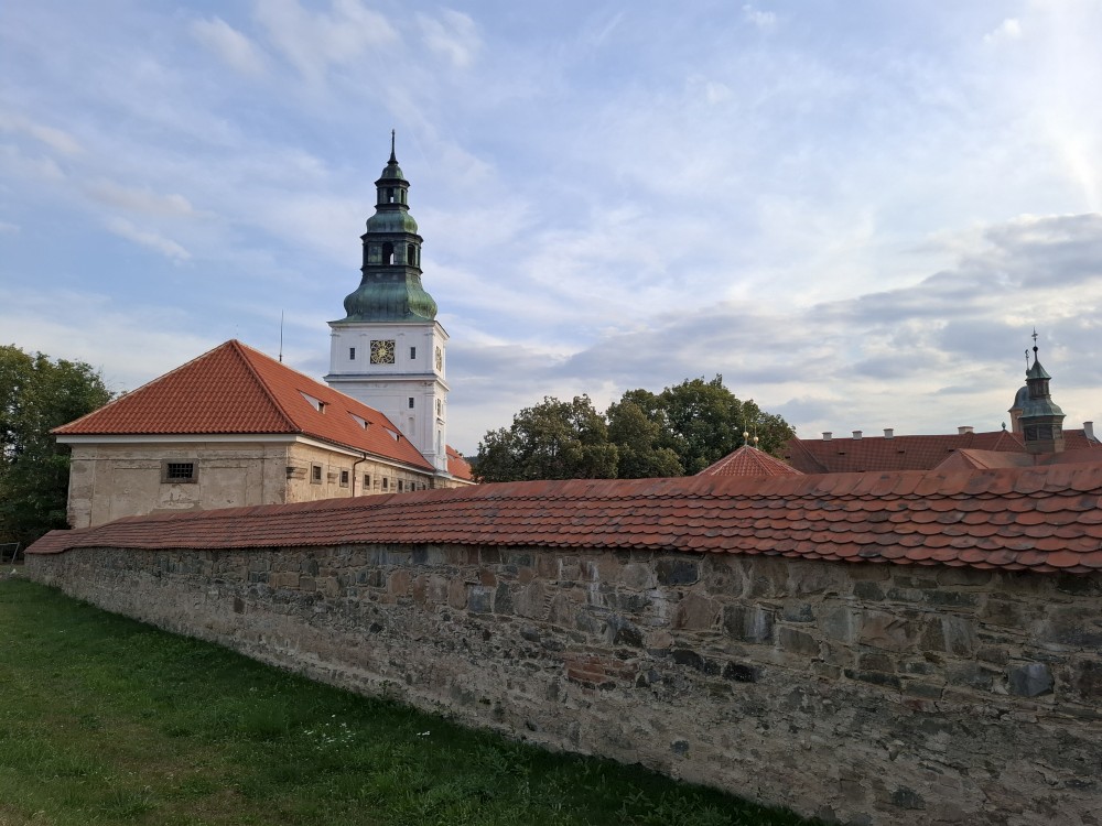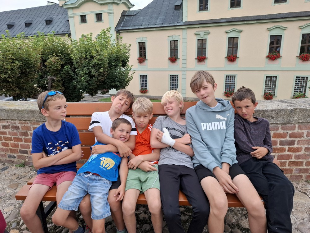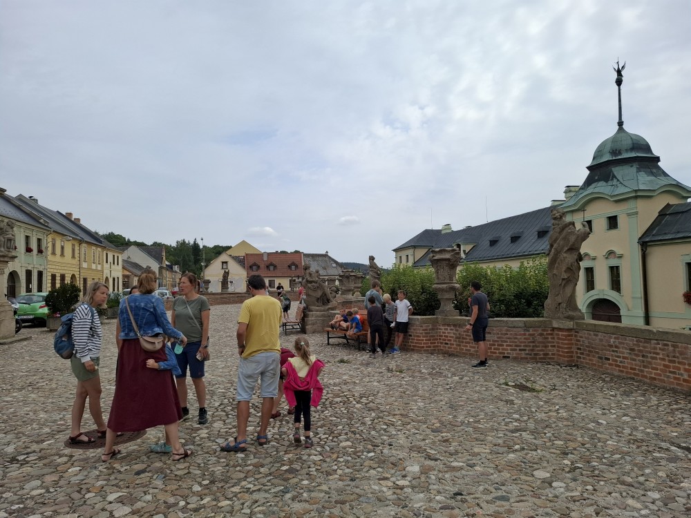 Jdeme se podívat na kostel Panny Marie Sedmibolestné. Jdeme se podívat i dovnitř. Pak sedíme na schodech před kostelem, hned vedle vstupu do zámku. Průvodkyně zámkem se nás ptá, zda nepůjdeme na prohlídku ve 13 hodin, což je nyní. Bohužel ještě nejsme kompletní, tak odmítáme a domlouváme se, že přijdeme na 15. hodinu.