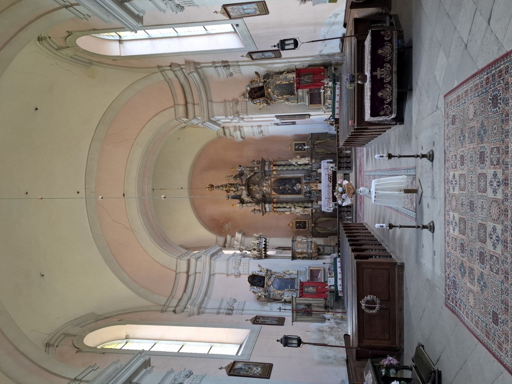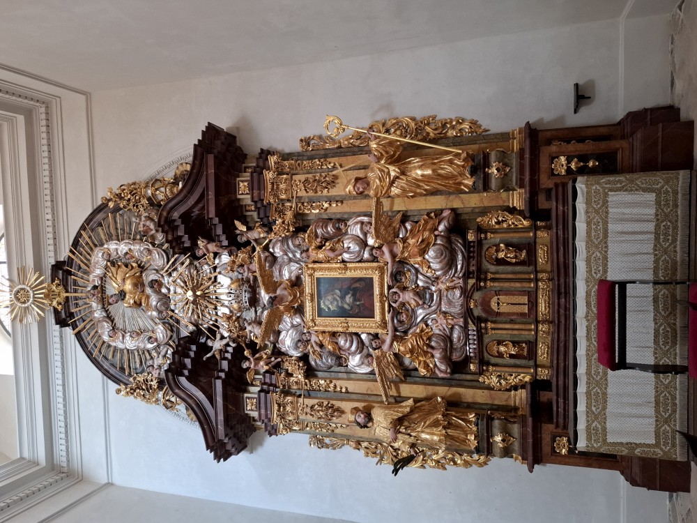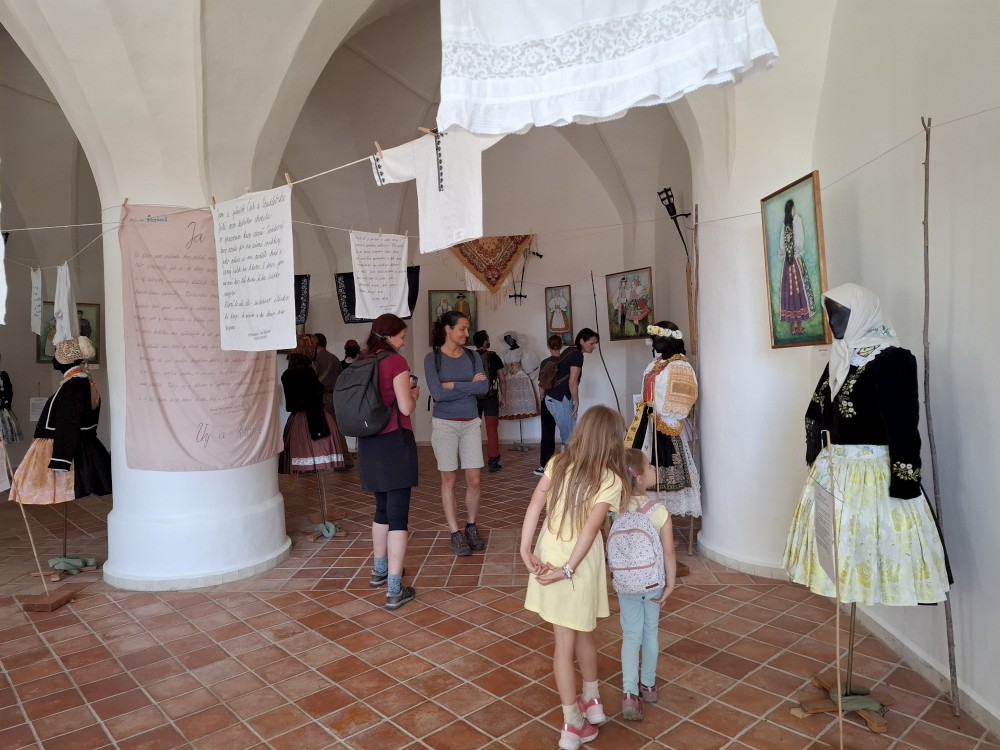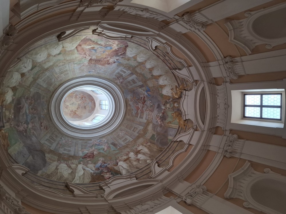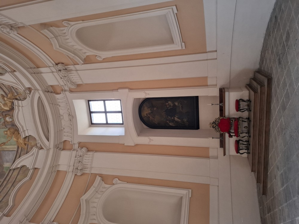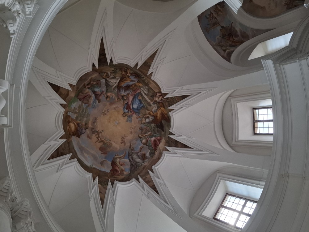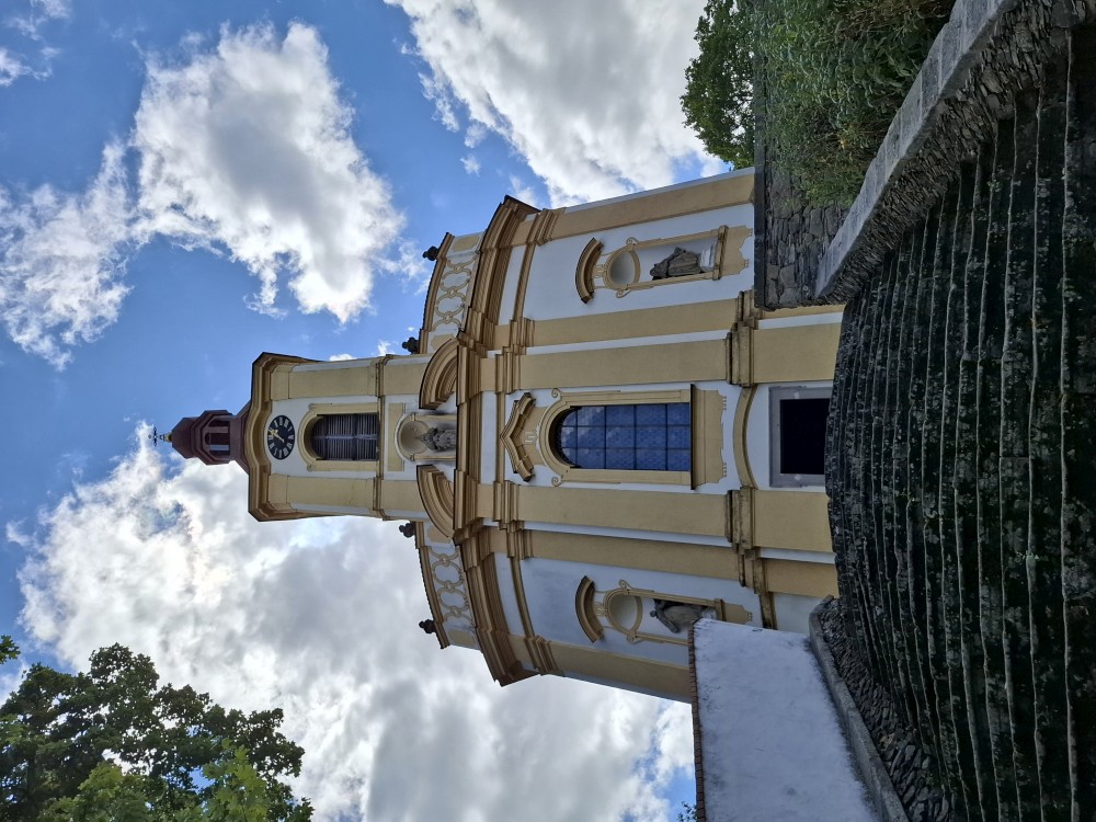 Jdeme se podívat na kostel Panny Marie Sedmibolestné. Jdeme se podívat i dovnitř. Pak sedíme na schodech před kostelem, hned vedle vstupu do zámku. Průvodkyně zámkem se nás ptá, zda nepůjdeme na prohlídku ve 13 hodin, což je nyní. Bohužel ještě nejsme kompletní, tak odmítáme a domlouváme se, že přijdeme na 15. hodinu.
