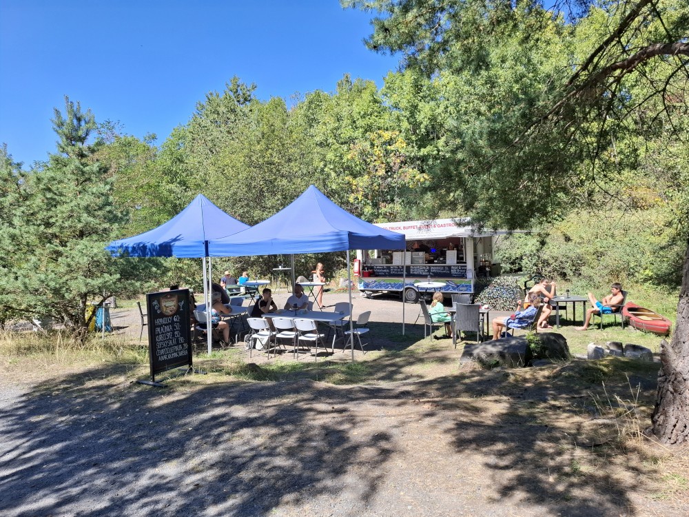 My už vyrážíme s holčičkama na koupák. Jsme tu první. Platíme vstupné, nacházíme místo ve stínu, nafukujeme padleboard. Přijíždí cykloskupinka a jdou se s paddleboardem koupat. Já si dávám u místního chorvatského stánku Čivabčiči a pivo. Ostatní jdou na oběd později na protější břeh. Po dalších koupačkách a posedávání se zase dělíme. Cykloskupinka jede domů, Pavla, Honza, Jana a Živuška s Johankou jdou na pěší okruh kolem Hradišťského vrchu.