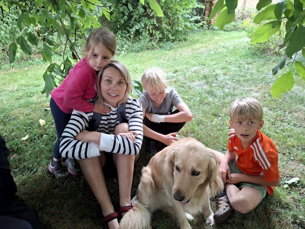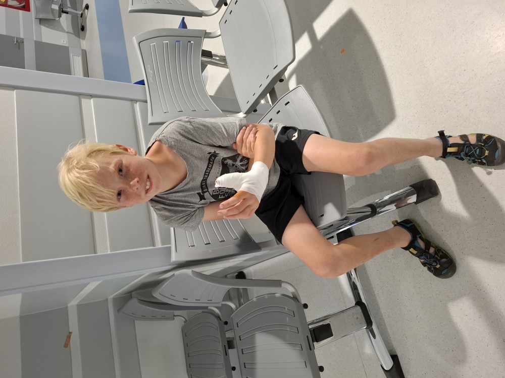 Pak přišel Honza s tím, že děti mají srp a že ho považuje za extrémně nebezpečný, nebezpečnější než sekyru. A to se už objevil Luky a suše oznámil, že se Jiřík řízl. Tak jsem si povzdechl a šel pomalu za Jiříkem v domění, že to není nic vážného. To se ale objevil Láďa s Jiříkem, Z Jiříka rukou teče slušný proud krve. Rána na palci je hodně dlouhá, a hluboká. Láďa Jiříka rychle obvazuje, abychom zastavili krev a já s Jiříkem sedáme do auta a jedeme rychle do Plzně na šití.