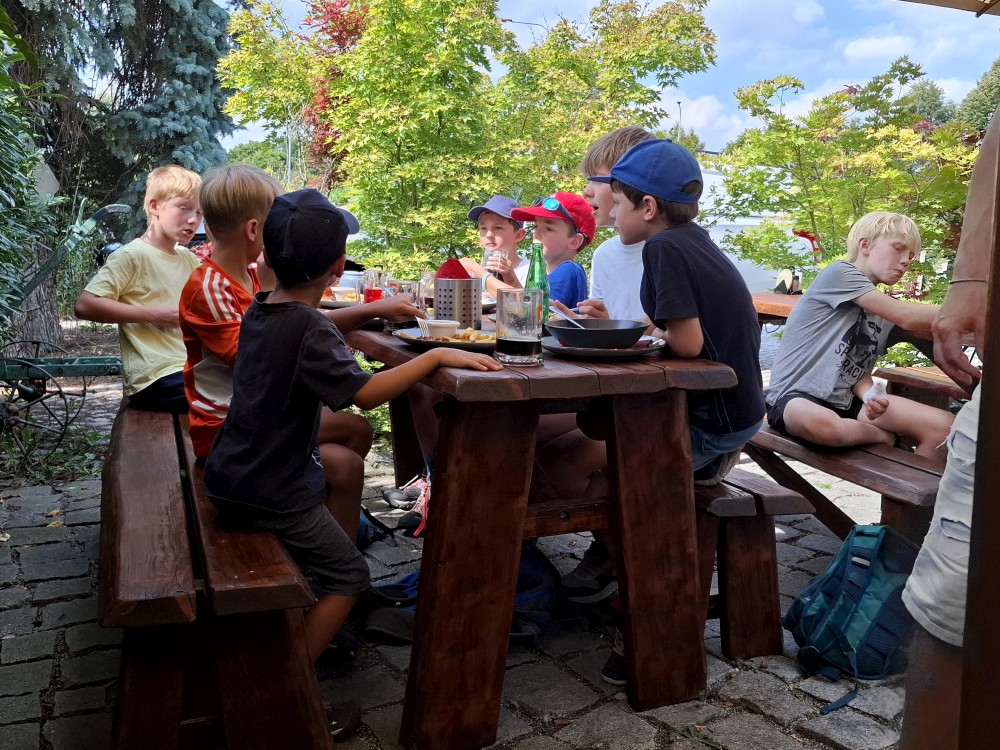 Honza se mezitím vrátil k autu a přijel jedním autem za námi. Nabírá všechny řidiče a veze nás pro ostatní auta. Ostatní po chvíli vyzvedáváme na Šipíně a jedeme na oběd do Konstantinových lázní. Jsou tu 3 hospody, jedna je zavřená, druhá právě zavírá (už jsou 4 odpoledne a mají sanitární den). Zkoušíme šanci v té poslední. Zde je dost plno, ale mají tu 2 stoly pro 4 osoby vedle sebe až úplně na konci dvora. Celý konec dvora obsazujeme, půjčujeme si všechny volné židle od jiných stolů a nakonec se nám podaří celou naší cca dvacetičlennou skupinku usadit.