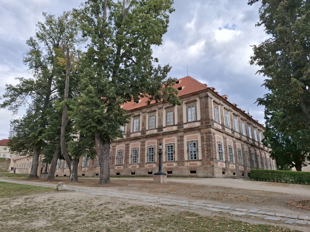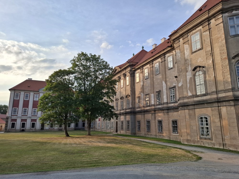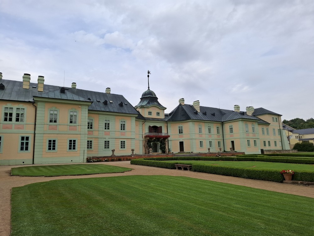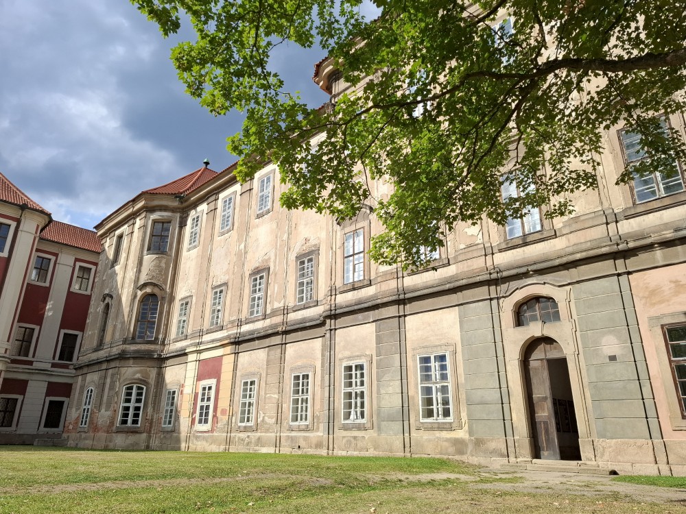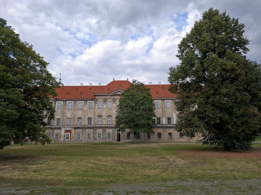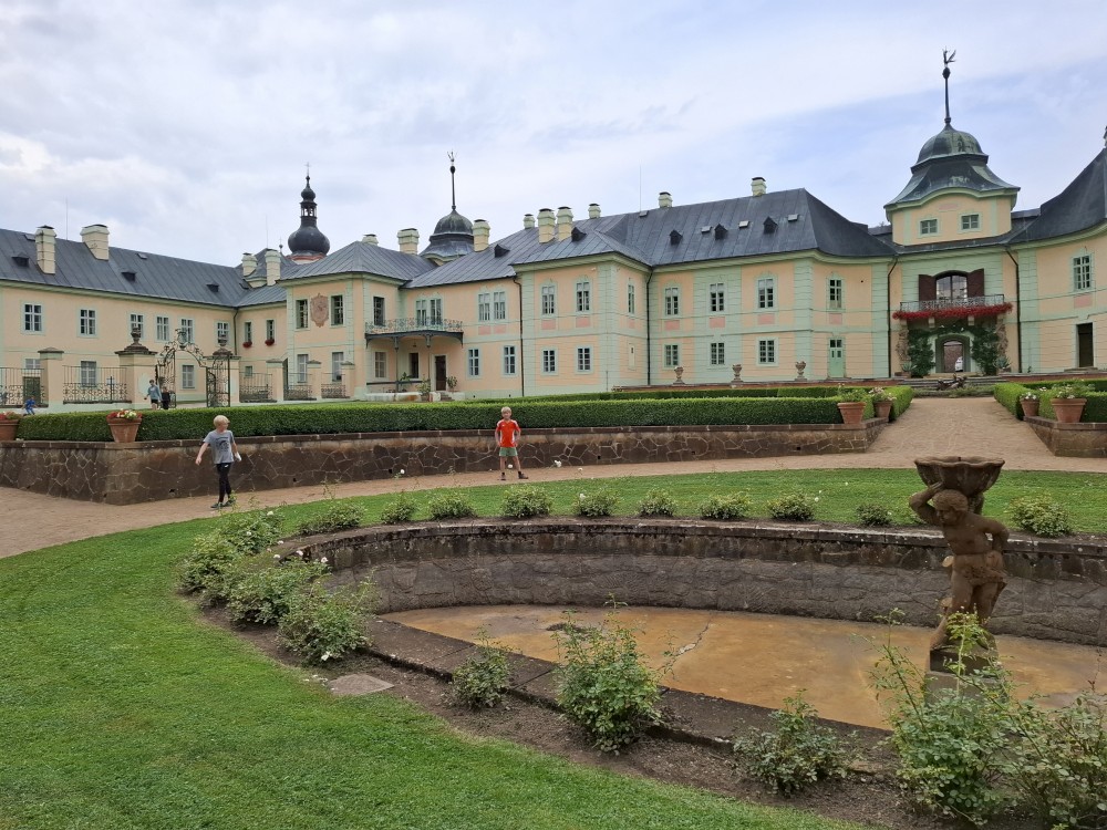 Na zámku je nyní polední pauza, tak čekáme a povídáme před zámkem. Pak už si jdeme koupit lístky na prohlídku. Nikde v Manětíně nejde proud, mají nějakou plánovanou odstávku, tak káva nebude. Před prohlídkou se tedy jdeme podívat do zahrad zámku.