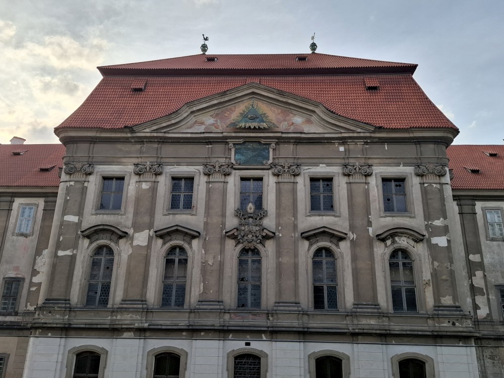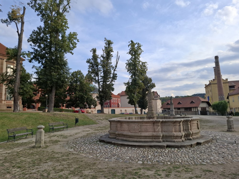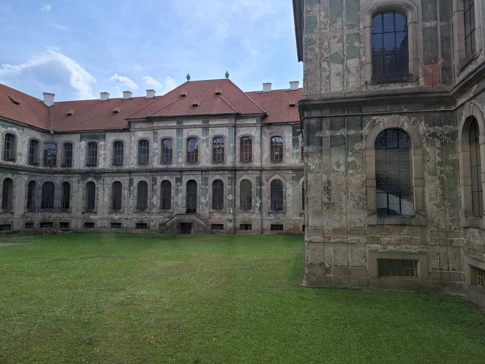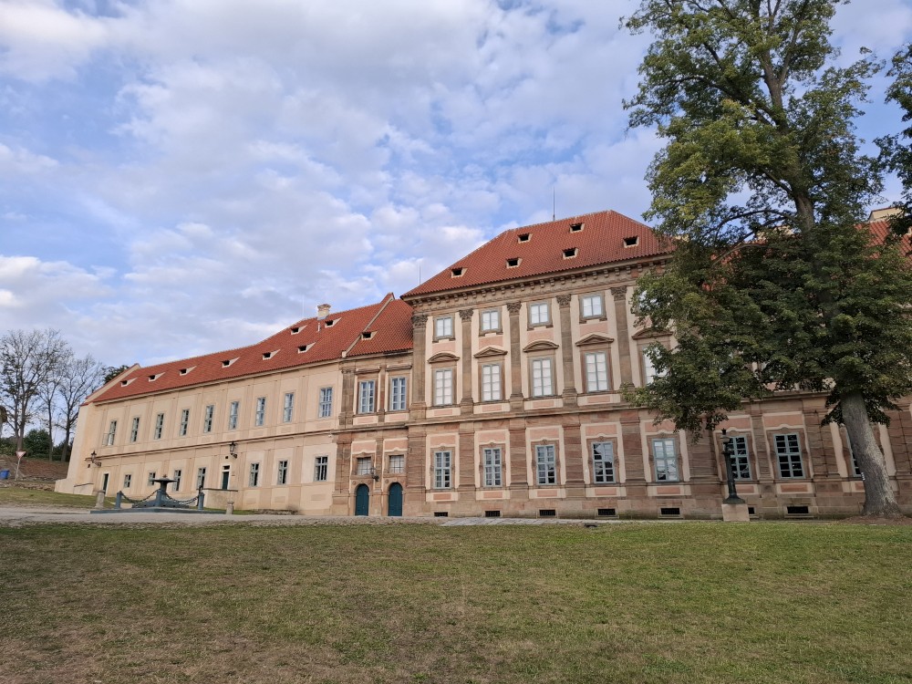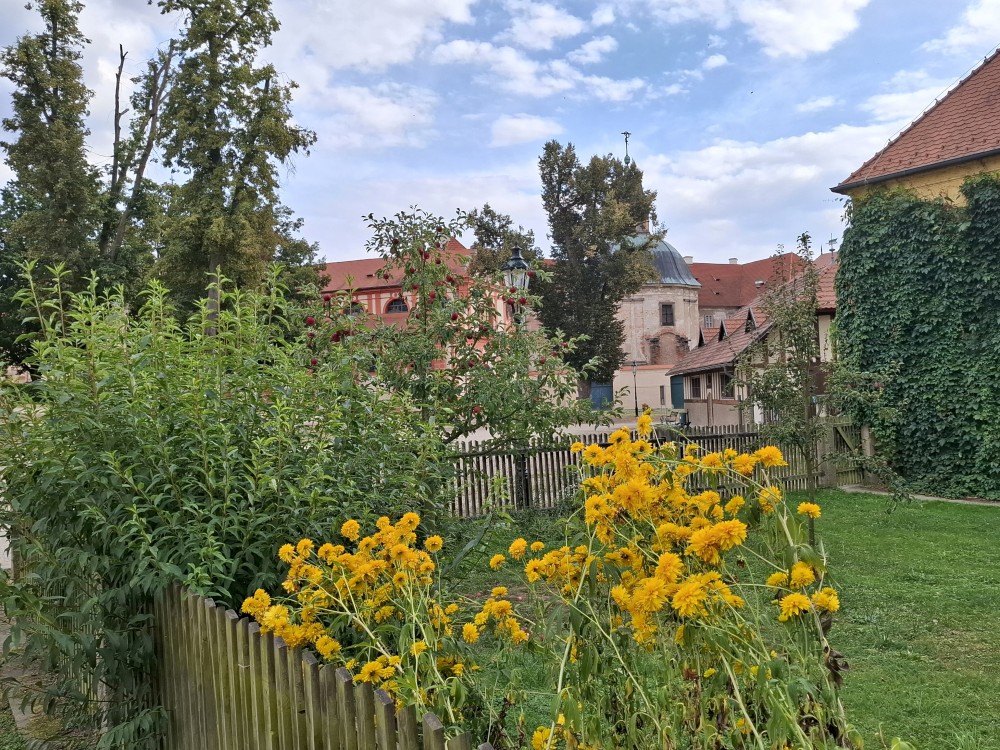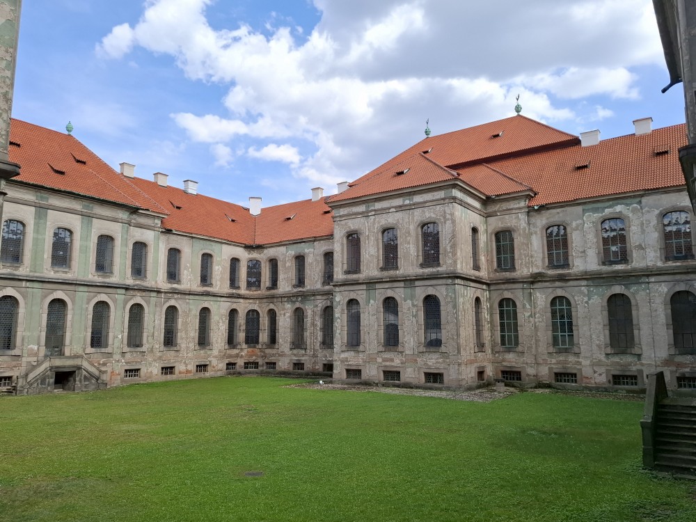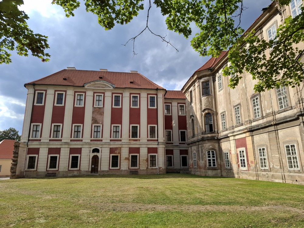 Na zámku je nyní polední pauza, tak čekáme a povídáme před zámkem. Pak už si jdeme koupit lístky na prohlídku. Nikde v Manětíně nejde proud, mají nějakou plánovanou odstávku, tak káva nebude. Před prohlídkou se tedy jdeme podívat do zahrad zámku.