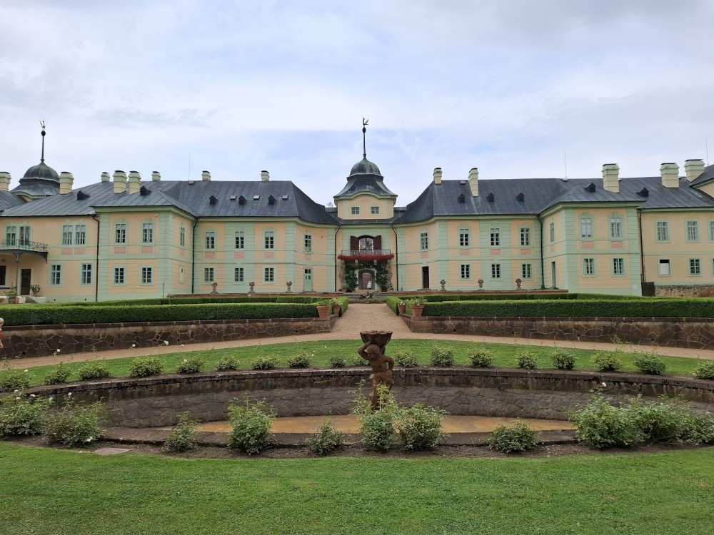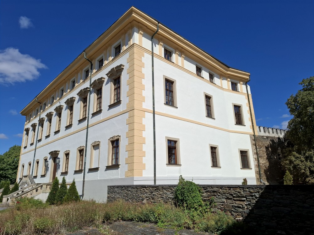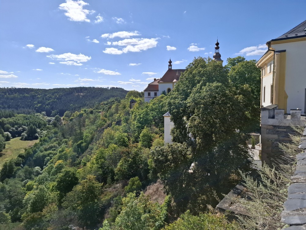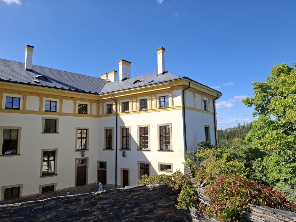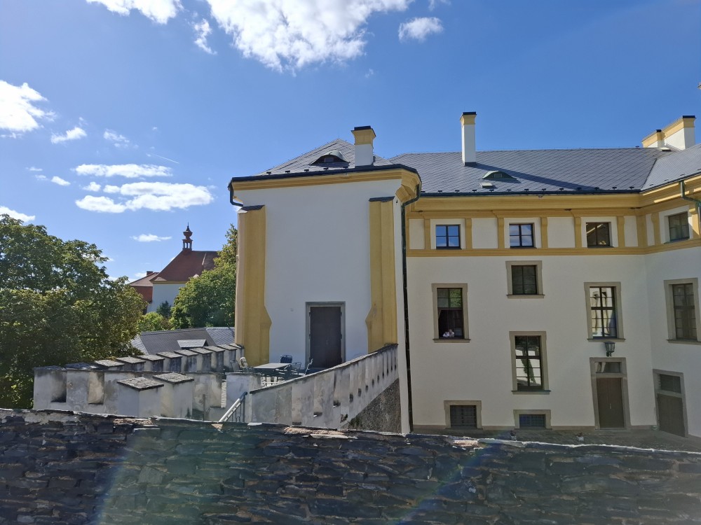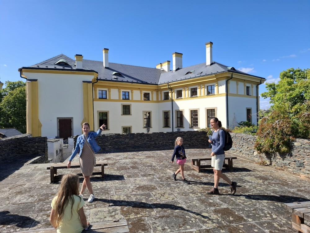 Procházíme jednotlivé komnaty, ze kterých jsou nyní hlavně apartmány pro ubytované svatebčany. Svatby se na zámku dělají často, přímo na zámku může přespat 30 lidí. Zámek tedy není úplně původní, ale prohlídka je i přesto zajímavá. Ze zámku jdeme na výhledovou terasu a pak ještě přes přilehlý hrad.