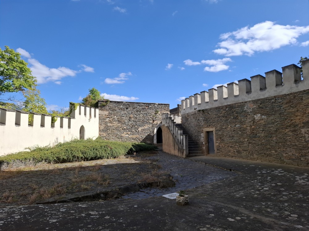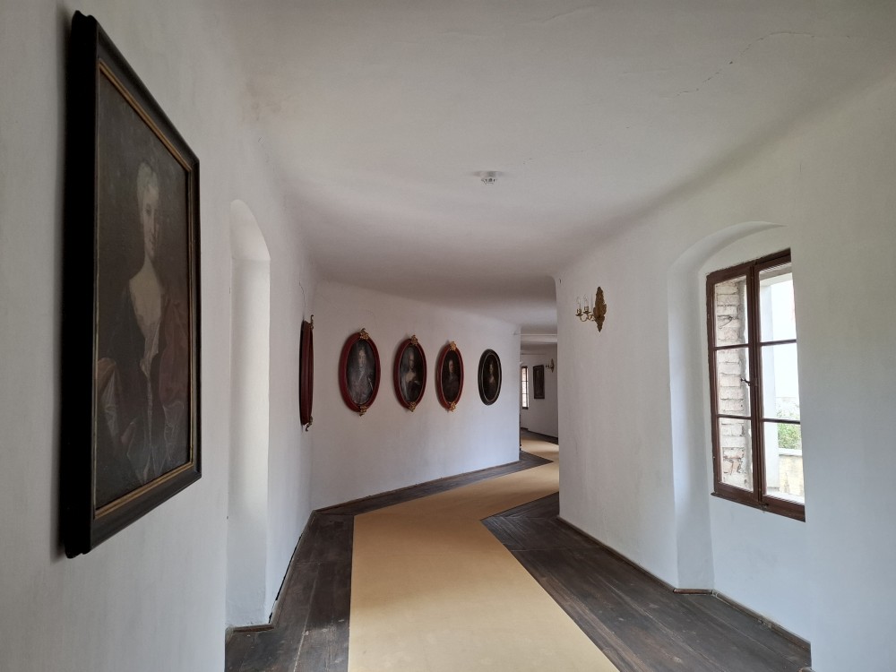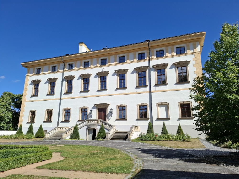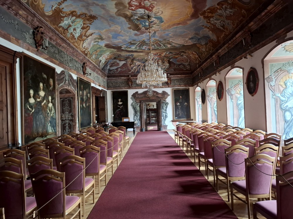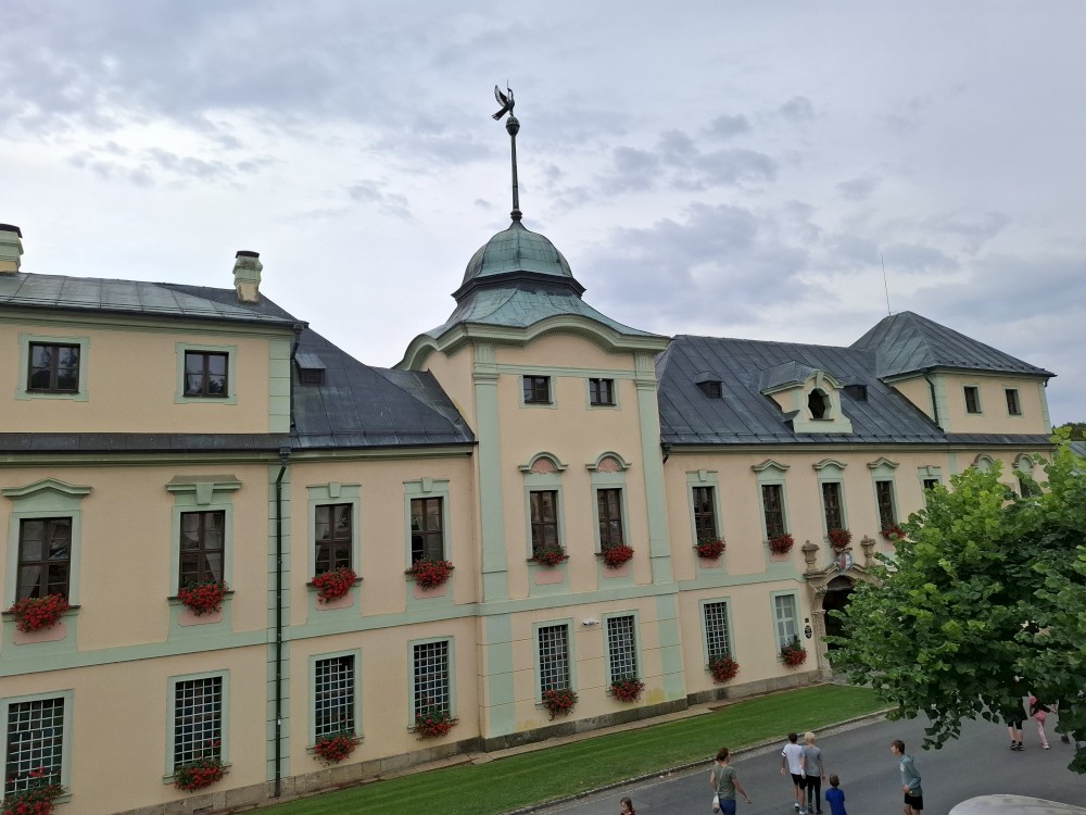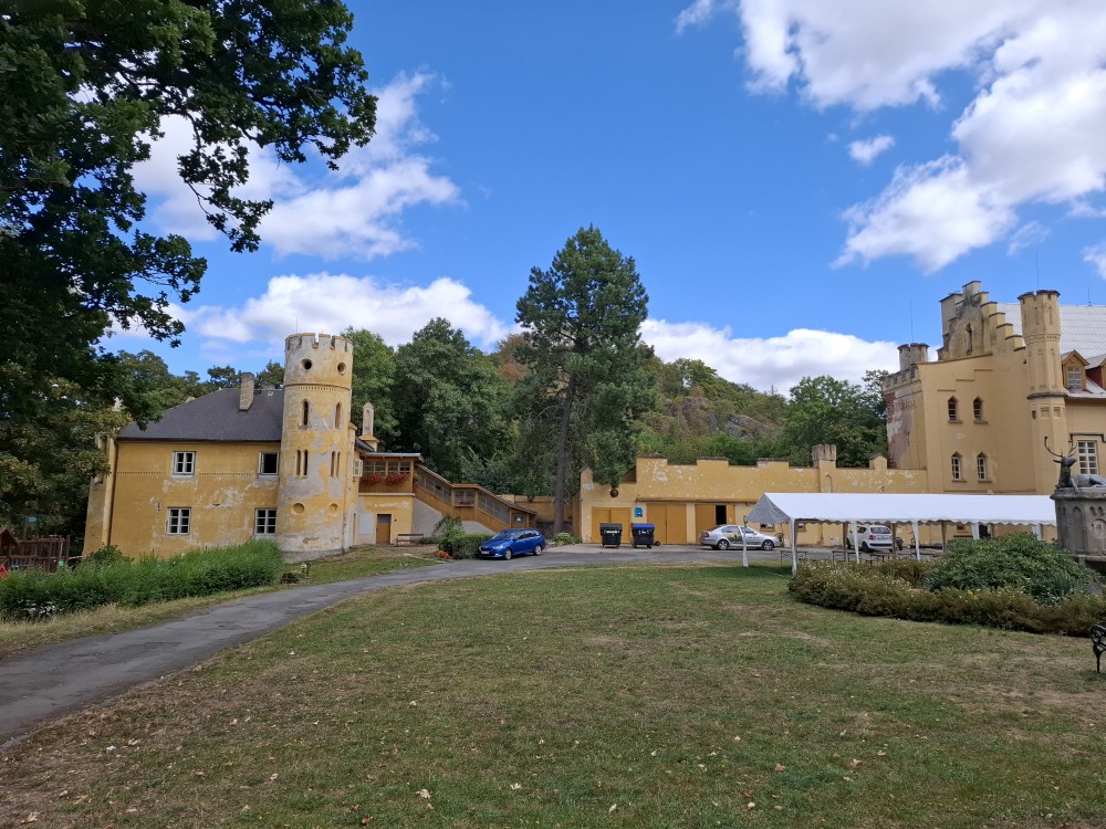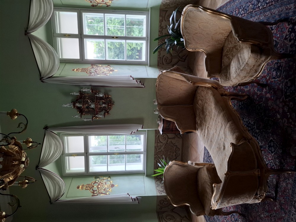 Procházíme jednotlivé komnaty, ze kterých jsou nyní hlavně apartmány pro ubytované svatebčany. Svatby se na zámku dělají často, přímo na zámku může přespat 30 lidí. Zámek tedy není úplně původní, ale prohlídka je i přesto zajímavá. Ze zámku jdeme na výhledovou terasu a pak ještě přes přilehlý hrad.