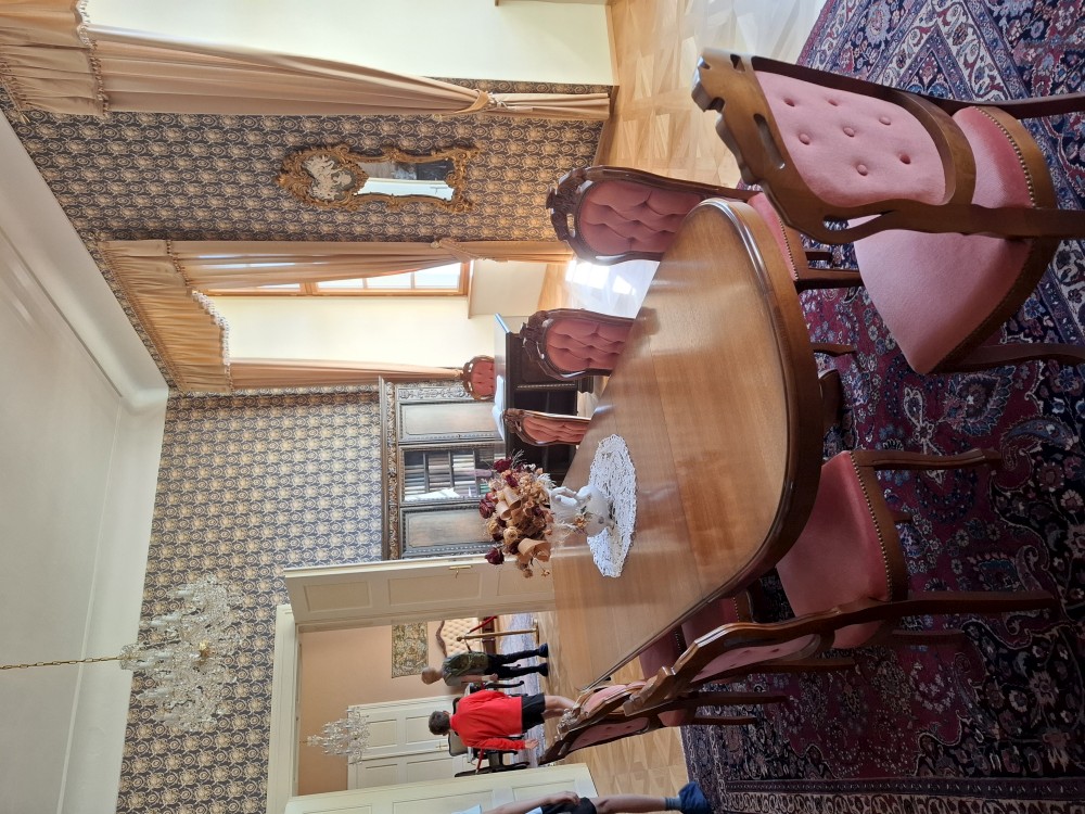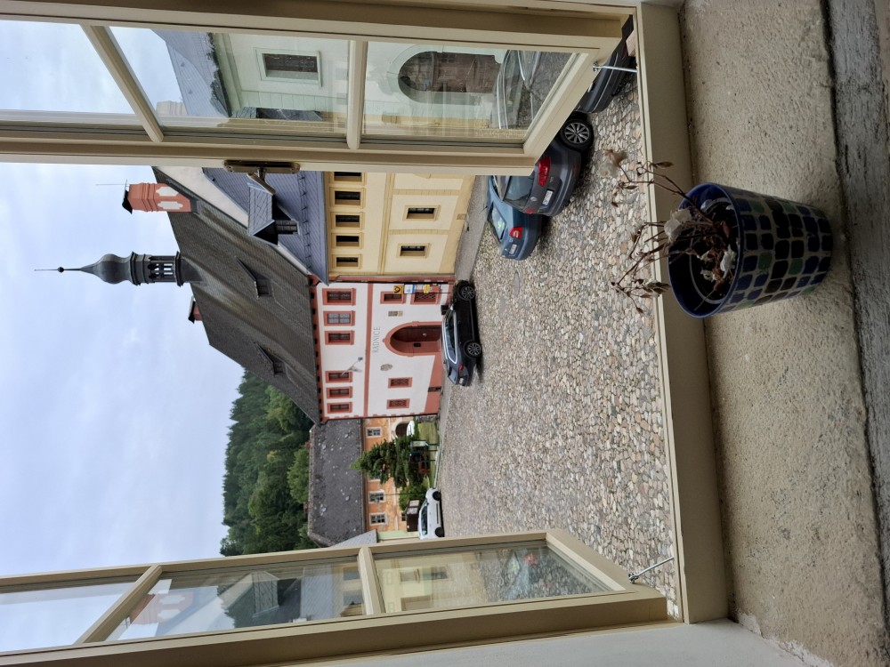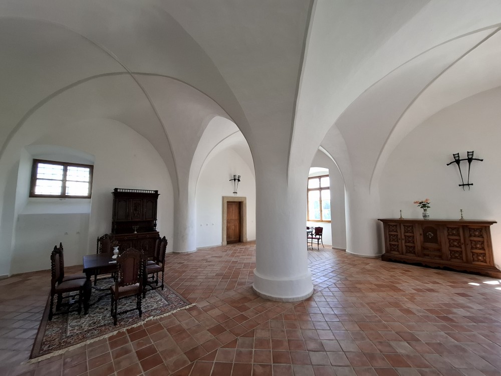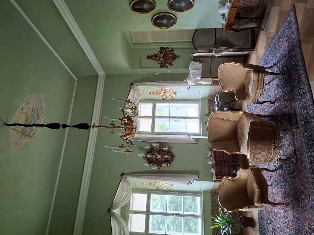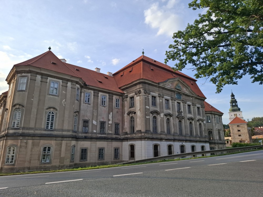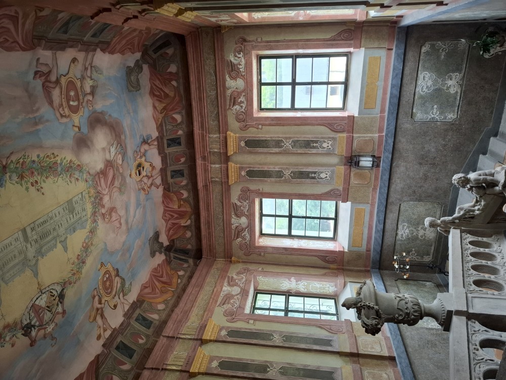 Procházíme jednotlivé komnaty, ze kterých jsou nyní hlavně apartmány pro ubytované svatebčany. Svatby se na zámku dělají často, přímo na zámku může přespat 30 lidí. Zámek tedy není úplně původní, ale prohlídka je i přesto zajímavá. Ze zámku jdeme na výhledovou terasu a pak ještě přes přilehlý hrad.