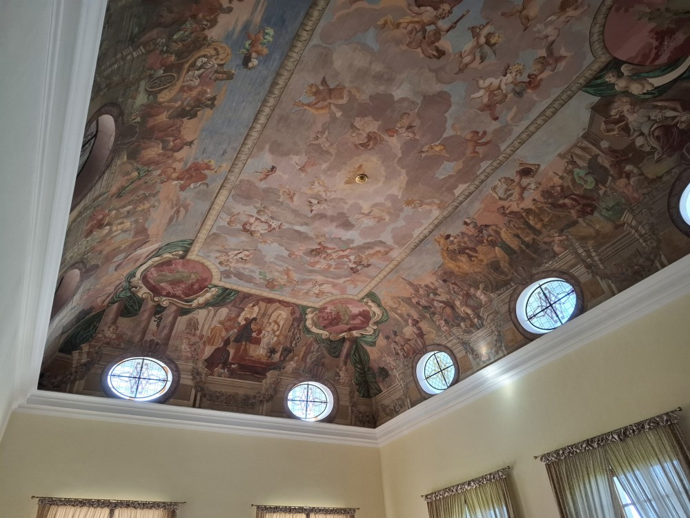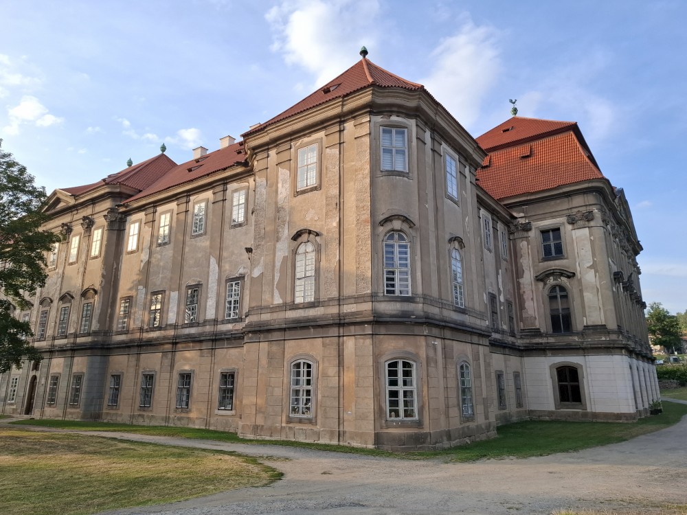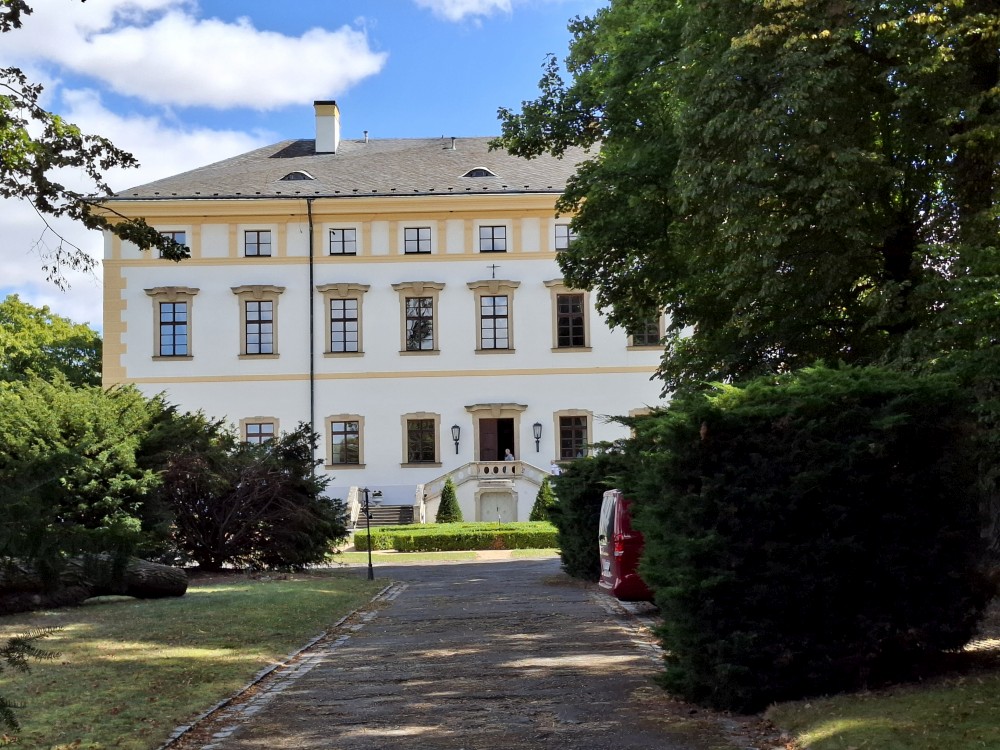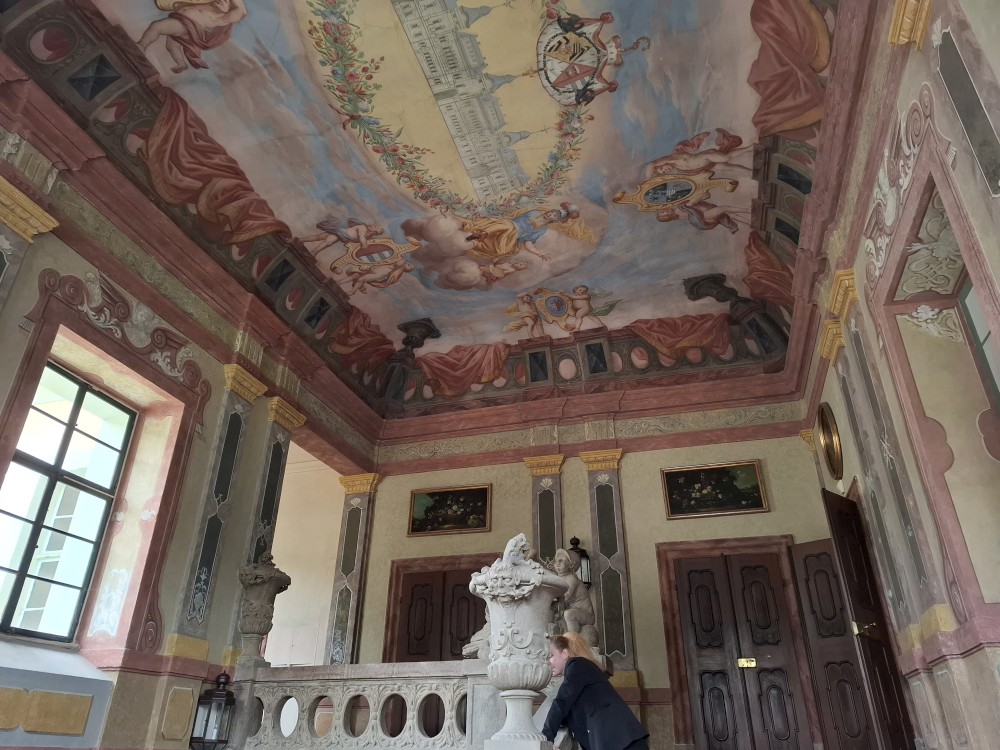 Pak už jdeme na prohlídku soukromého zámku. Zámek prý koupila rodina z Plzně a postupně ho renovuje. Na zámku se nedochovalo téměř nic původního, jeden fresky na stropu velkého sálu. Na zámku dost řádili komunisti, fresky se zachovali jen kvůli tomu, že je zakrýval ještě jeden strop.