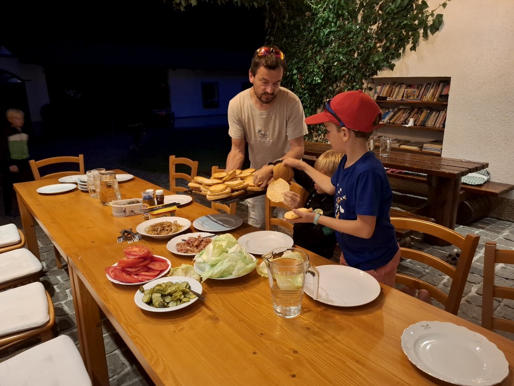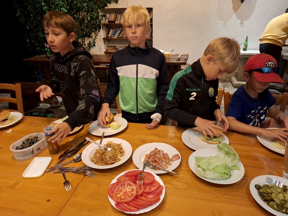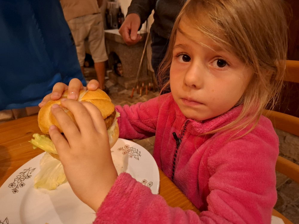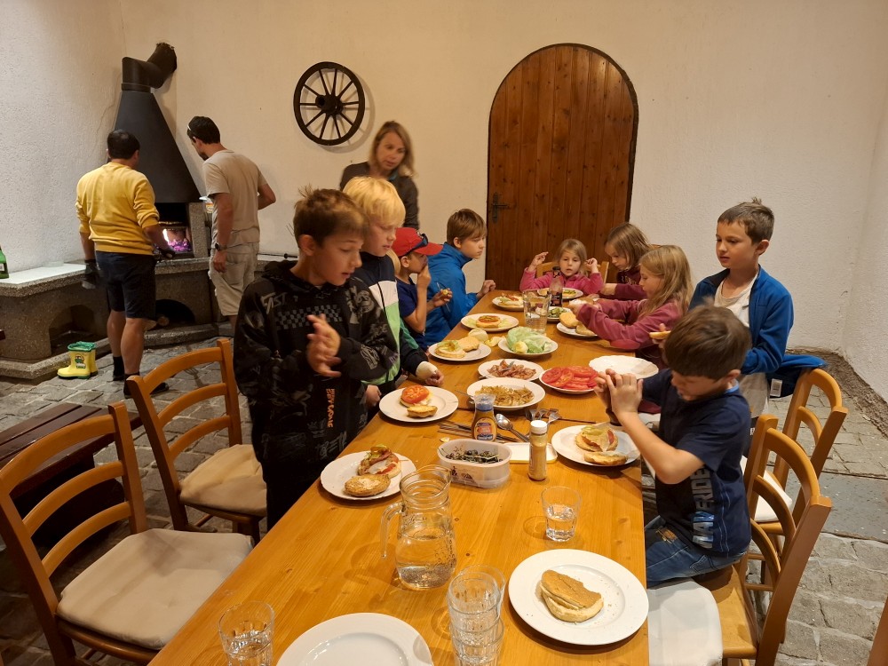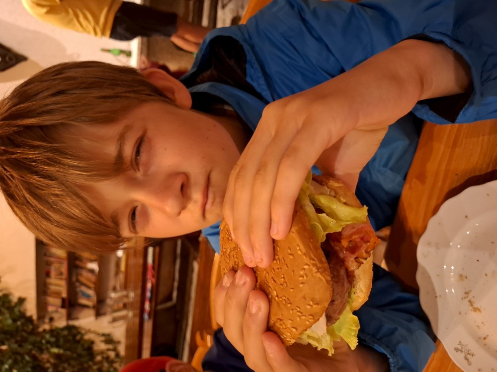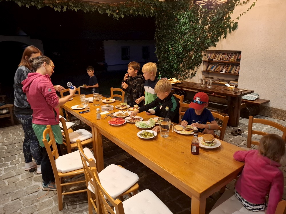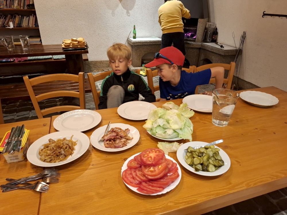 Pak už jdeme k autům a jedeme do mlýna. Tak se potkáváme s Terkou a Fanym. Naopak Petr s Vašíkem už odjeli. Terka přivezla ingredience na burgry, takže pečeme housky, maso, krájíme zeleninu a děti si sestavují burgy. Moc se to povedlo, byla to super hostina. Bětuška i burgrem povolila zub, který jí následně Johanka nešťastným úderem do Bětušky pusinky vyrazila. Je to velká událost, Bětušky první vypadlý zub, asi dorazí zoubková víla.