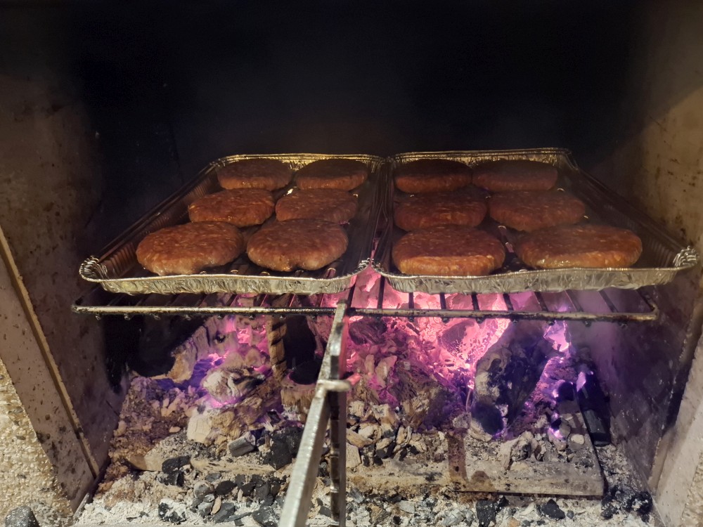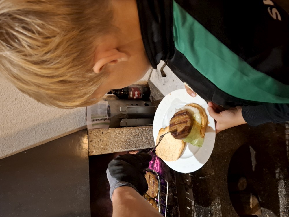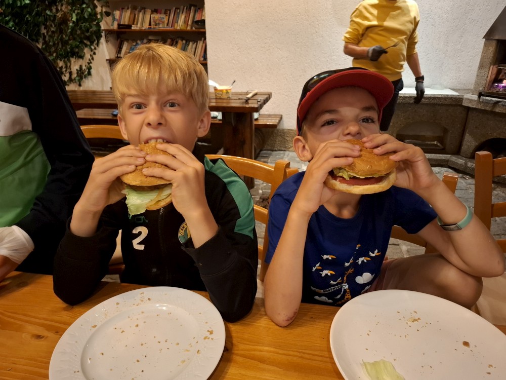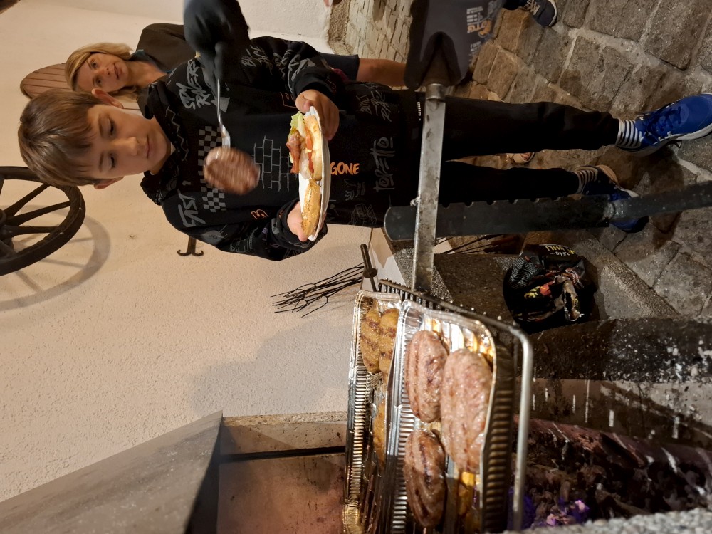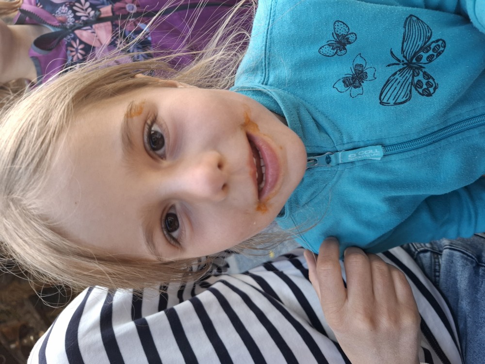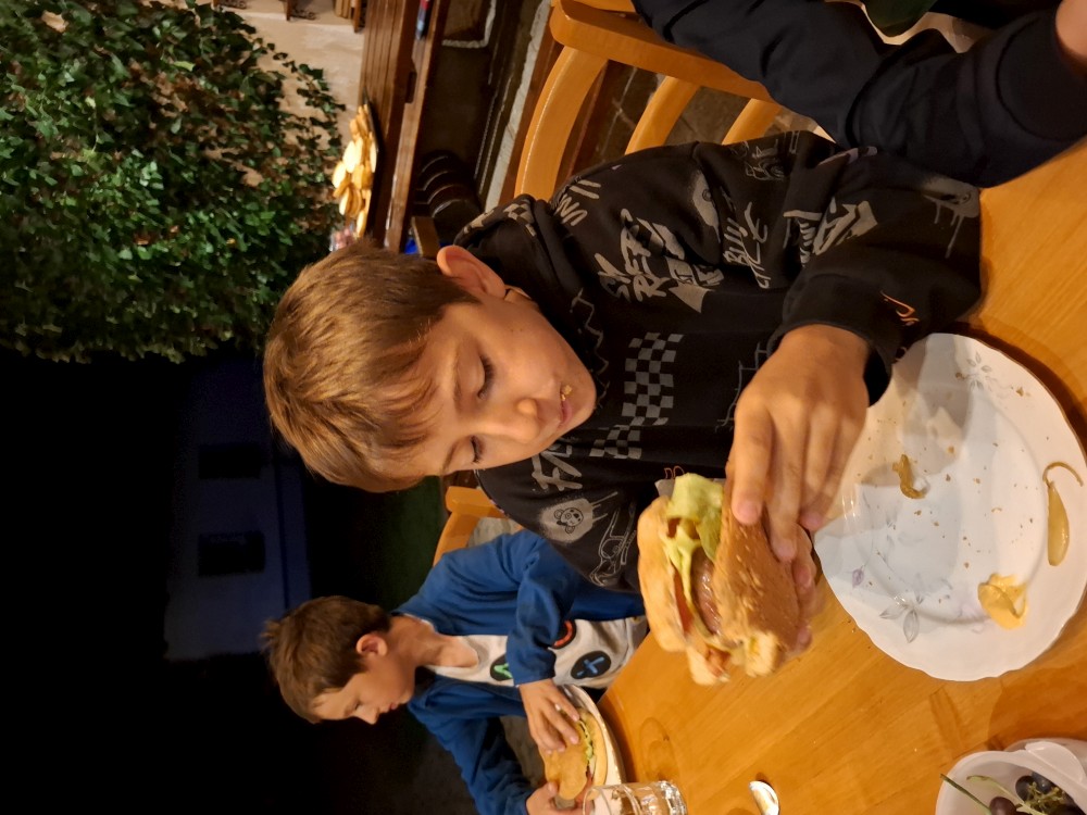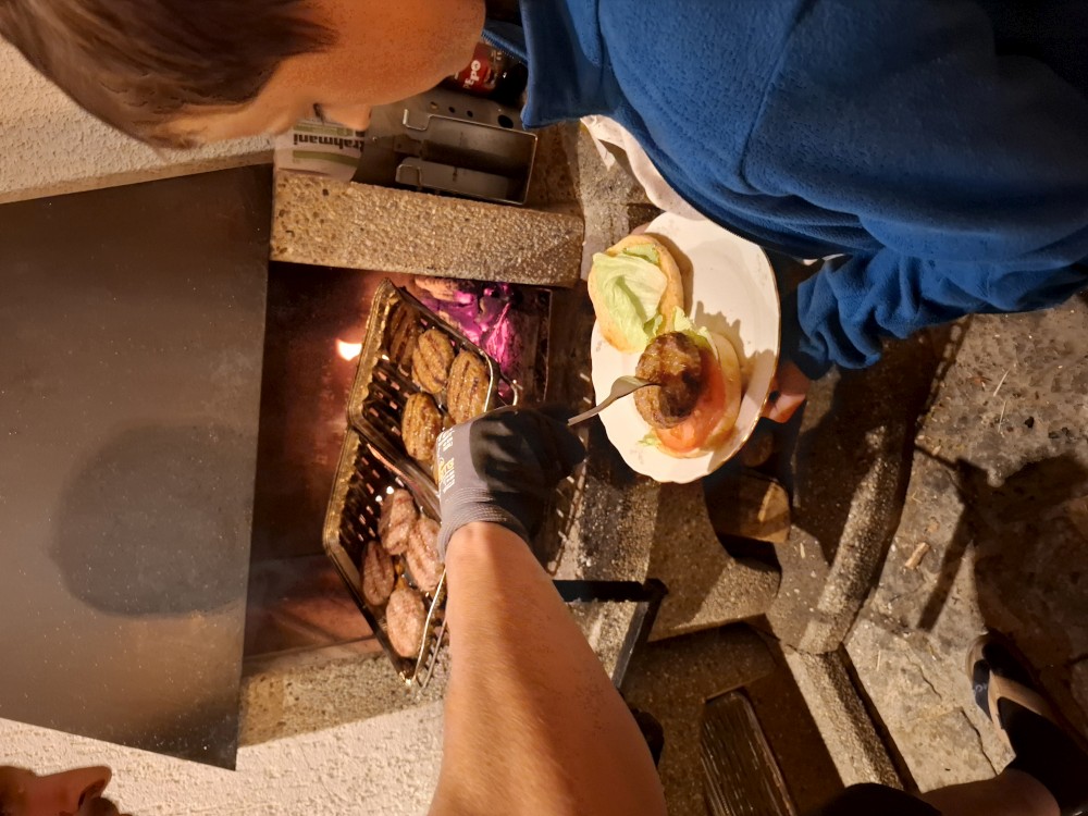 Pak už jdeme k autům a jedeme do mlýna. Tak se potkáváme s Terkou a Fanym. Naopak Petr s Vašíkem už odjeli. Terka přivezla ingredience na burgry, takže pečeme housky, maso, krájíme zeleninu a děti si sestavují burgy. Moc se to povedlo, byla to super hostina. Bětuška i burgrem povolila zub, který jí následně Johanka nešťastným úderem do Bětušky pusinky vyrazila. Je to velká událost, Bětušky první vypadlý zub, asi dorazí zoubková víla.