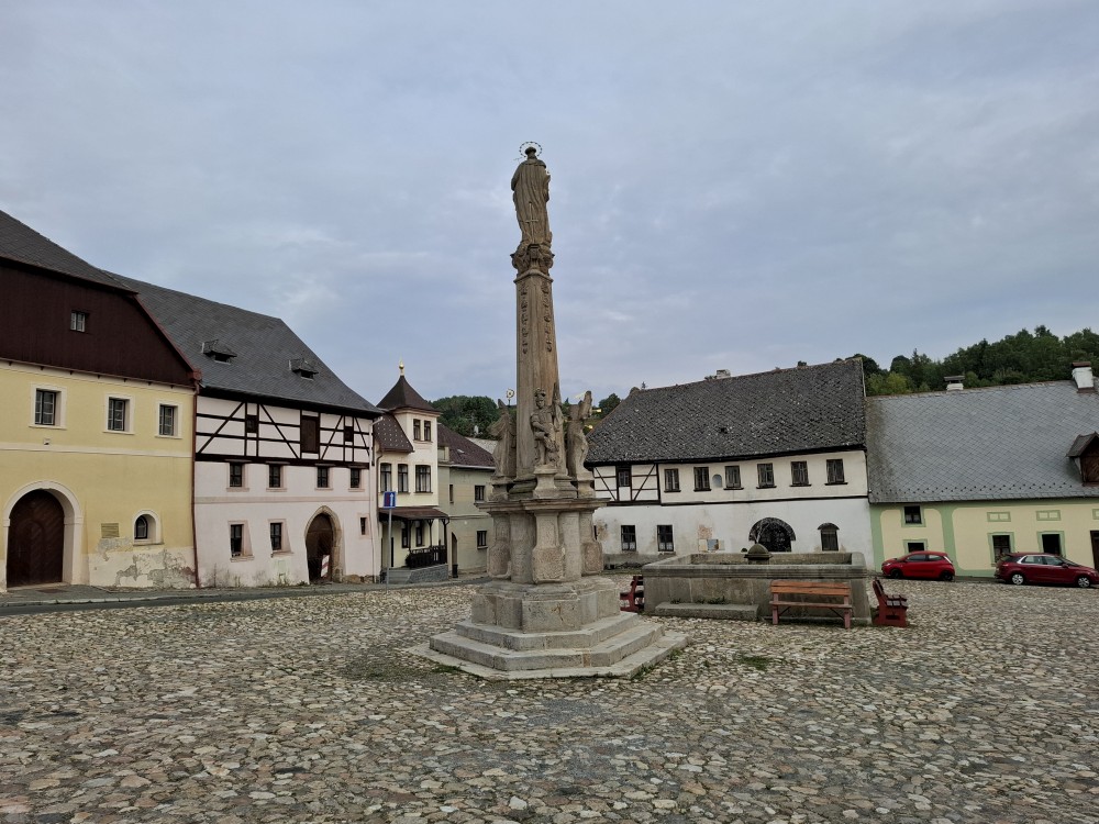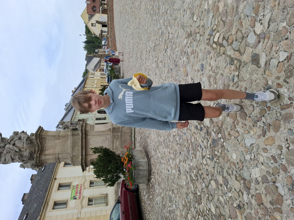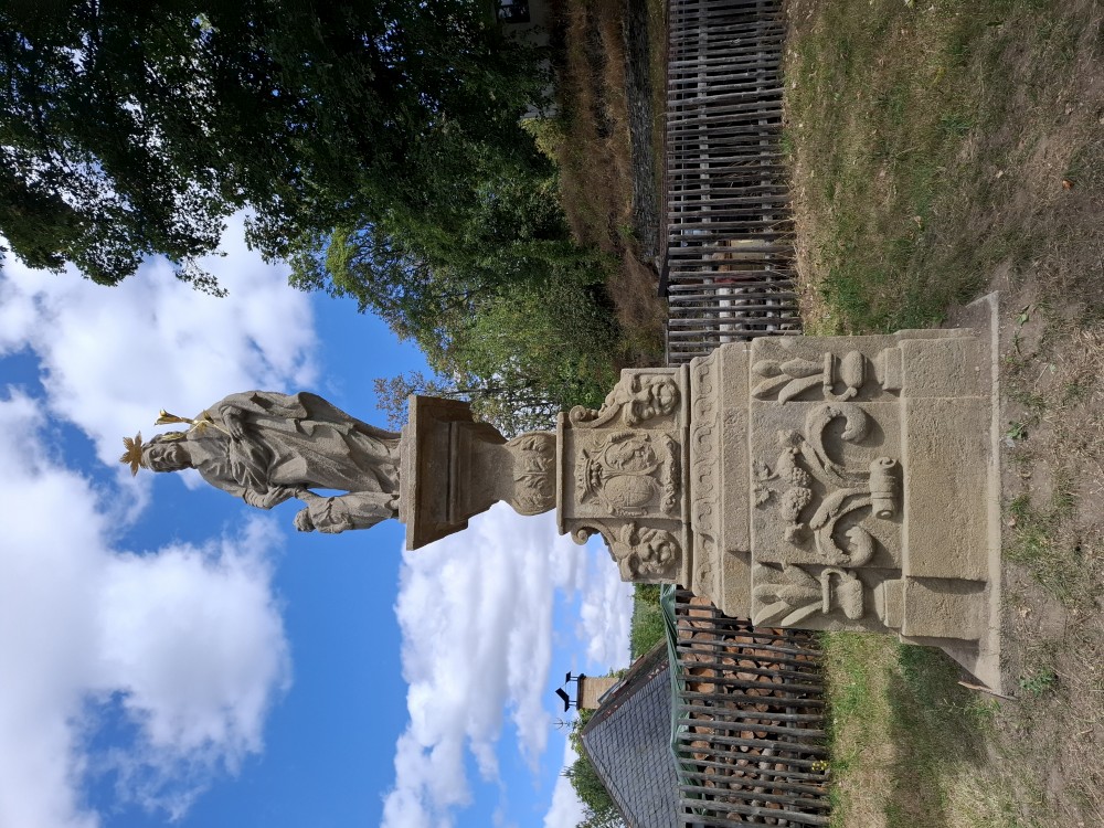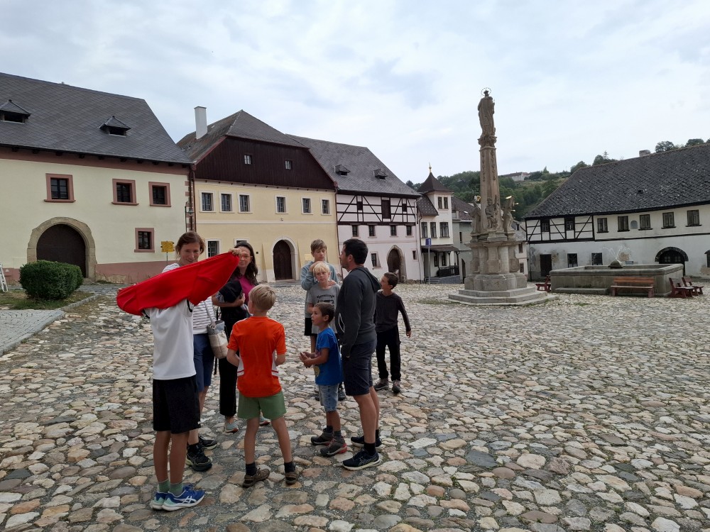 Dnes se jede na výlet do Rabštejna nad Střelou. Jedeme přes Nečtiny, tak se s Janou zastavujeme u místního zámku, kde měla Jana za studií různé praxe. Pak ještě cestou do Rabštejna projíždíme přes Stvolny, kde si v samoobslužném krámku kupujeme 5l kanystr jablečného moštu (220 Kč). Pak už se s ostatními potkámáme na parkovišti v Rabštejně. Máme sraz u sochy Kristus přítel dítek.