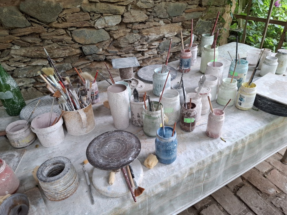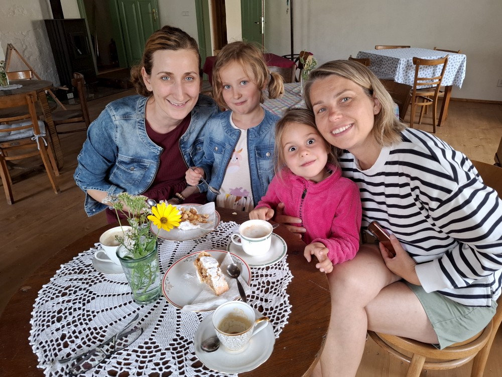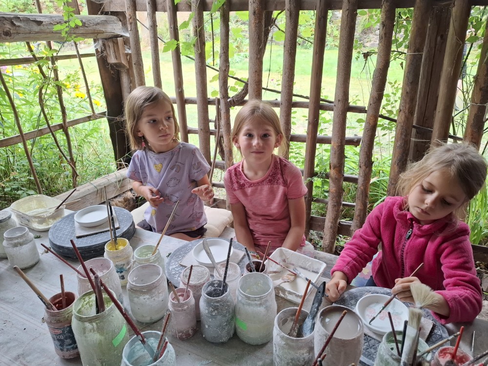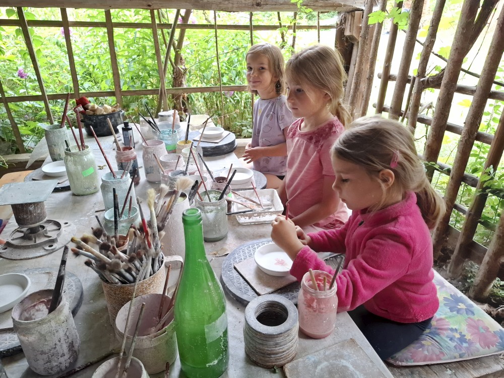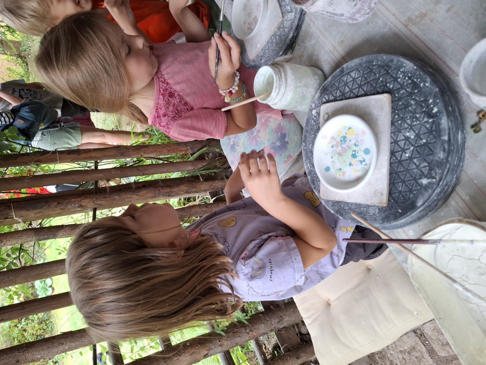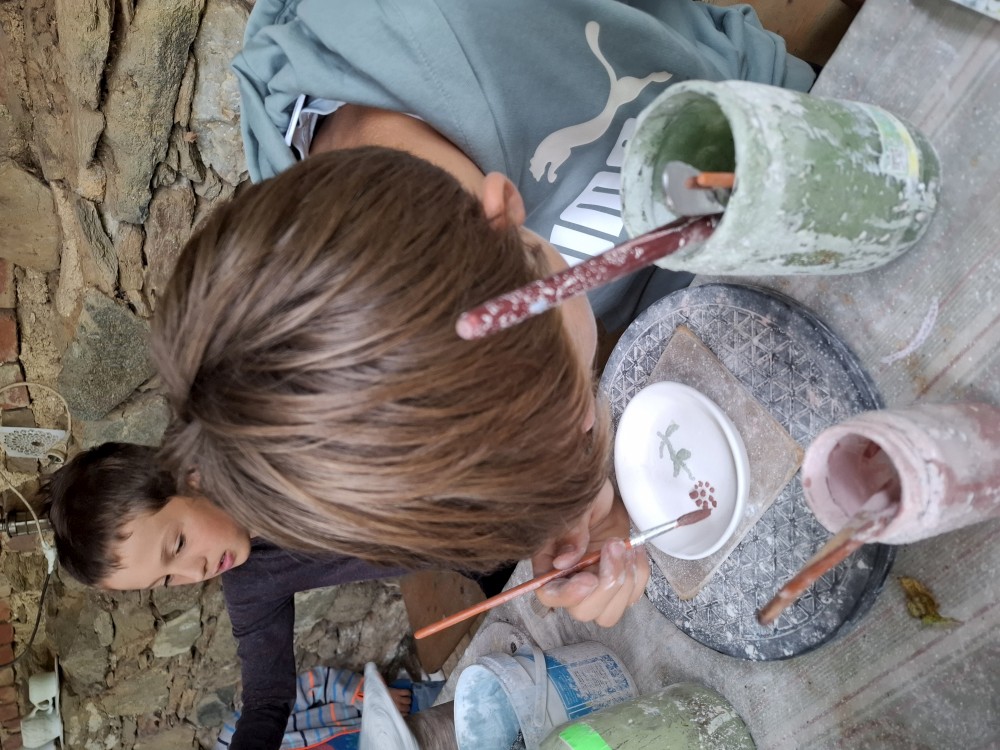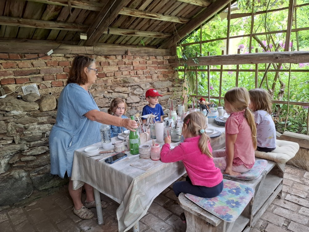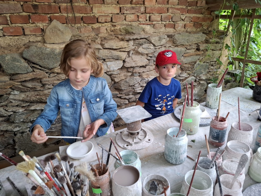 Pak už spěcháme do Olešovic vedle Úterý, kde máme na 16 hodinu domluvenu keramickou dílnu pro děti. Čekáme v útupné zahradě. Děti postupně barví mističky. Pak se postupně přesouváme do Úterý, kde je v Turbovně moc příjemná kavárna. Dáváme si kávu a pak i pivo. Děti hrají kulečník. Připojuje s k nám Jaruška.