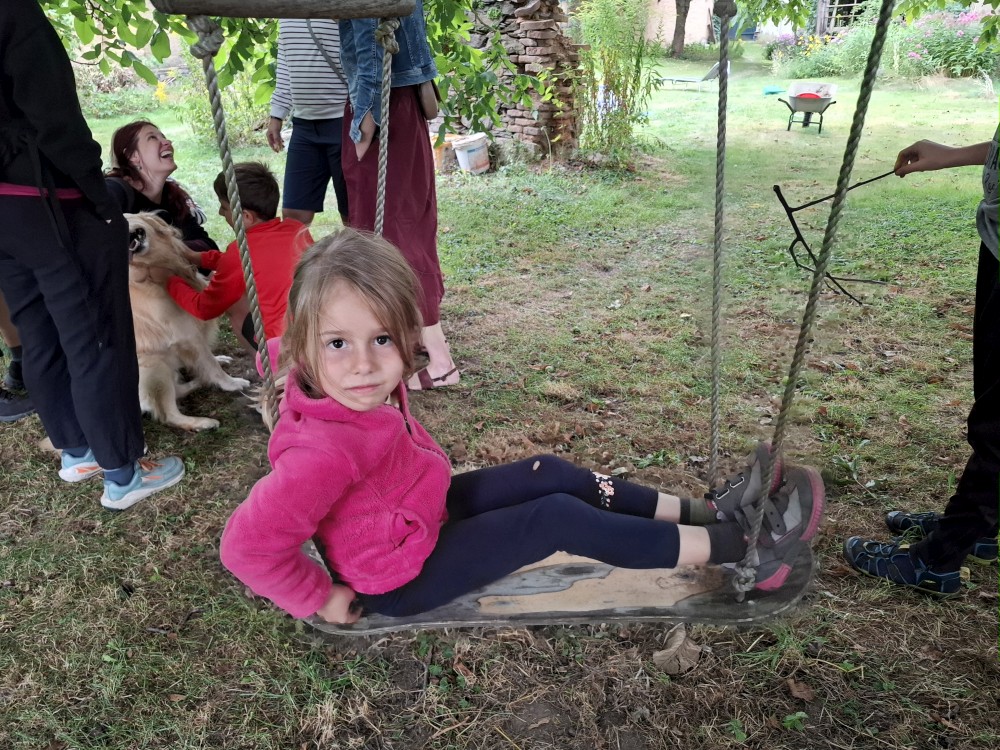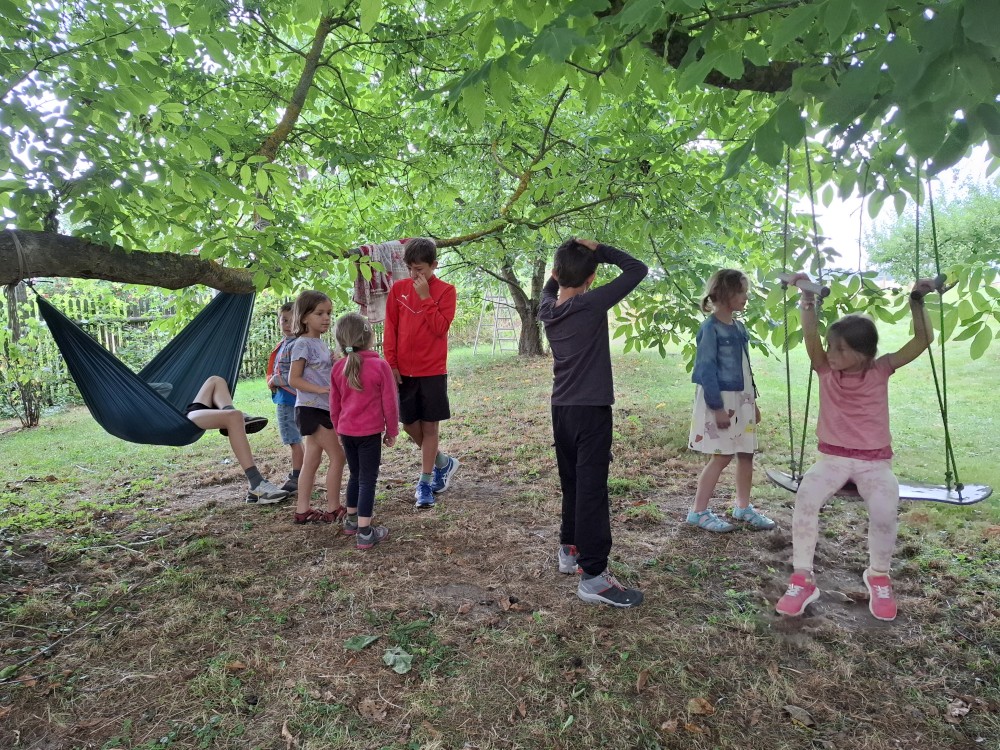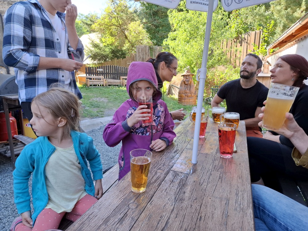 Sedíma na terásce hospody a je tu příjemně. Děti si hrají na houpačkách, pískovišti apod. Postupně odjíždíme zpět na chalupu. Já jedu skoro poslední s Honzou a třeba holčičkama, Bětuškou, Živuškou a Johankou. Za námi už jedou jen Pavla s Irčou, které se u koupaliště tak zakecali, že je odtud neumíme dostat.