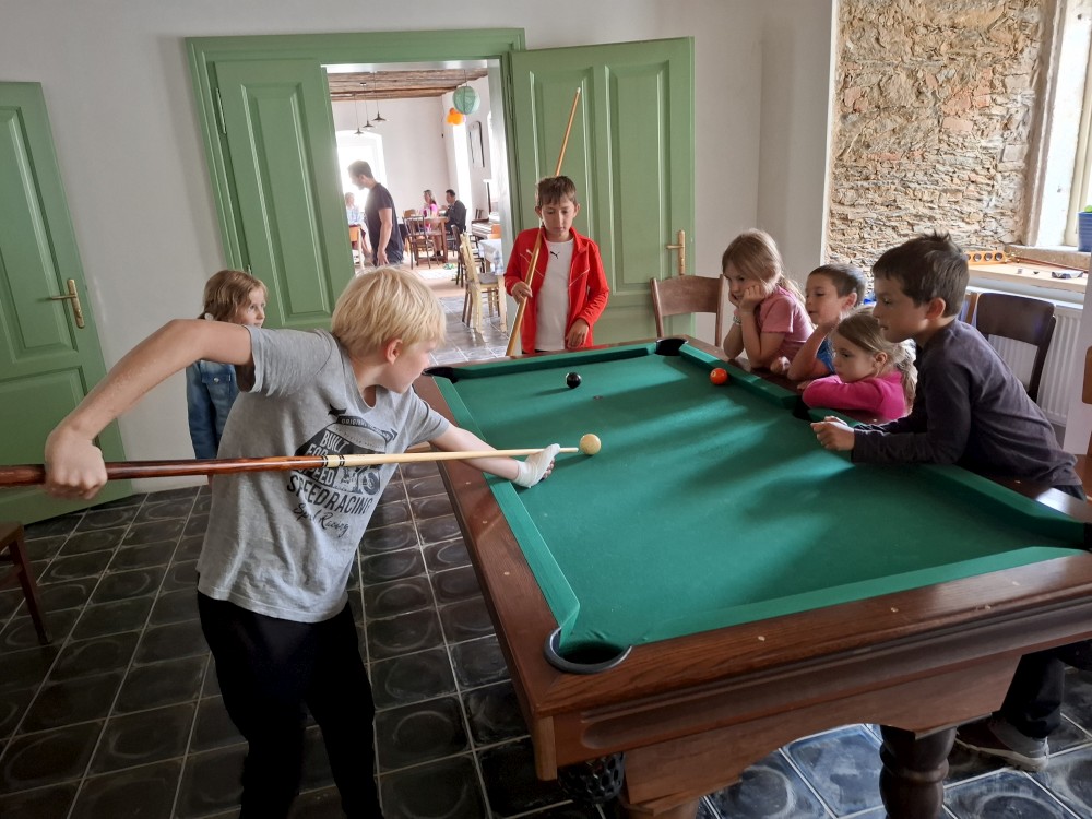 Večer si děti hrají na loďkách, staví přístav, pak mají zase promítání a my povídání u piva, vína.