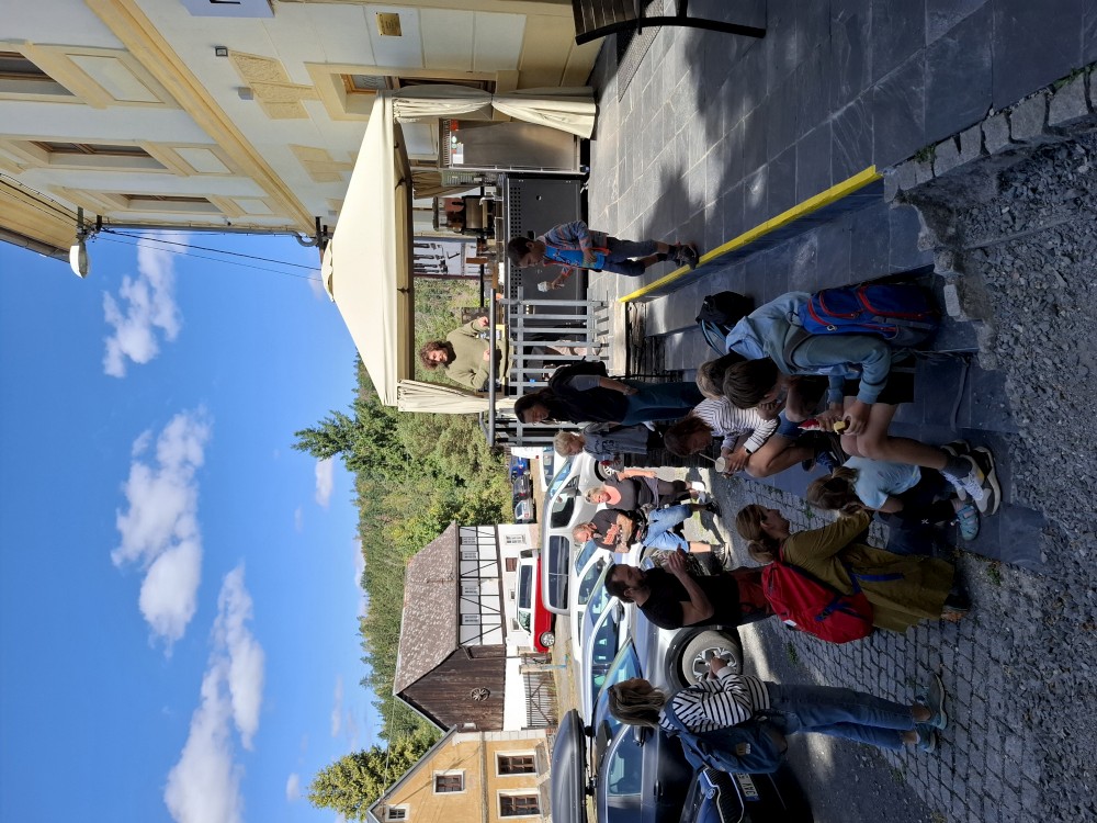 Když jsme všichni, tak se přesouváme o kousek k nedalekým kavárnám. Já mám hlad, tak si kupuji v kavárně Muzea Rabštejn obložený chléb s domácí paštikou. Děti si kupují zmrzlinu. Sedíme chvíli před kavárnou, chvíli na zadní terase kavárny s výhledem na údolí Střely. Pak si ještě dávám kávu v kavárně Četnická stanice.