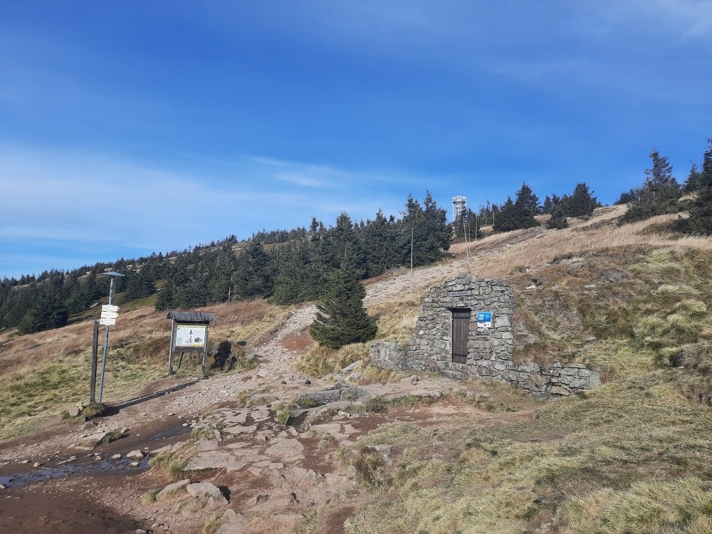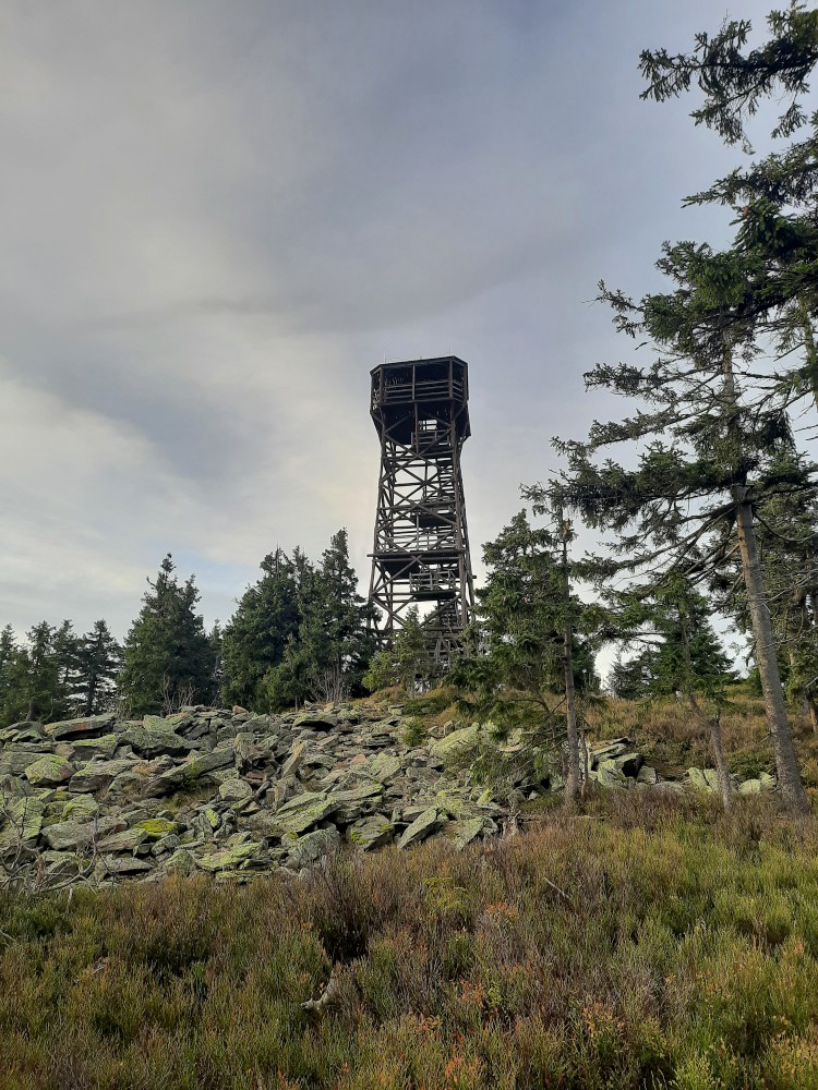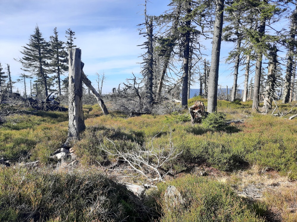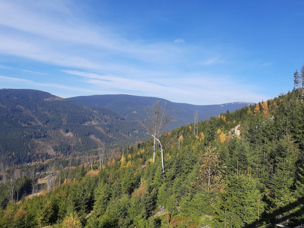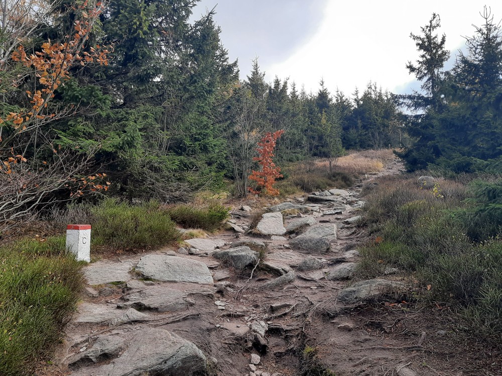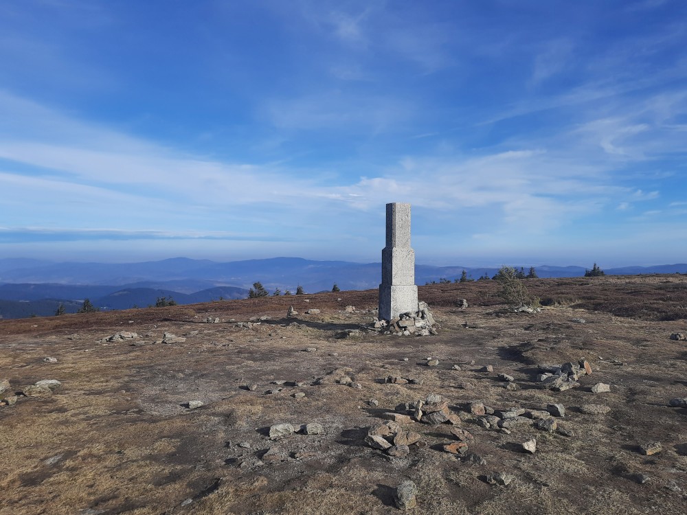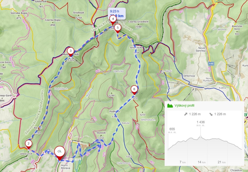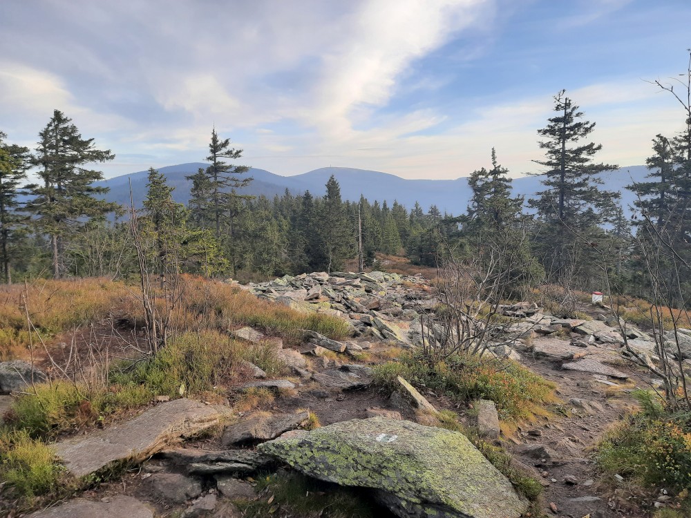 Pak to beru kousek přes Polsko až k červené vedoucí na vrchol Králického Sněžníku. Na vrcholu probíhá stavba Rozhledny a dost tu fouká. Po chvilce strávené na vrcholu klesám k pramenu Vltavy a k soše slůněte. Pak jdu přes Stříbrnické sedlo na vrcholy Stříbrnická, Černá kupa, Smrčina a Podbělka.