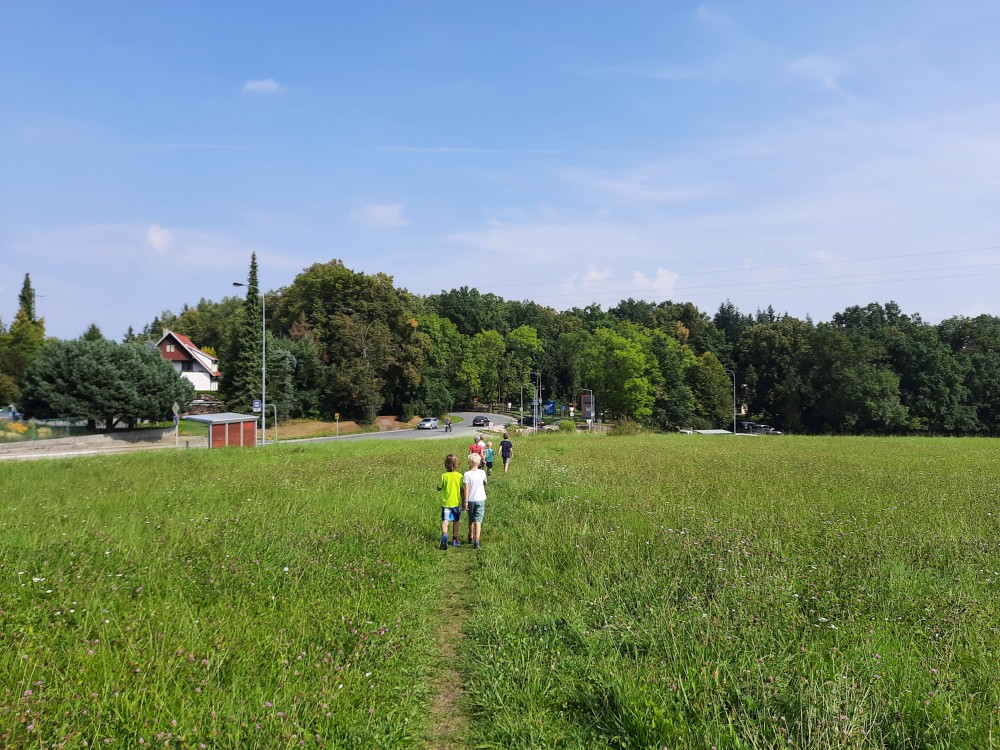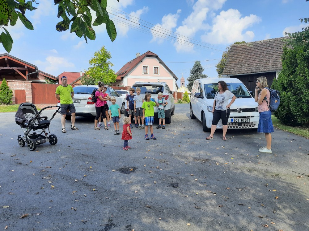 Schyluje se k dešti, vracíme se pomalu na Horky. Zastavujeme se u Pintovky, děti si hrají na hřišti, pak už před deštěm utíkáme domů. Děti zase spí na půdě. V neděli už společně nikam nejdeme. Dopoledne se loučíme, návštěvy odjíždí.