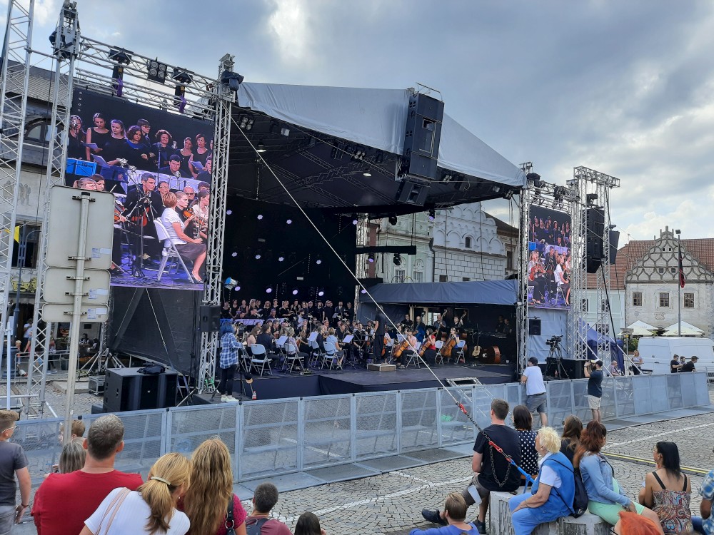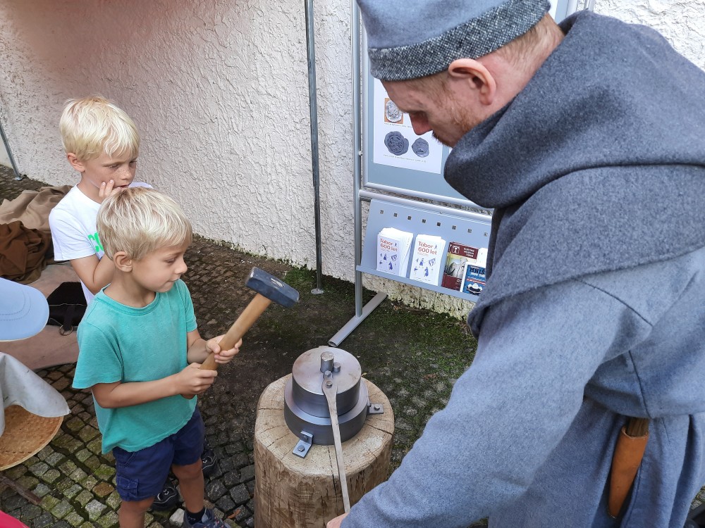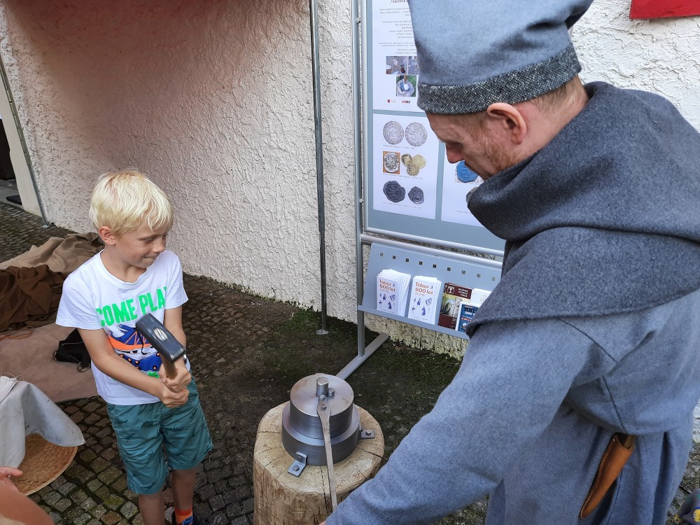 V sobotu jdeme na Táborská setkání. Jdeme pěšky z Horek. Zastavujeme u kotnova. Děti razí mince, koukáme na film o Kotnovu. Dáváme si oběd U Zlatého lva na náměstí. Pak sledujeme koncert Bolehu s orchestrem. Mají nacvičen trošku předělaný husitský chorál a pak také slavné filmové písně.