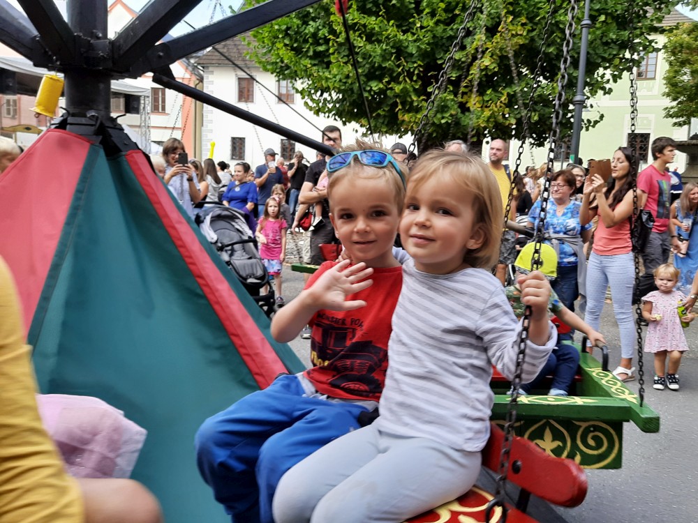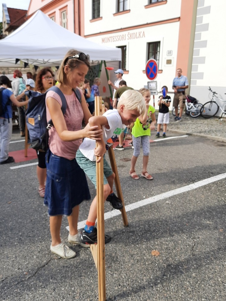 Pak se různě touláme po městě. Na náměstí Mikuláše z Husi si děti zkoušejí chůdy a další atrakce, jdou na kolotoč. Potkáváme se s Jančou Hrdličků s Davidem a klukama. Děti si hrají na sadech na dětském hřišti. Úkoly pro malá práčata jsme už nestihli.