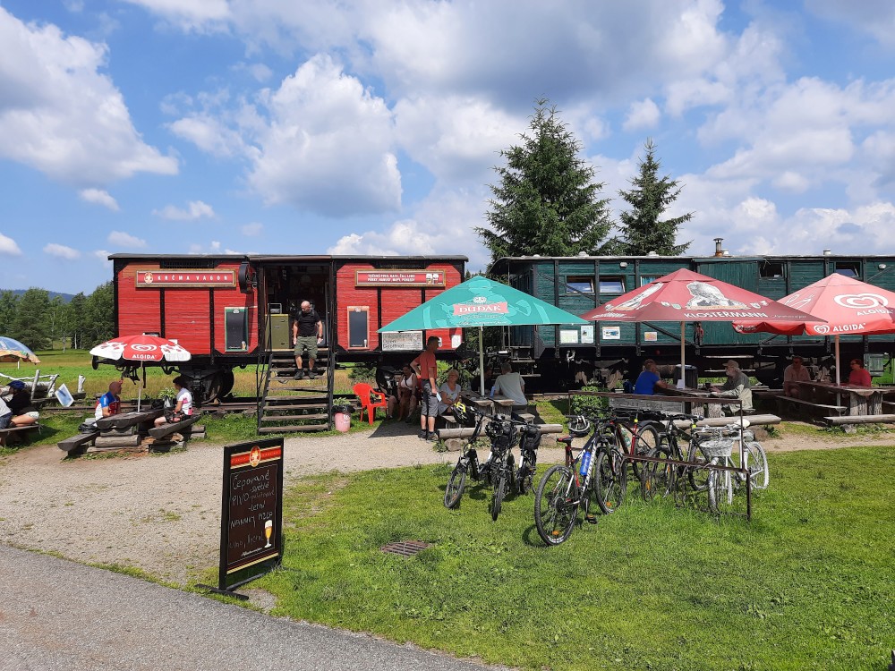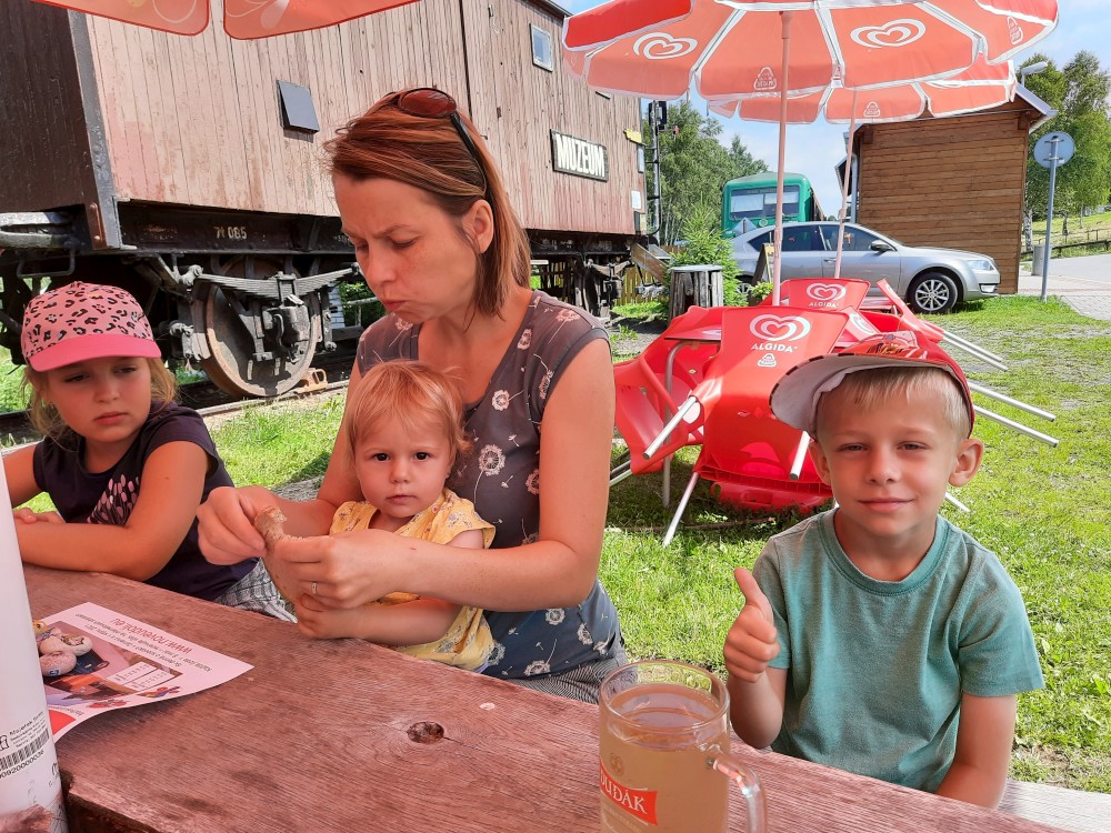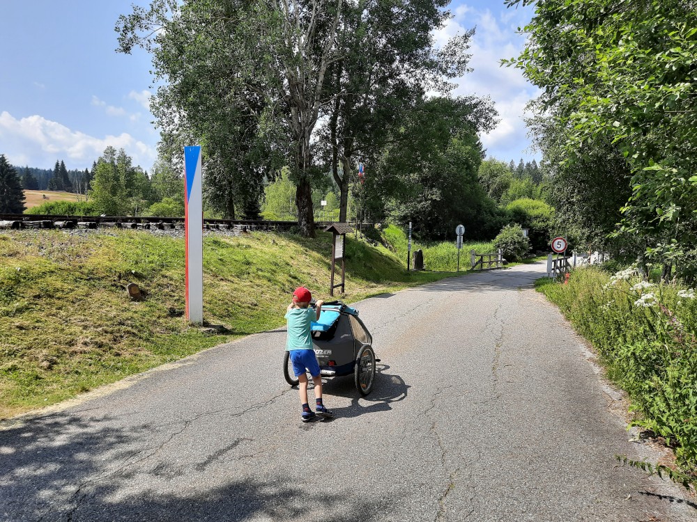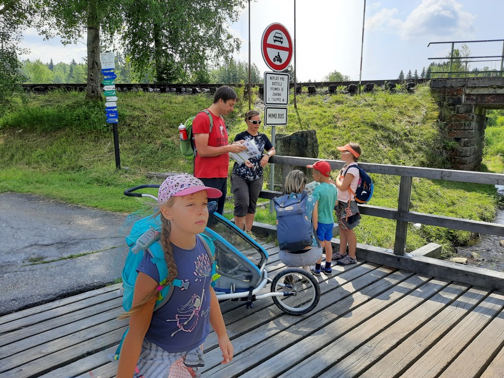 Jedeme na Šumavu. Nejprve v pátek na výlet s Kutnerkama, pak na víkend do Jelenova. Jedeme jen s Martínkem a Bětuškou, Jiřík s Víťou jsou na skautském táboře. S Kutnerkama máme sraz ve Stožci. V íčku nám Katka vyzvedla papíry k dětské naučné stezce. Děti budou cestou plnit různé úkoly. Sedáme na vlak do Nového údolí. Jsme tam kolem poledne, takže se hned zastavujeme v krčmě Vagón.