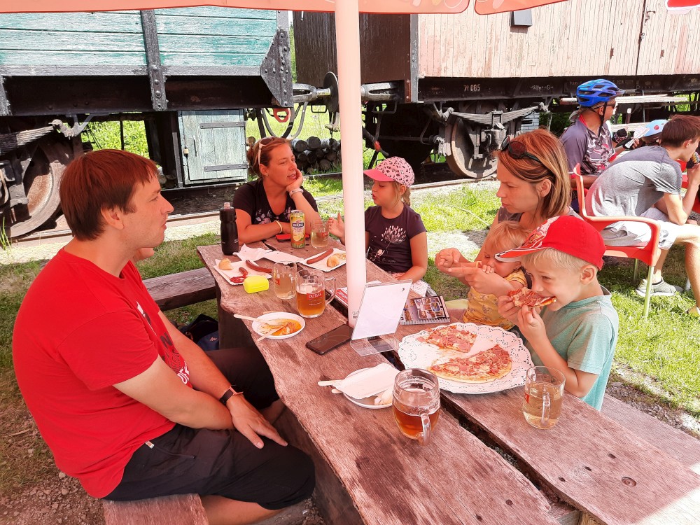 Ve Stožci si dáváme občerstvení u Penzionu u pstruha, kterou provozuje Tomáš Kupsa. Loučíme se s Kutnerkama, sedáme do auta a jedeme do Jelenova.
