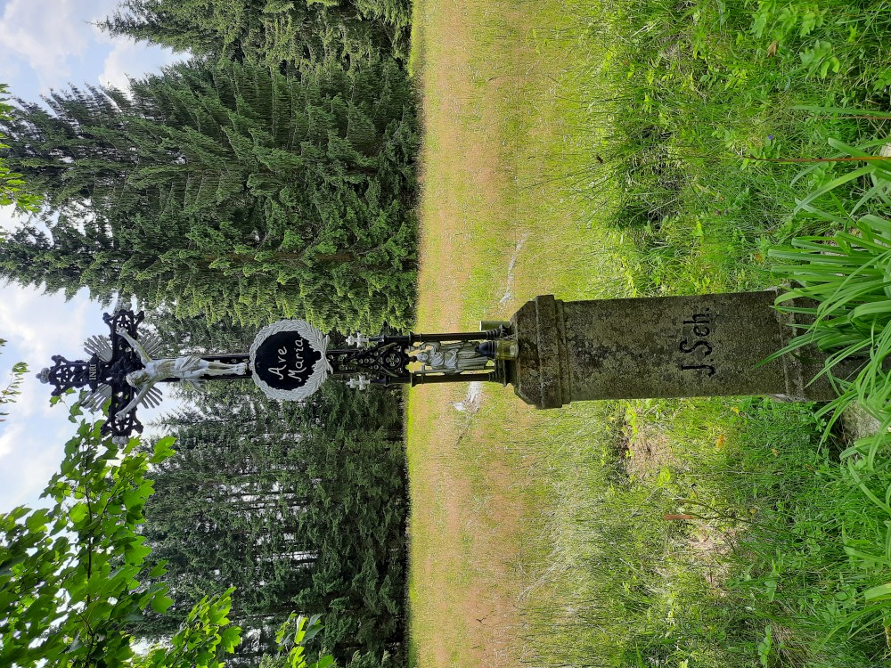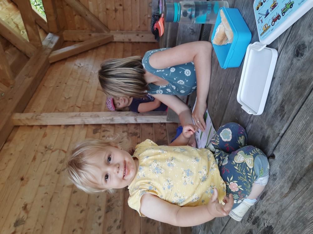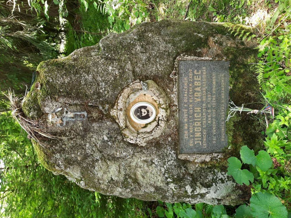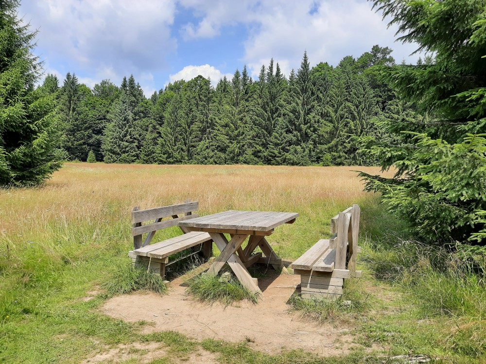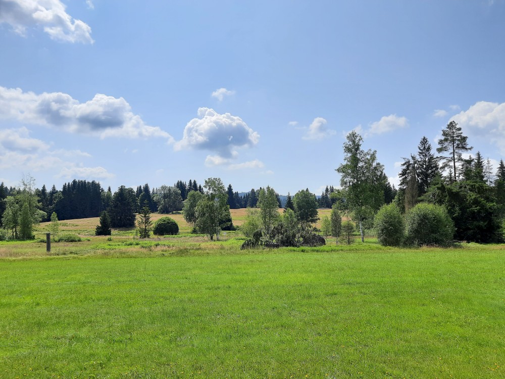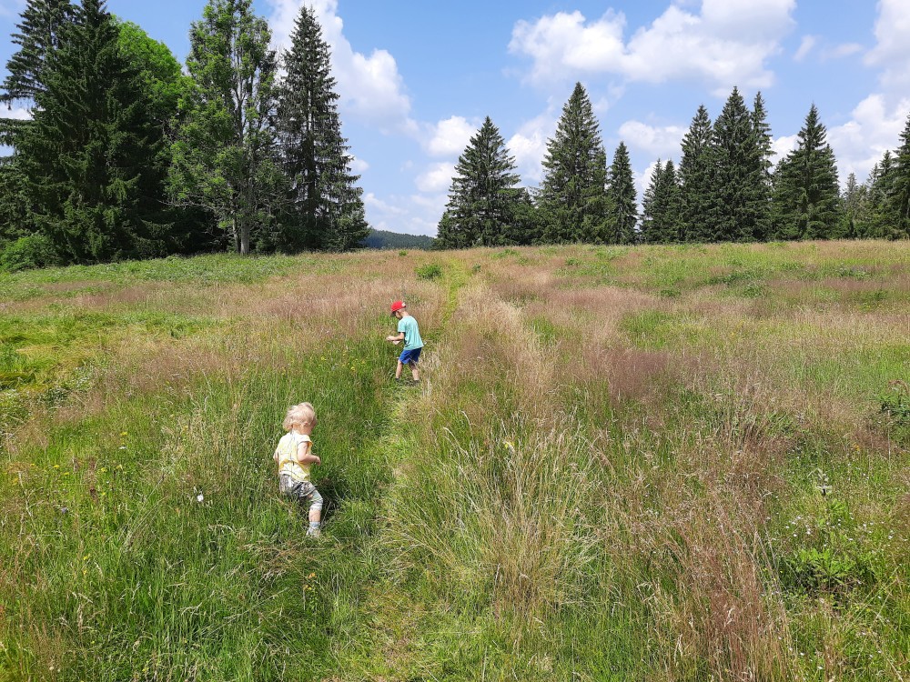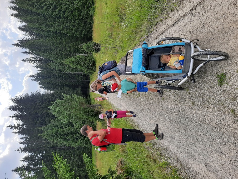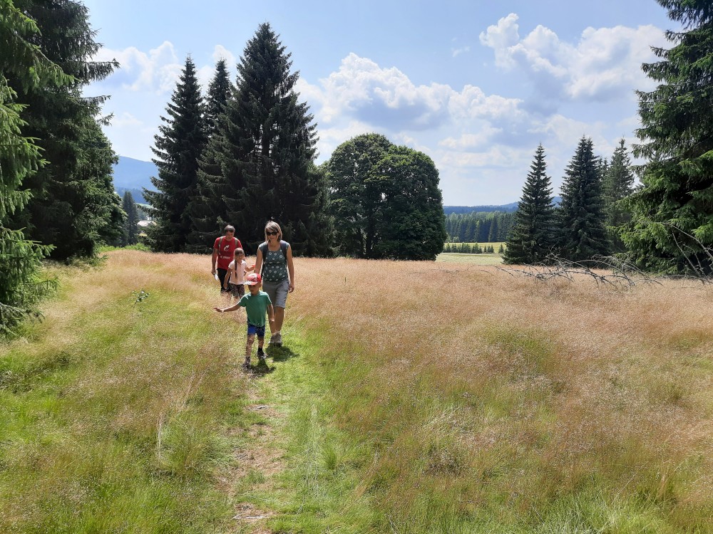 Dáváme si oběd, nakládaný hermelín, děti pizzu. Pak vyrážíme na naučnou stezku. Máme jít po červené, po české straně. Ale omylem jdeme po cestě po červené do Německa. Zjišťujeme to asi po kilometru. Emička s Katkou se vrací, ostatním se nechce. Pokračujeme Německem a přes přechod Spálenec jdeme po žluté na stejnojmenné rozcestí, kde se s Emičkou a Katkou znovu setkáváme.