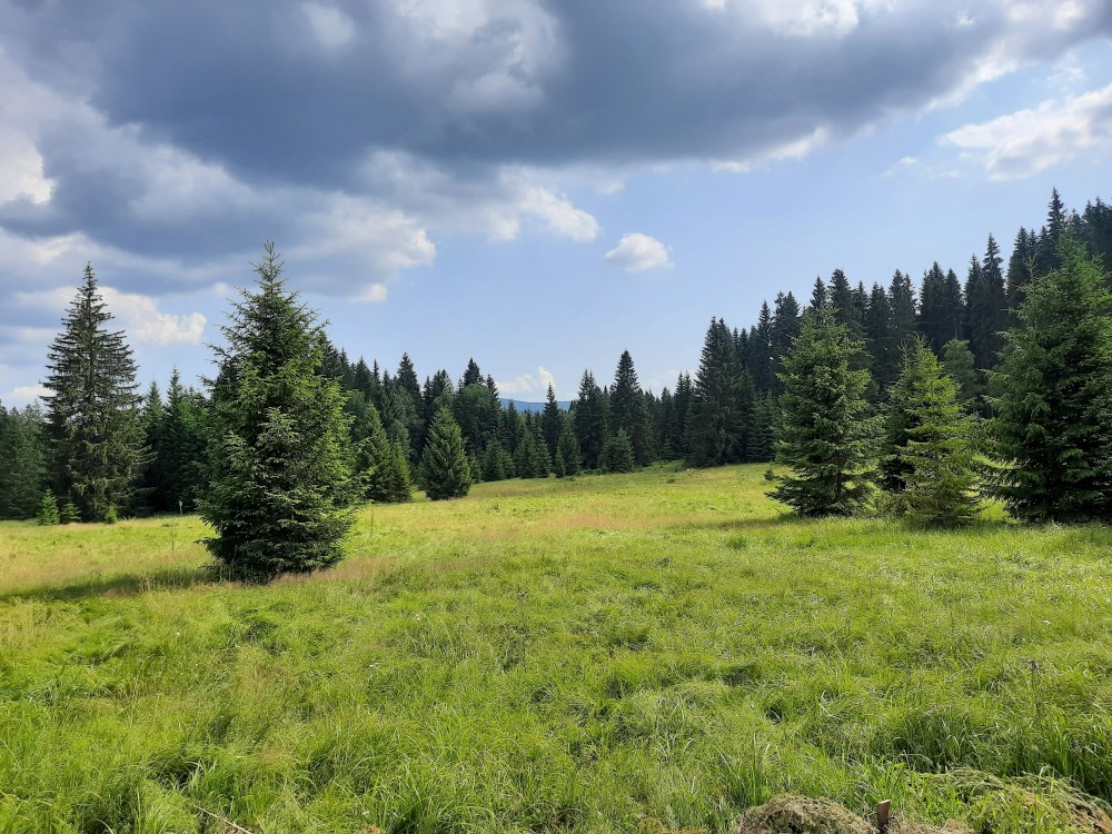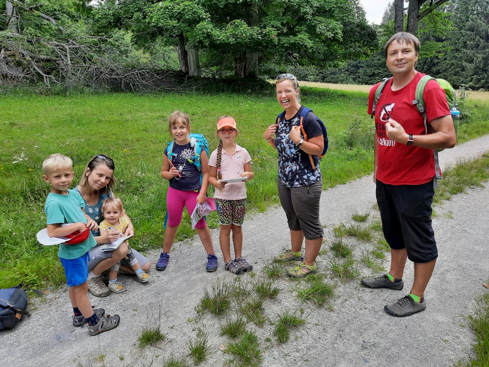 Společně pak jdeme přes rozcestí V Podkově na Krásnou horu. Cestou vidíme zmiji na cestě. Na Krásné hoře si dáváme svačinku v altánku a pokračujeme Hornokrásnohorskou cyklostezkou a následně Kostelní cestou k první zóně NP Spálený luh. Odtud jdeme Dolnokrásnohorkou stezkou do Stožce.